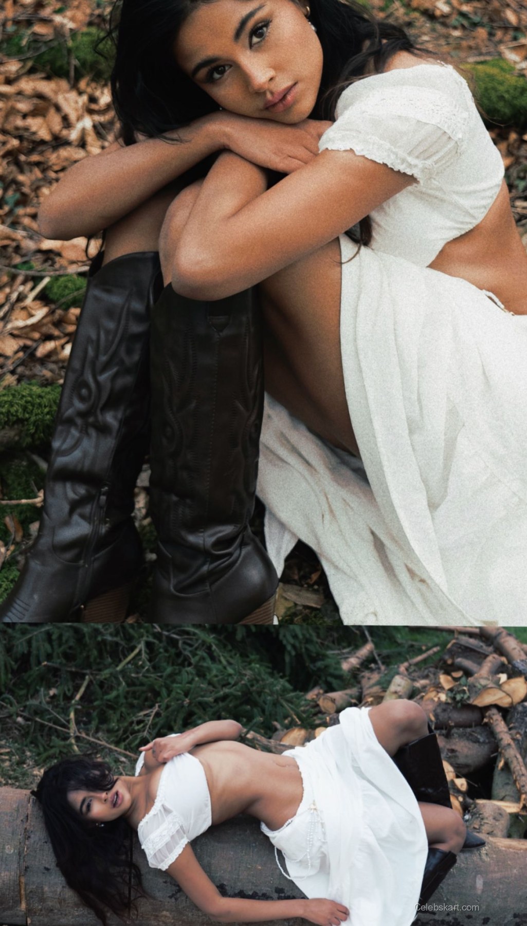 In one moment, Komal is captured leaning against a tree, one hand woven through her hair, creating an effortlessly graceful style. The natural light filters through the trees, giving a soft glow to her features. In another pose, while sitting on a log, the gentle breeze catches her skirt, revealing her chic knee-high boots that provide a stylish contrast to the delicate outfit. These moments embody the essence of her fashion-forward thinking.