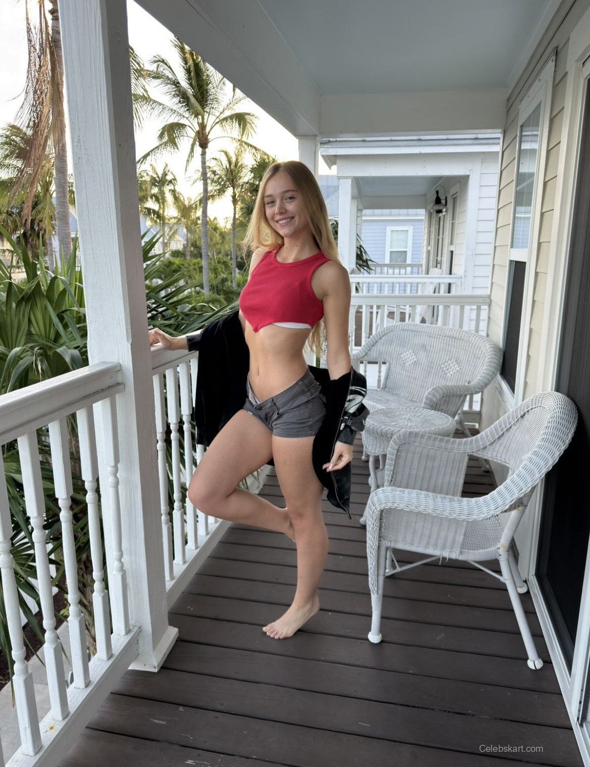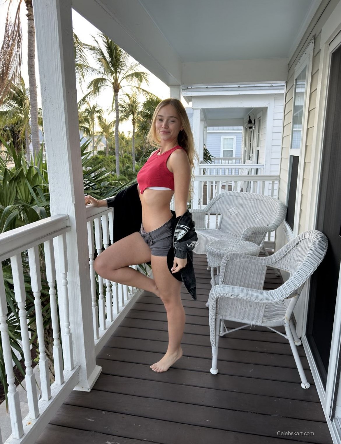 While enjoying her time outdoors, Kyla strikes multiple playful poses, including raising her arms for a playful V-sign and giving a soft smirk while leaning slightly against the balcony railing. The natural light bathes her in a warm glow, perfectly accentuating her beachy blonde hair. The casual setting allows her outfit to shine, with the tropical greenery adding to the cheerful atmosphere.
