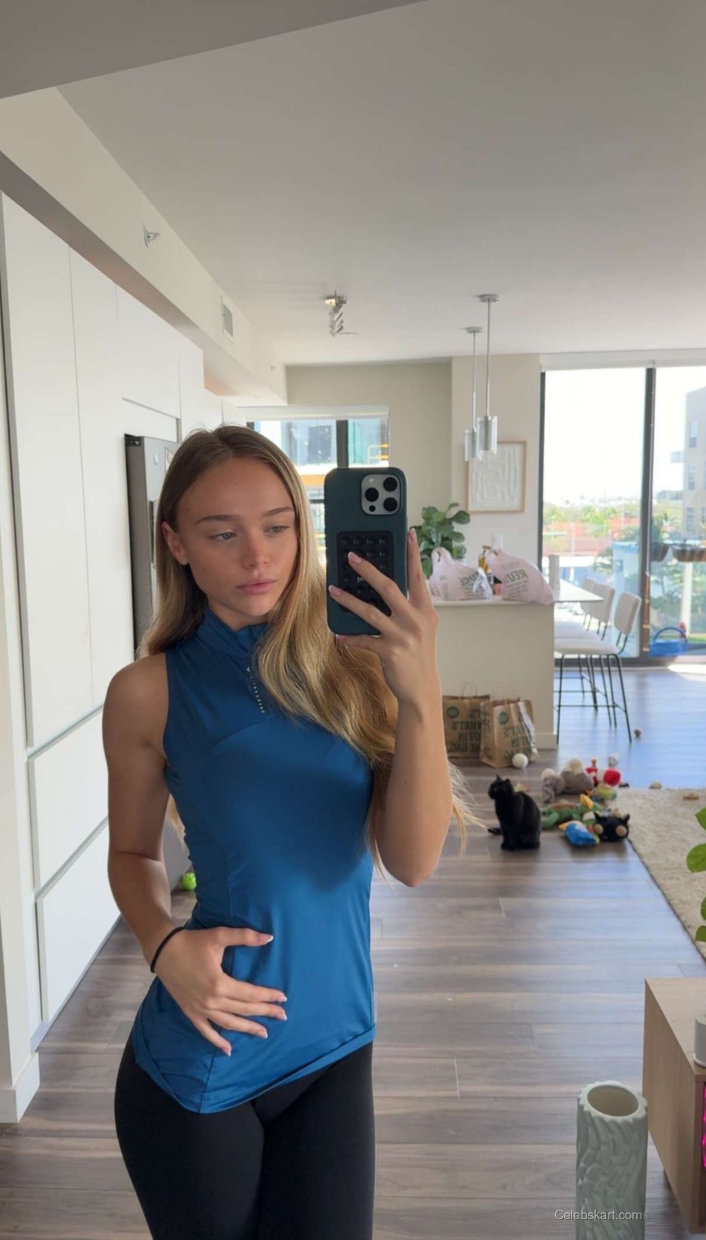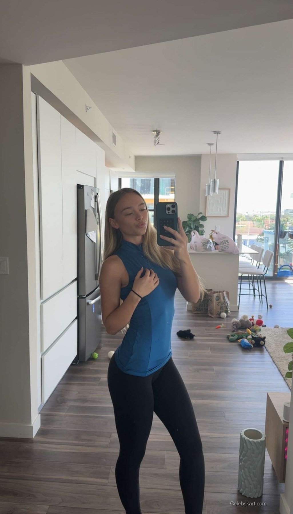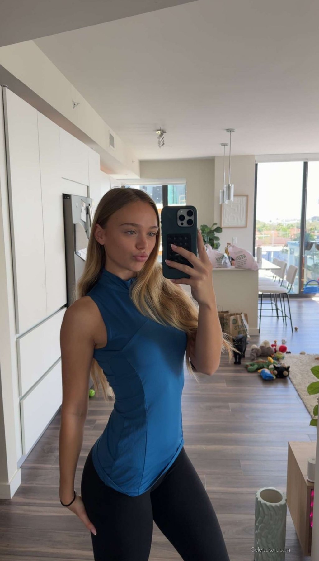 Kyla's outfit features a striking blue top complemented by sleek black leggings. The form-fitting nature of the top accentuates her figure, while the classic black leggings provide a stylish contrast. A casual yet chic combination that is perfect for a relaxed day at home or a casual outing.