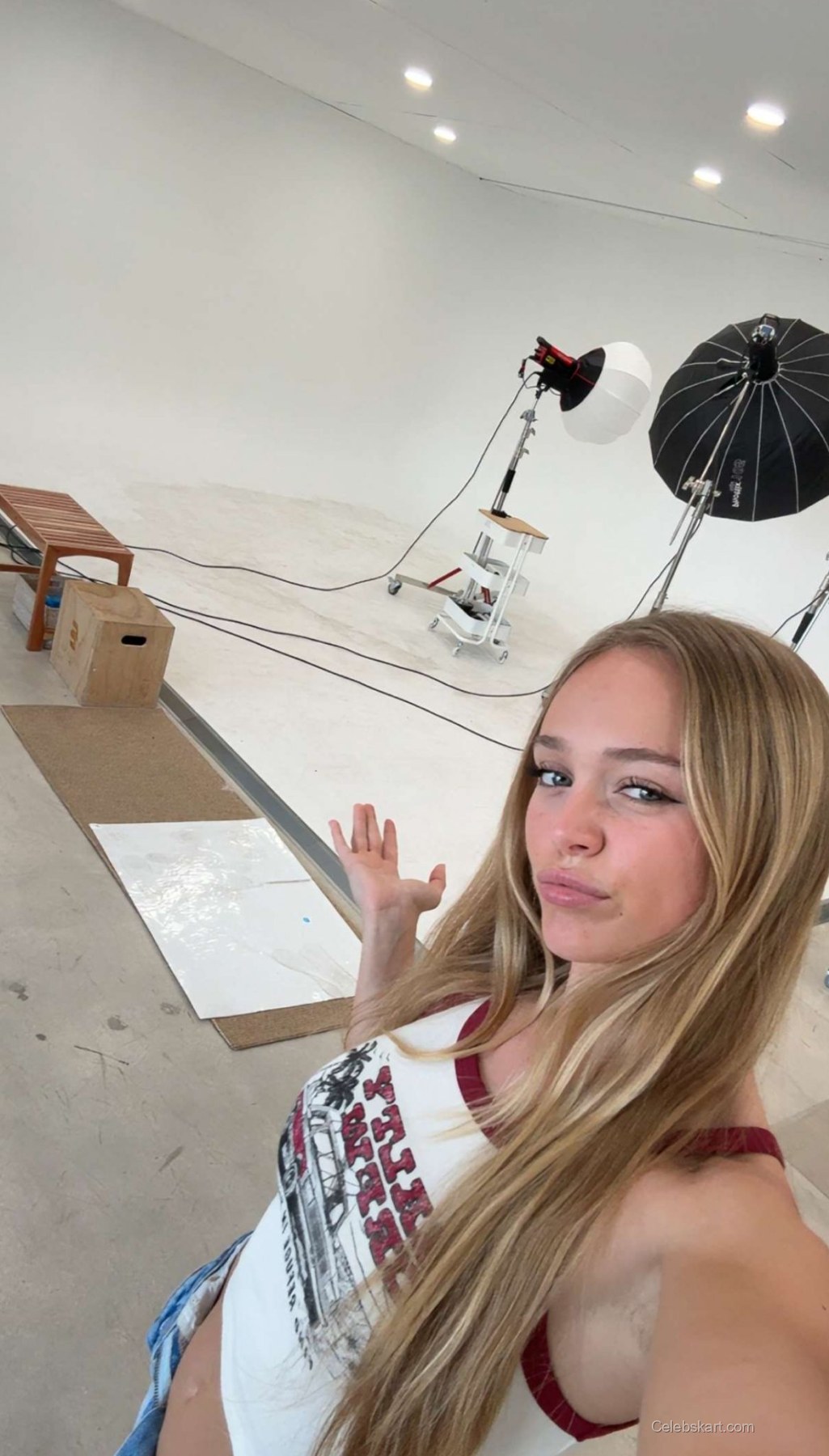 The background of her photos highlights a vibrant assortment of materials, suggesting an artistic studio environment. With her long, flowing hair cascading over her shoulders, Kyla poses confidently while holding her phone, capturing the moment. Another striking detail is her delicate necklace, which adds a hint of elegance to the casual look.