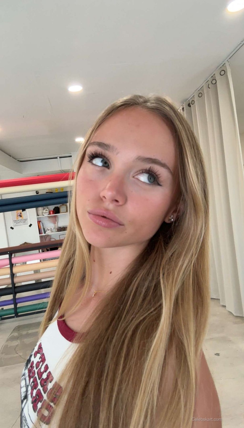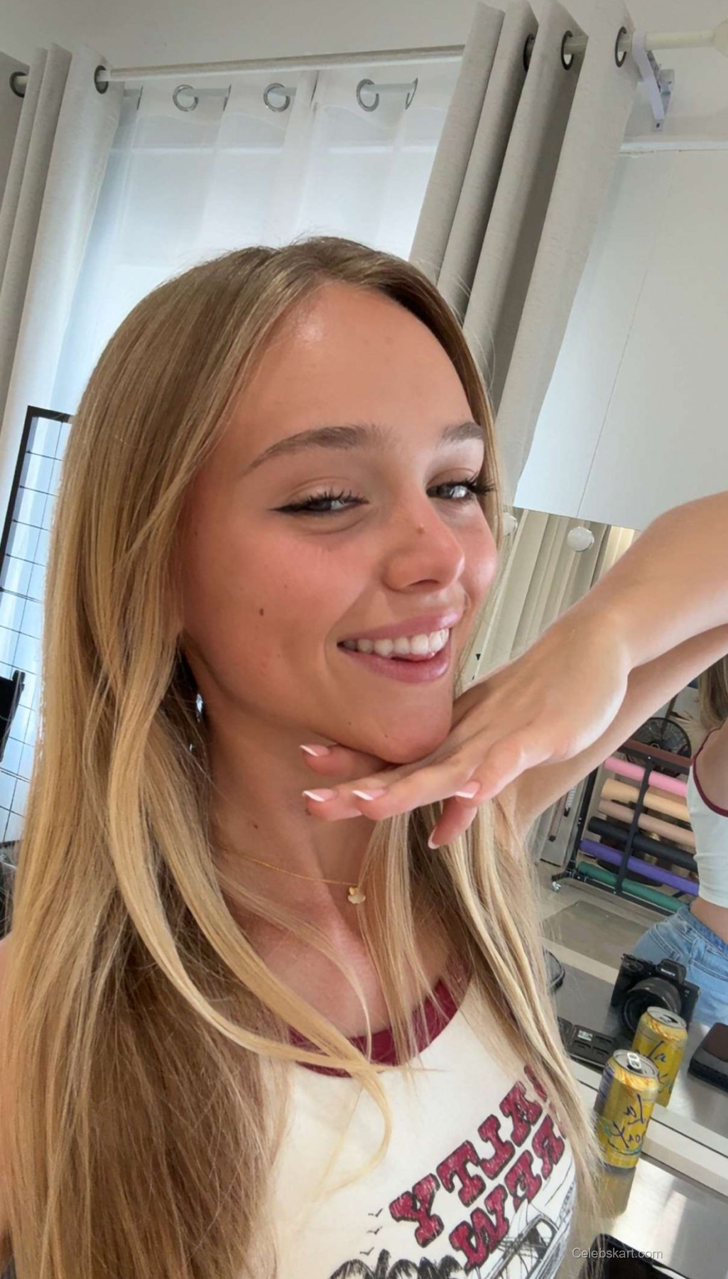 In her latest Instagram post, Kyla is seen wearing a trendy white crop top adorned with a vintage graphic design. This top features deep red accents, perfectly complemented by high-waisted denim shorts that exude a relaxed vibe. The casual ensemble is an ideal choice for a warm day, showcasing a balance of comfort and style.