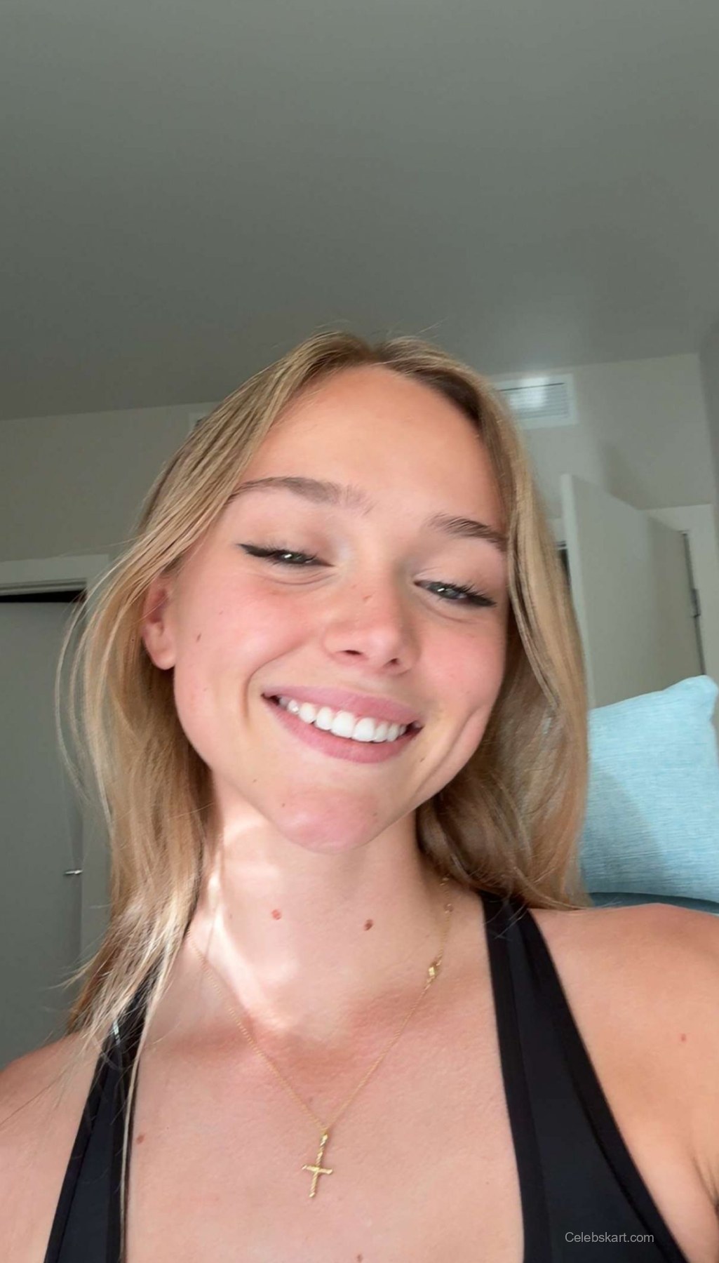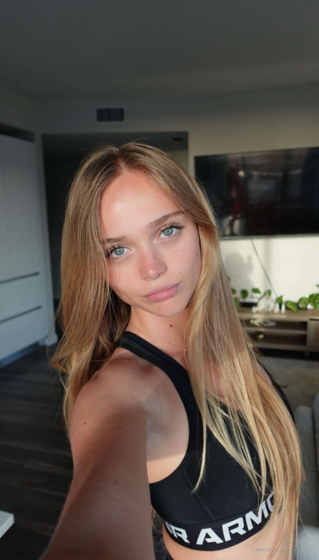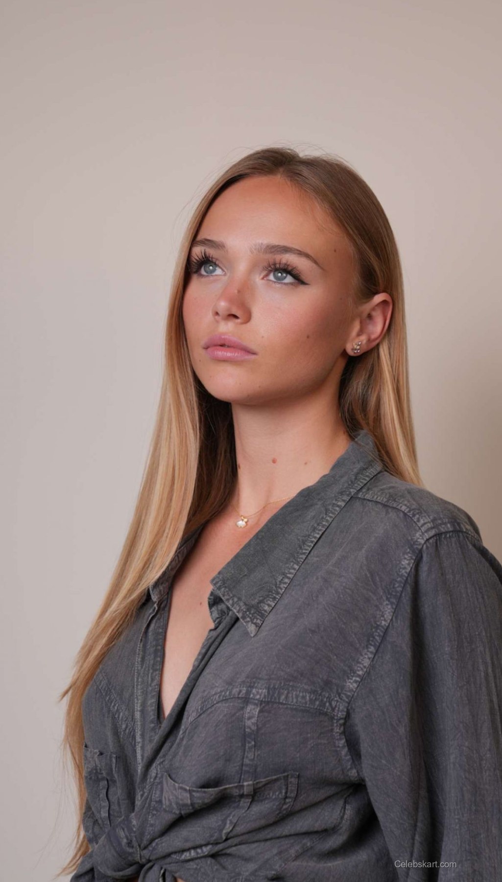 Smiling brightly, Kyla showcases her personality in her selfies. The ambiance of her home, with a cozy background that includes stylish furniture, creates a lovely contrast with her outfit. The natural lighting in the room complements her long, flowing hair and piercing blue eyes, enhancing her overall look.