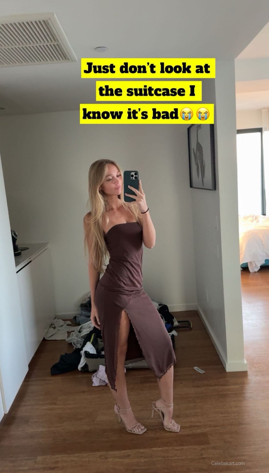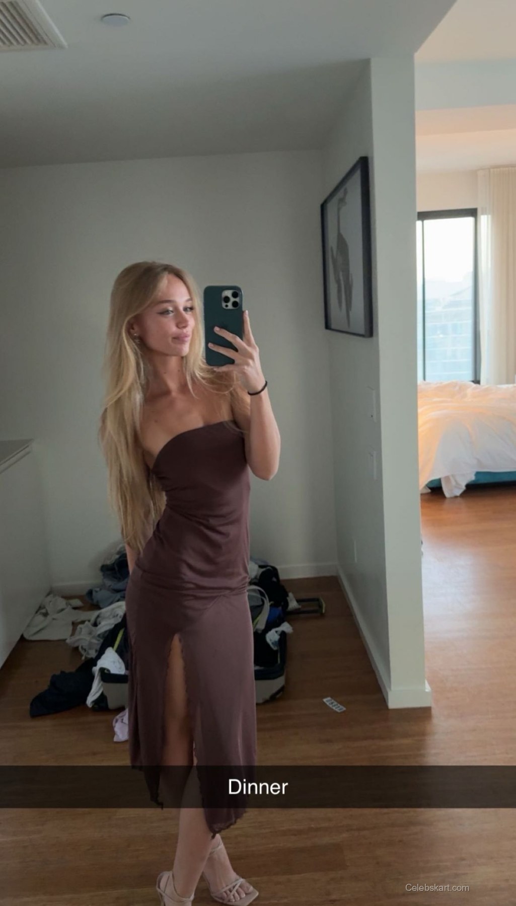 Kyla's outfit centers around a sleek brown dress featuring a daring side slit that provides an edgy accent. The fabric drapes elegantly, enhancing her silhouette while the clean lines give it a polished look. To complete the outfit, she paired the dress with nude strappy heels that elongate her legs and add a touch of sophistication. A simple pair of earrings complements the outfit without overpowering it. The overall look is enhanced by Kyla's choice to feature her long, flowing hair, which adds movement and a casual elegance.