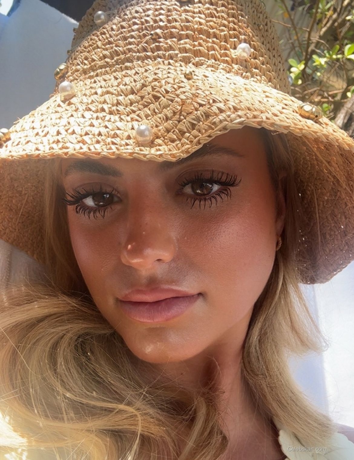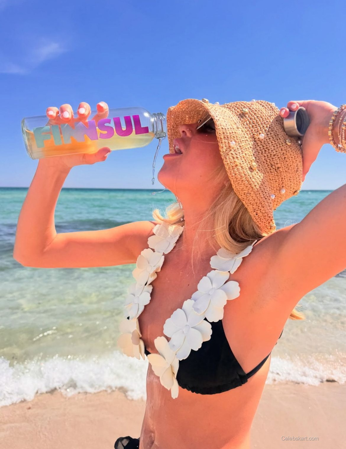 In her photos, Kylan strikes poses that radiate confidence. She is seen sitting comfortably while holding a refreshing drink, likely enjoying a moment of relaxation. The vibrant greens of the beach foliage provide a beautiful natural backdrop that enhances her summery look. As she adjusts her hat slightly, the sunlight highlights her tousled hair, showcasing the carefree nature of beach days. Every subtle movement captures the relaxed vibe synonymous with summer.