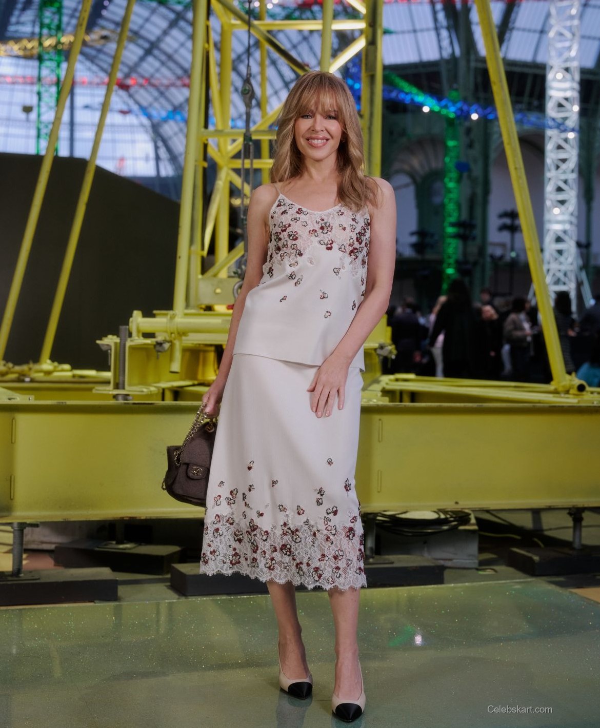 Minogue opted for a sophisticated cream ensemble that featured intricate floral embroidery adorning the top. With a fitted silhouette, the outfit elegantly flowed into a knee-length skirt, revealing subtle lace details at the hem. Complementing her look, she chose a pair of chic two-tone heels with black tips, adding a pop of contrast to her soft attire. Carrying a structured brown handbag enhanced her overall aesthetic, creating a lovely balance between casual and refined. For those interested in similar styles, check out these options from Chanel's latest collection, just like Kylie Minogue’s look.