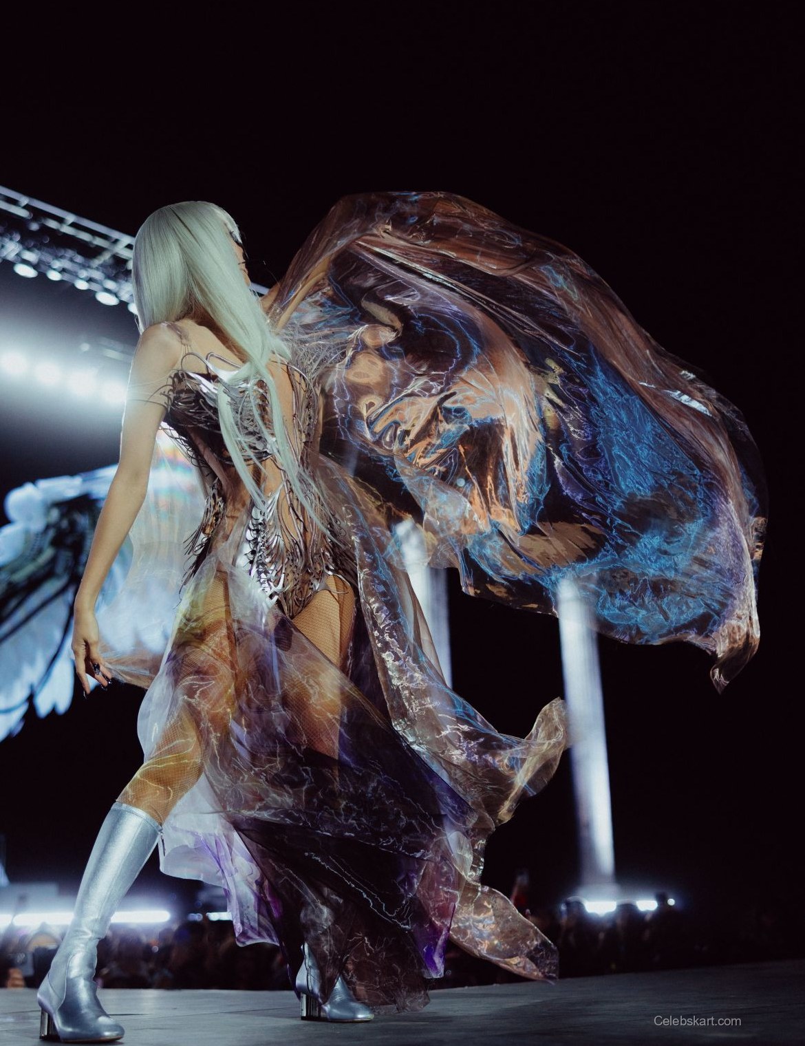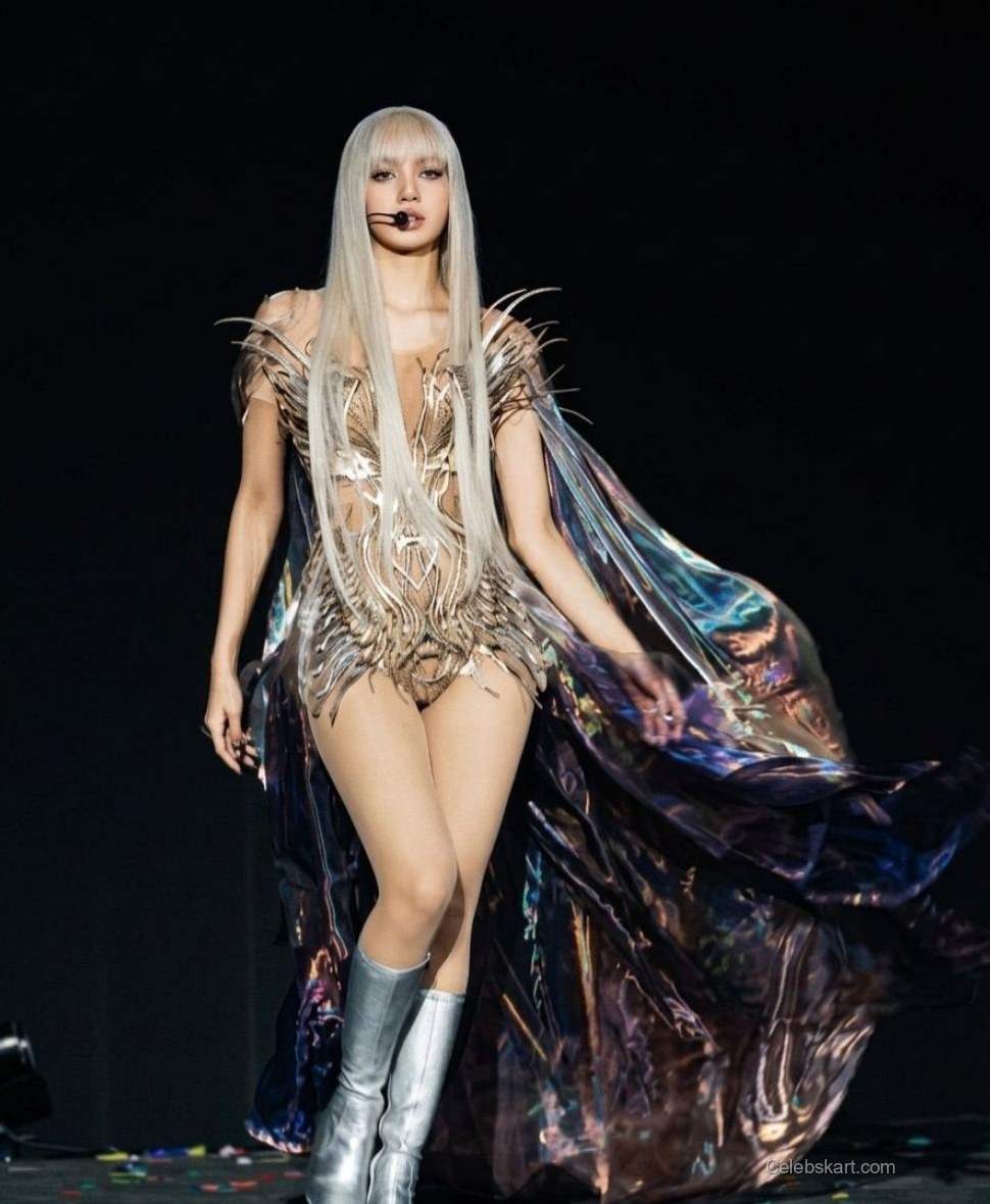 During her performance, Lalisa donned a dazzling silver outfit that featured a form-fitting design accentuated by intricate metallic detailing. The garment shimmered under the festival lights, perfectly complementing her stage persona. Her ensemble was completed with knee-high silver boots that added an edgy flair to her look. The outfit's unique cut highlighted her figure while allowing for dynamic movement, essential for an energetic performance.
