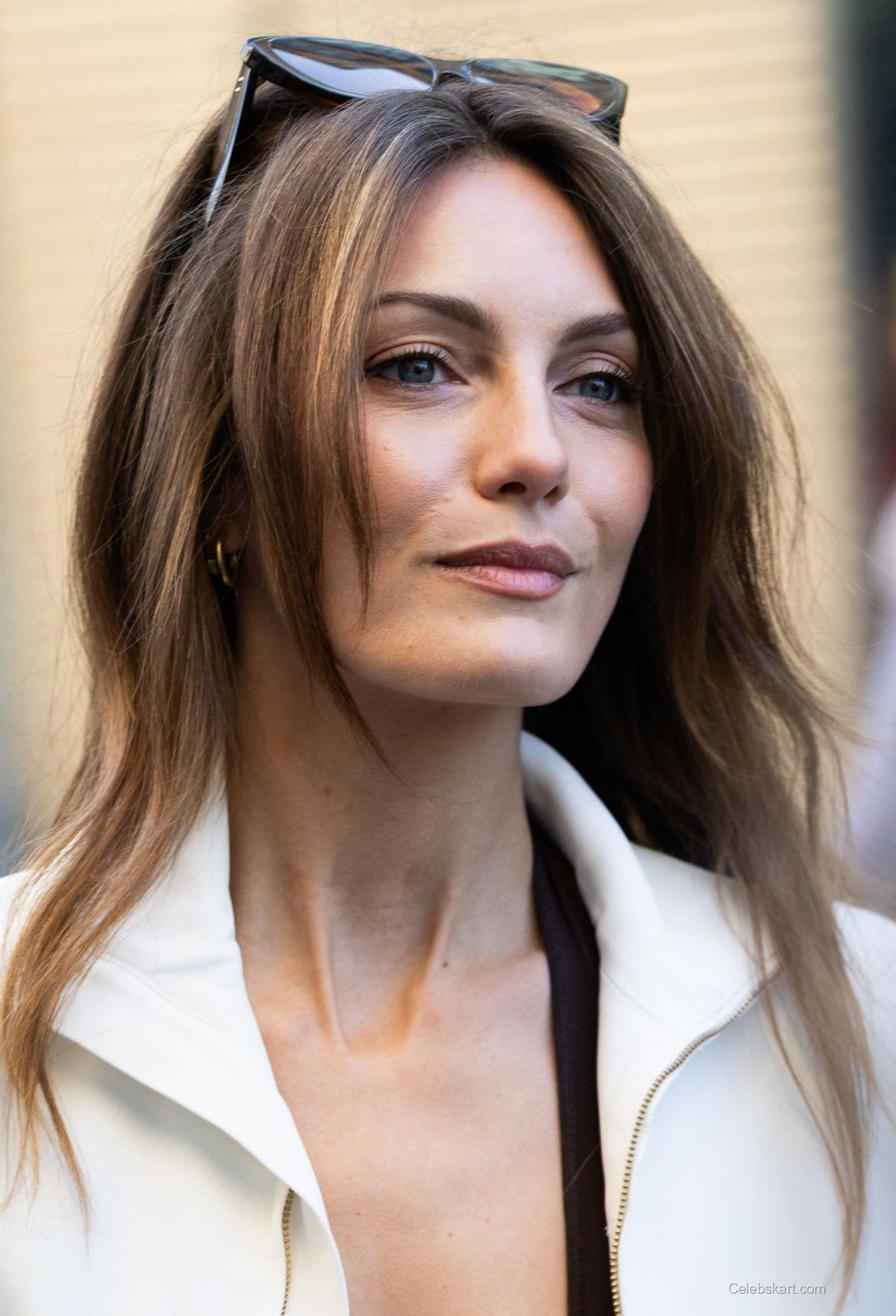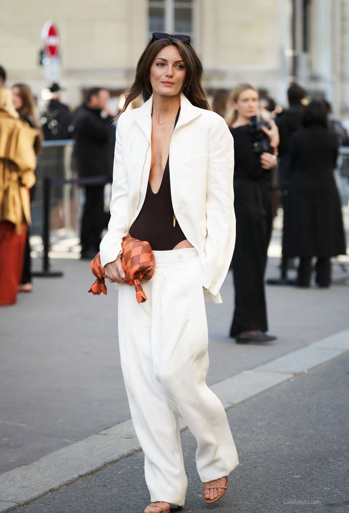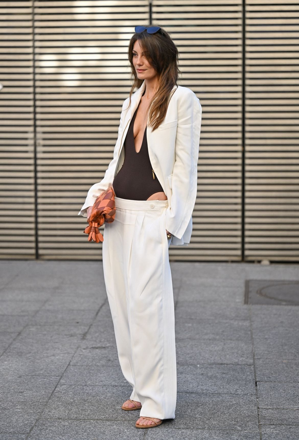 Her outfit was a well-curated ensemble featuring a brown, plunging neckline body suit that accentuated her figure. Over this, she sported a tailored white blazer that added a touch of elegance, effortlessly shifting from casual to chic. Paired with wide-legged trousers in a matching color scheme, this look emphasized her fashion-forward approach while maintaining comfort.