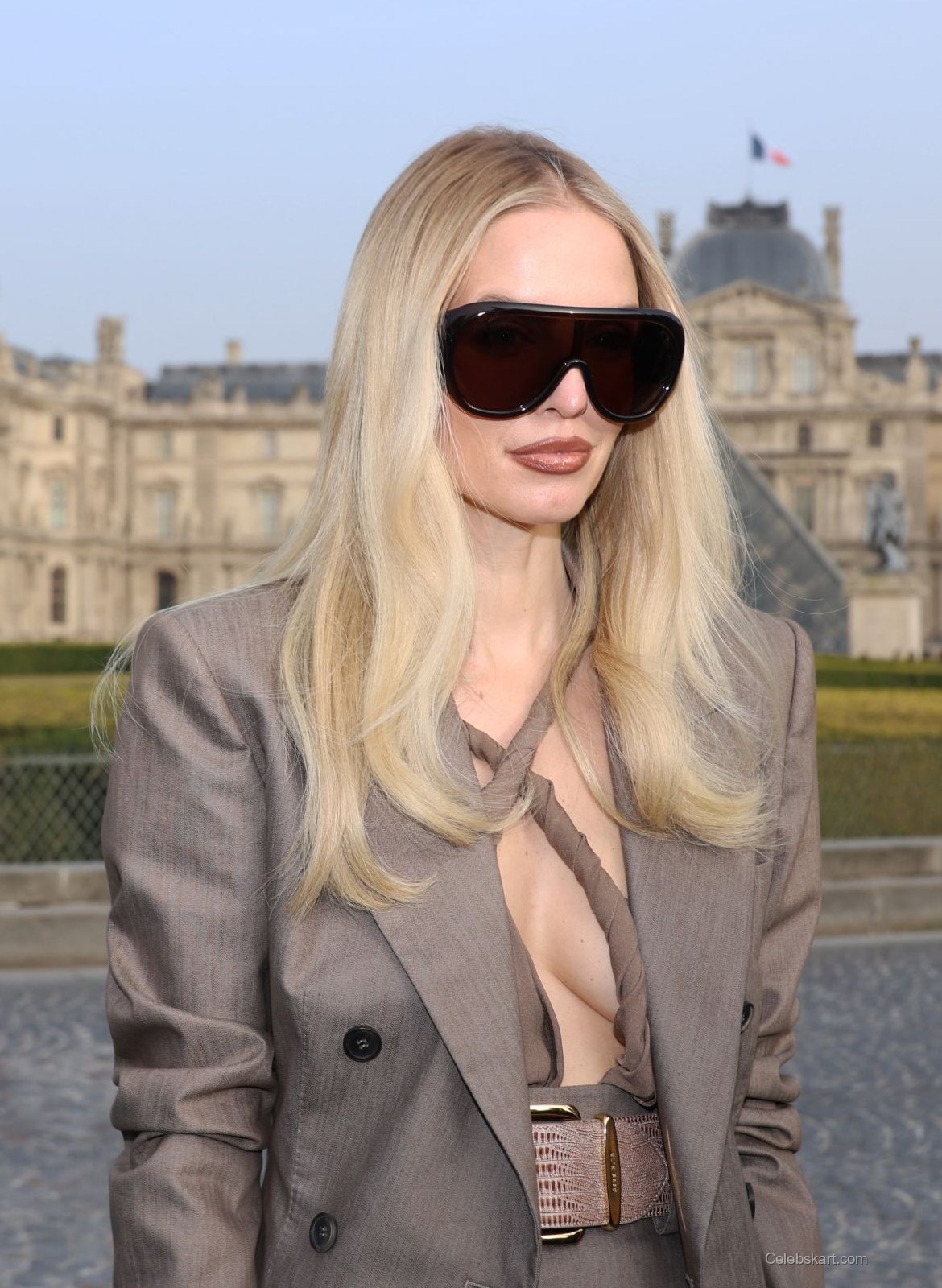 As Hanne posed outside the iconic Louvre, she radiated confidence. With her long, flowing hair and oversized sunglasses, she adopted an air of mystery, captivating onlookers. The play of her outfit’s tones against the architectural backdrop of Paris added a sophisticated flair to her appearance. At times, she adjusted her sunglasses as she interacted with fans, lightening the atmosphere with her approachable demeanor. To explore similar fashionable appearances, check Leonie Hanne's recent outings for more.