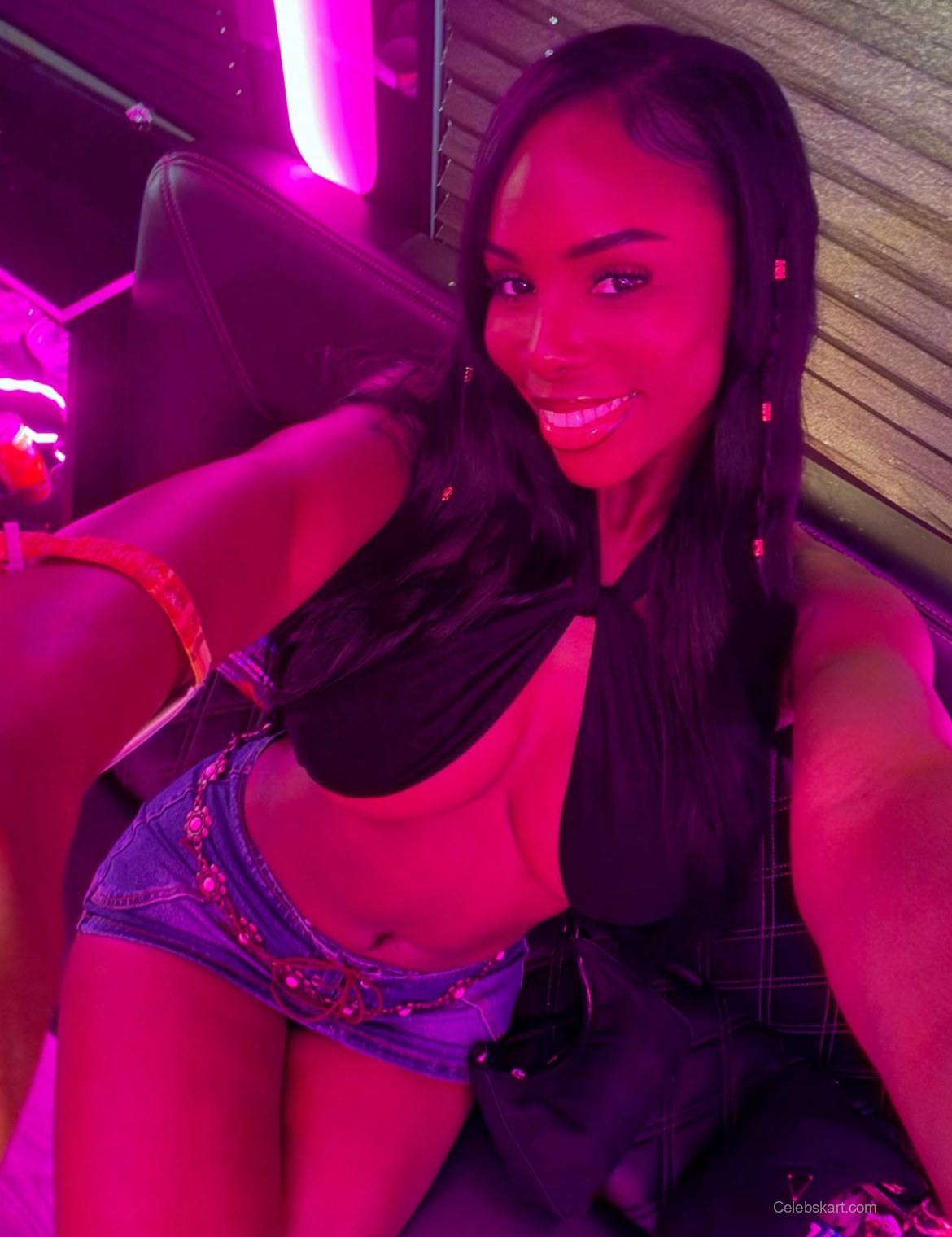 In the photo, Lexi is wearing a unique black top that features an intriguing knot design, which draws attention to her midriff. The top's cut creates a bold look, emphasizing her silhouette. Paired with a denim mini skirt that has a stylish lace-up detail, the outfit is both chic and playful. The skirt is embellished with decorative elements that add a touch of flair, making the entire look stand out. Completing her outfit, Lexi opts for knee-high black boots that enhance her legs and add an edge to her overall appearance.
