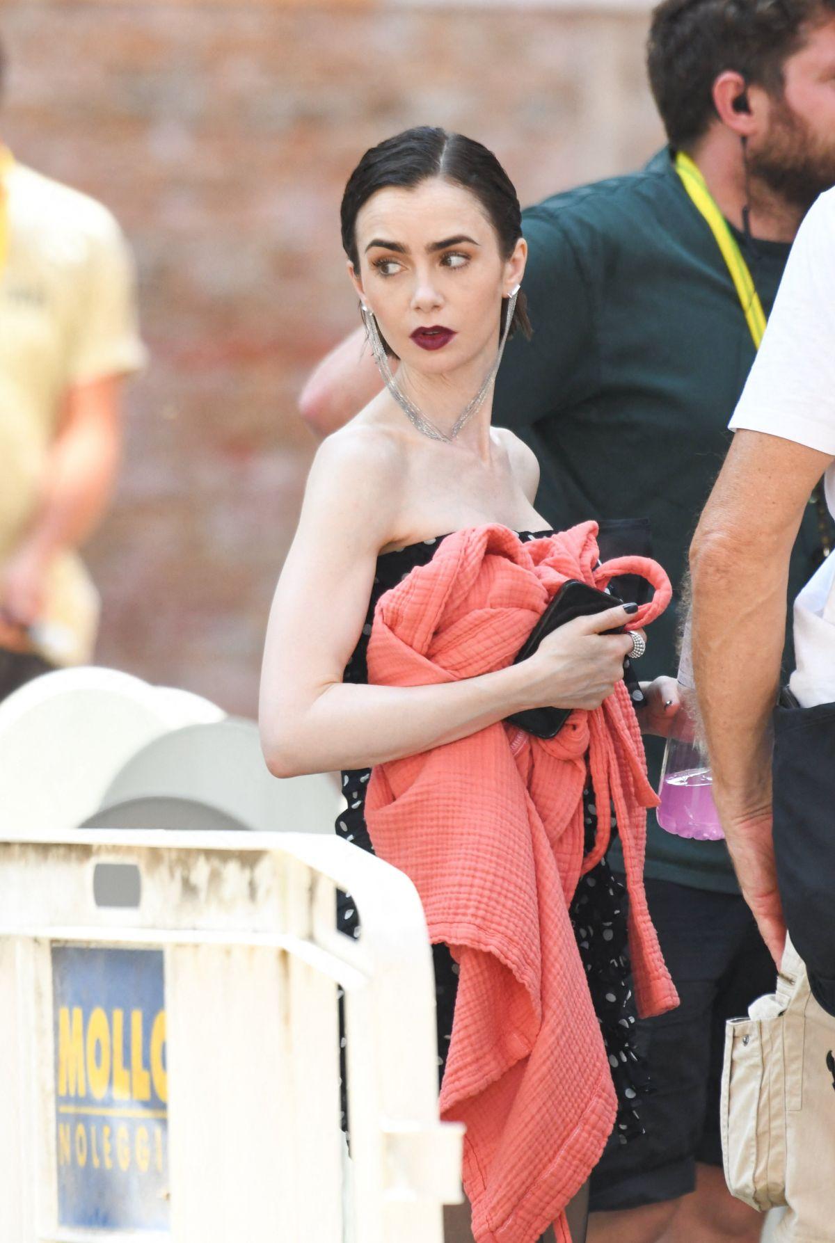 Lily Collins on Emily in Paris set Venice, August 2025