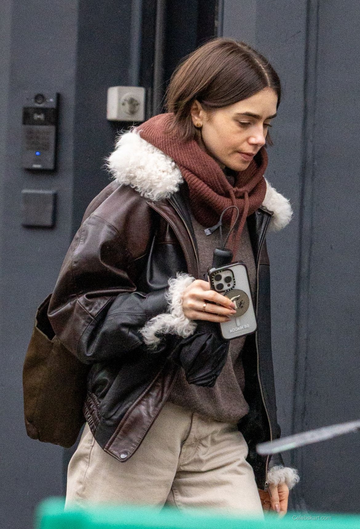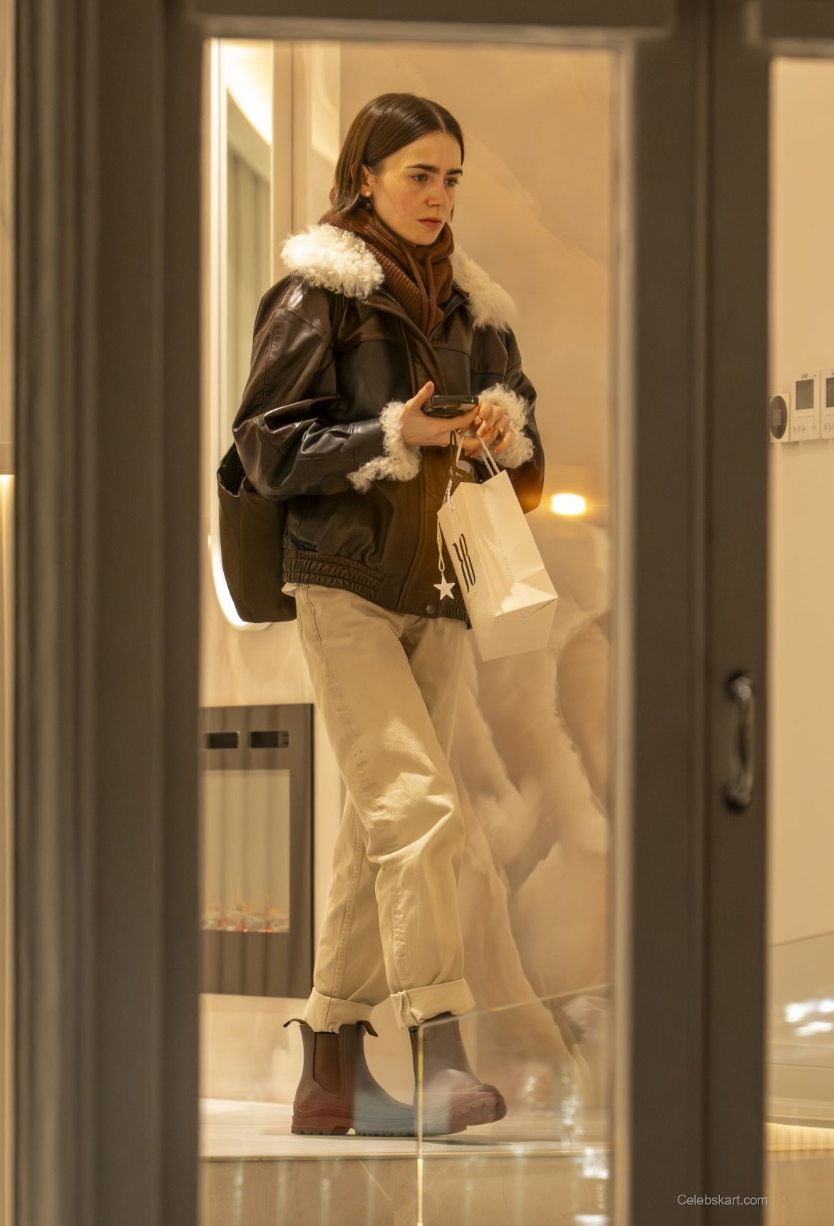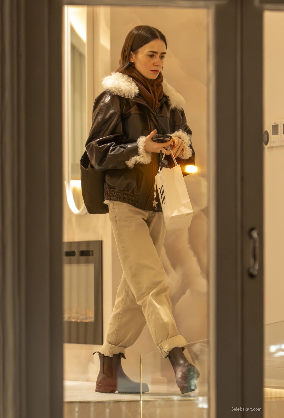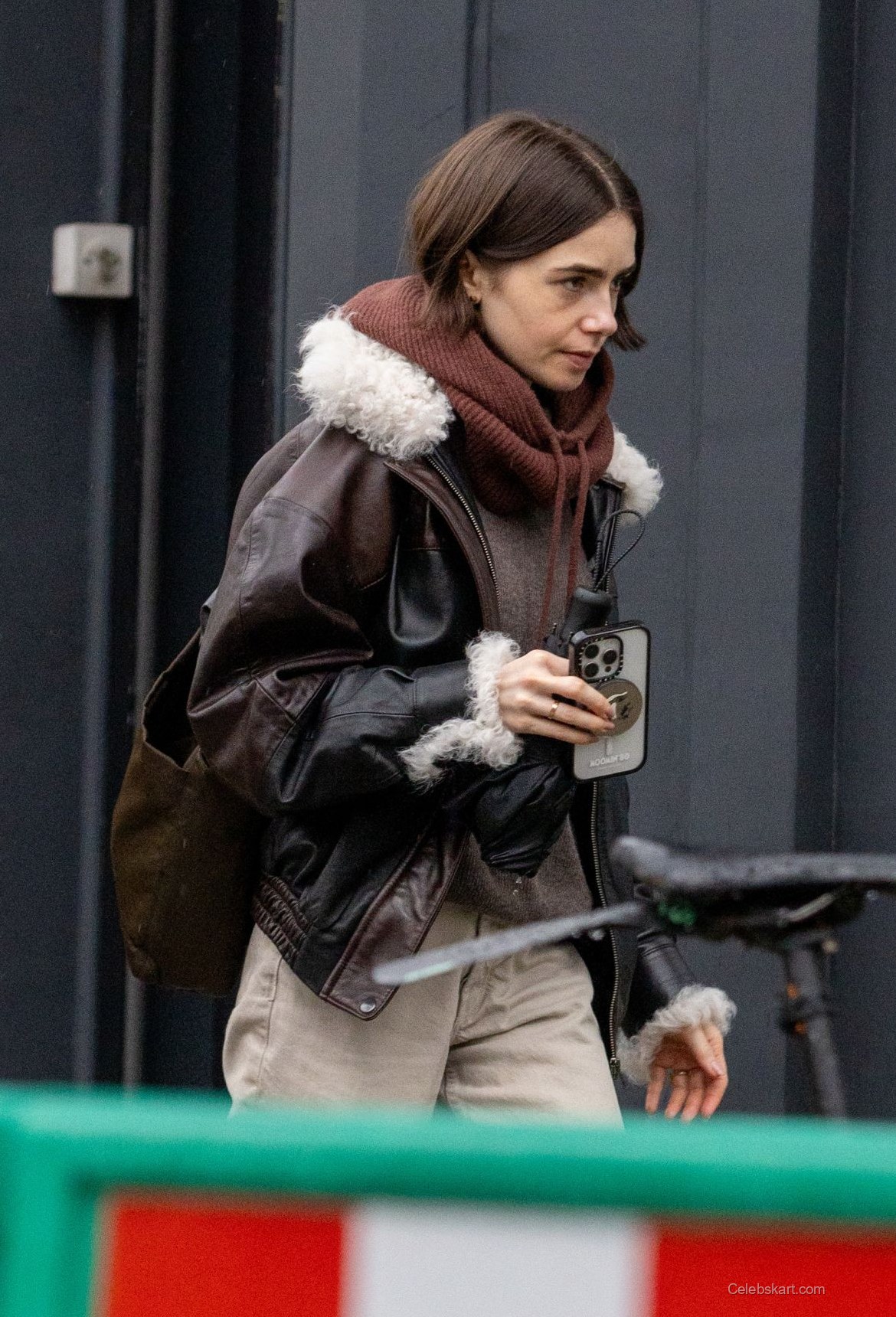 As she walks, Lily keeps her phone in hand, reflecting a casual confidence. She exhibits a thoughtful expression, indicating her focused demeanor. The urban backdrop of London enhances her stylish appearance, with the soft lighting from the studio complementing her chic vibe. Each step reveals a glimpse of her outfit’s stylish details, showcasing a blend of practicality while maintaining a high-fashion appeal. The statement jacket effortlessly serves as a central element of her look.