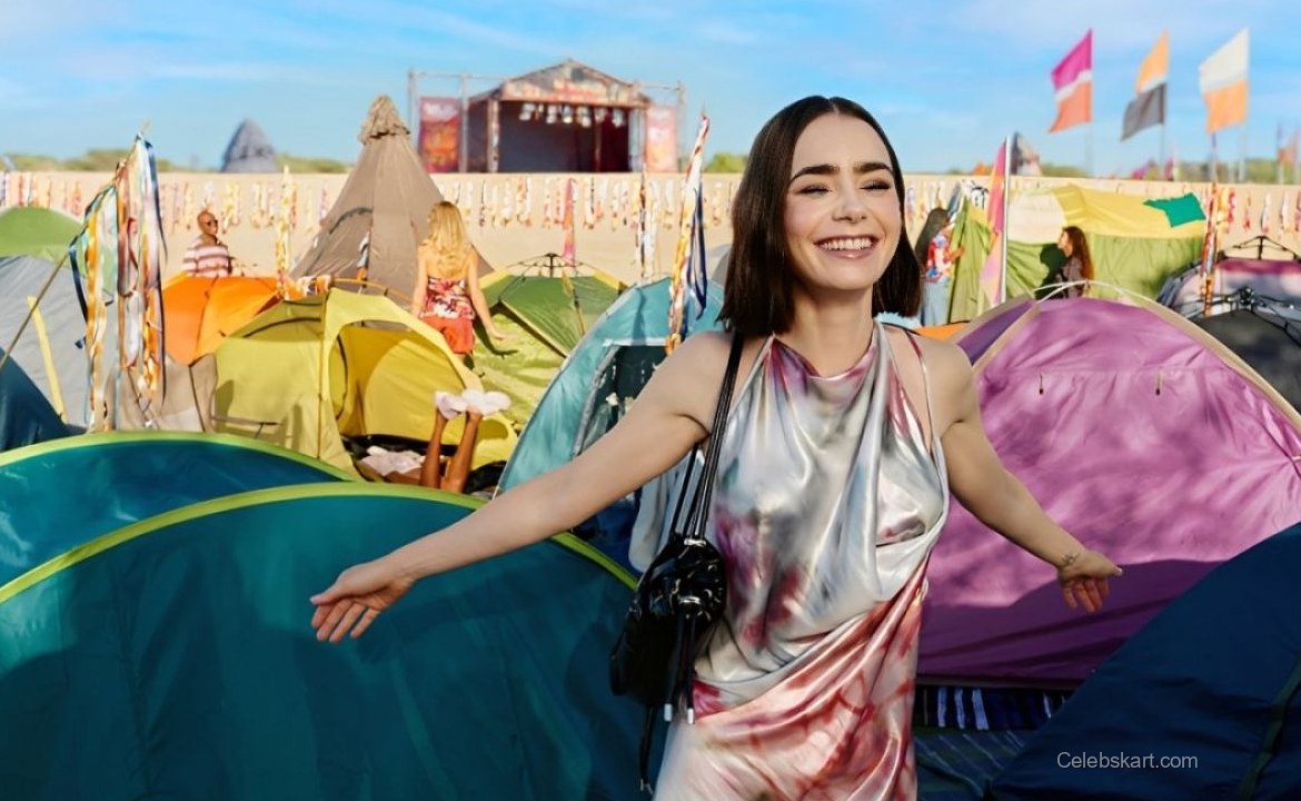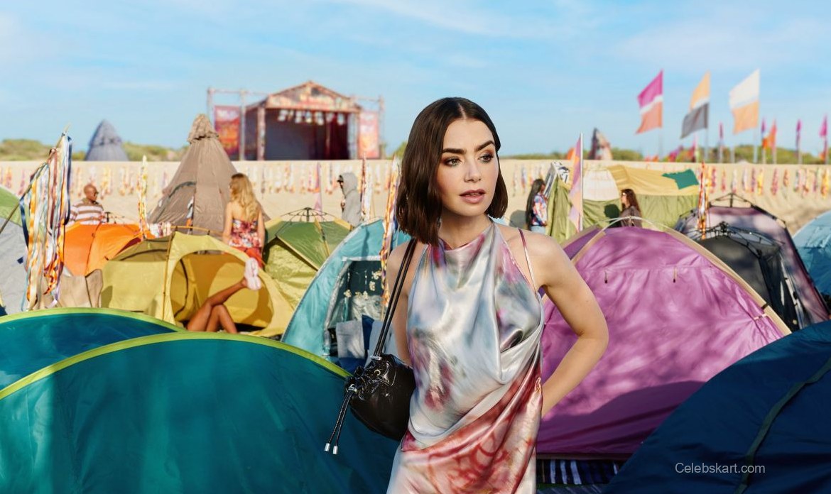 In her featured look, Lily Collins wears a soft, flowy dress with a captivating tie-dye effect that merges hues of lavender and pink. The unique color palette captures the light beautifully, making her stand out among the green tents and golden sands of the background. This design choice not only emphasizes her figure but also resonates with the fun, carefree vibe of summer. Such dresses are perfect for anyone seeking to express their personal style at festivals or casual gatherings. Those interested in similar outfits can explore more options through fashion-forward summer dresses that elevate any look.