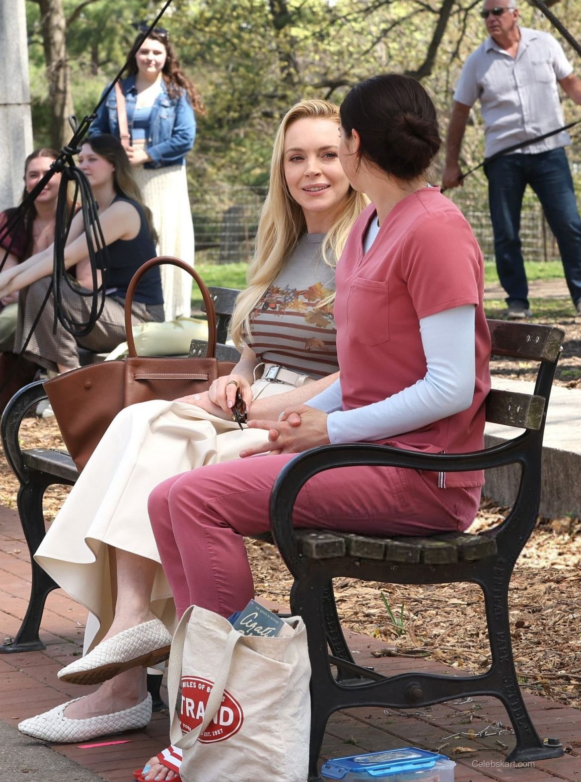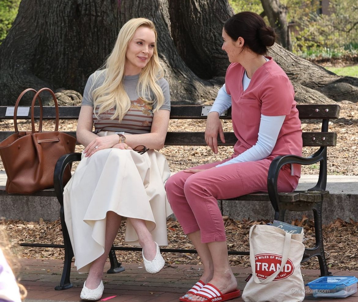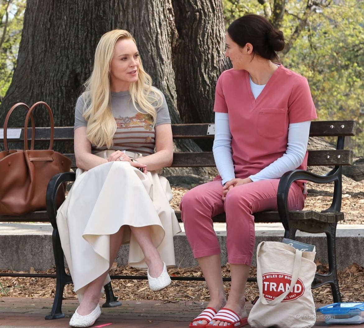 During the scene, Lindsay's long, blonde hair cascaded elegantly over her shoulders, framing her face beautifully. Sitting on a park bench, she exuded a relaxed yet polished vibe, making her a standout in the vibrant outdoor setting. The lush greenery of Fort Greene Park provided a picturesque backdrop, while Lindsay's engaging smile and expressive gestures highlighted her connection with her co-star.