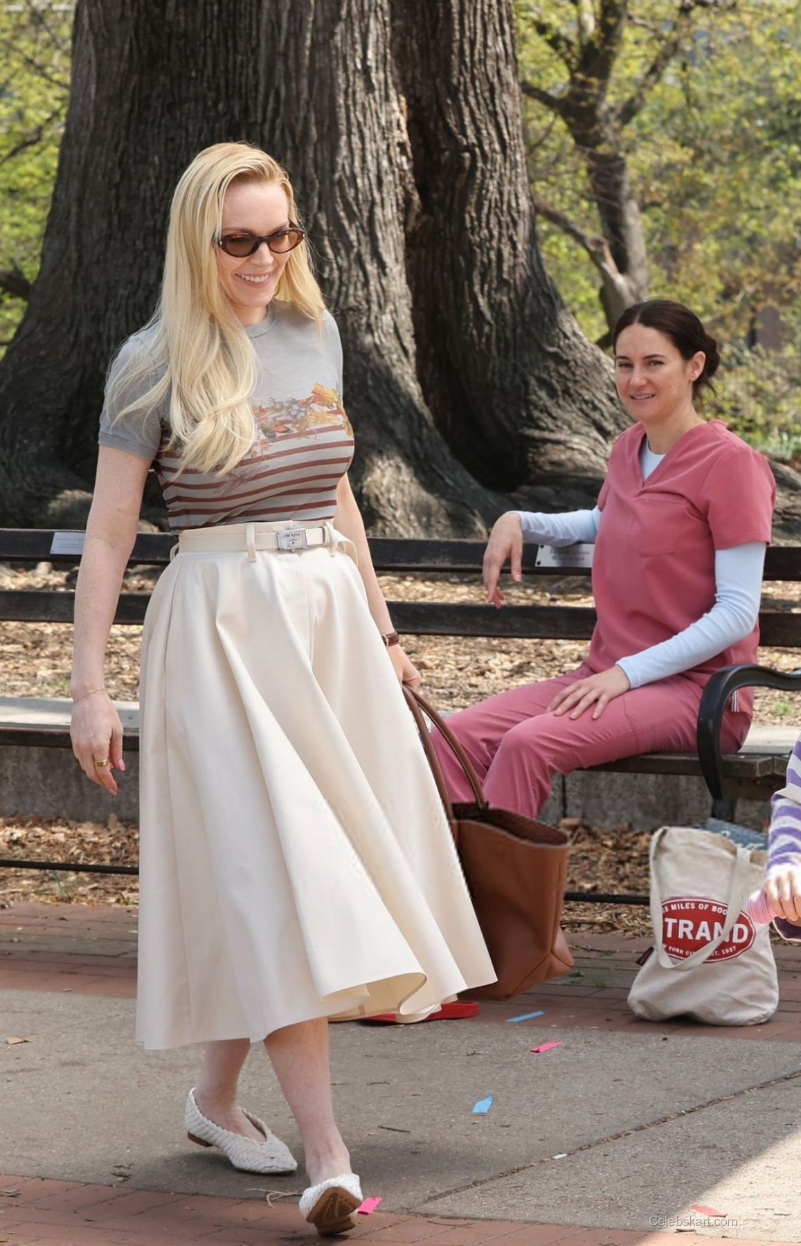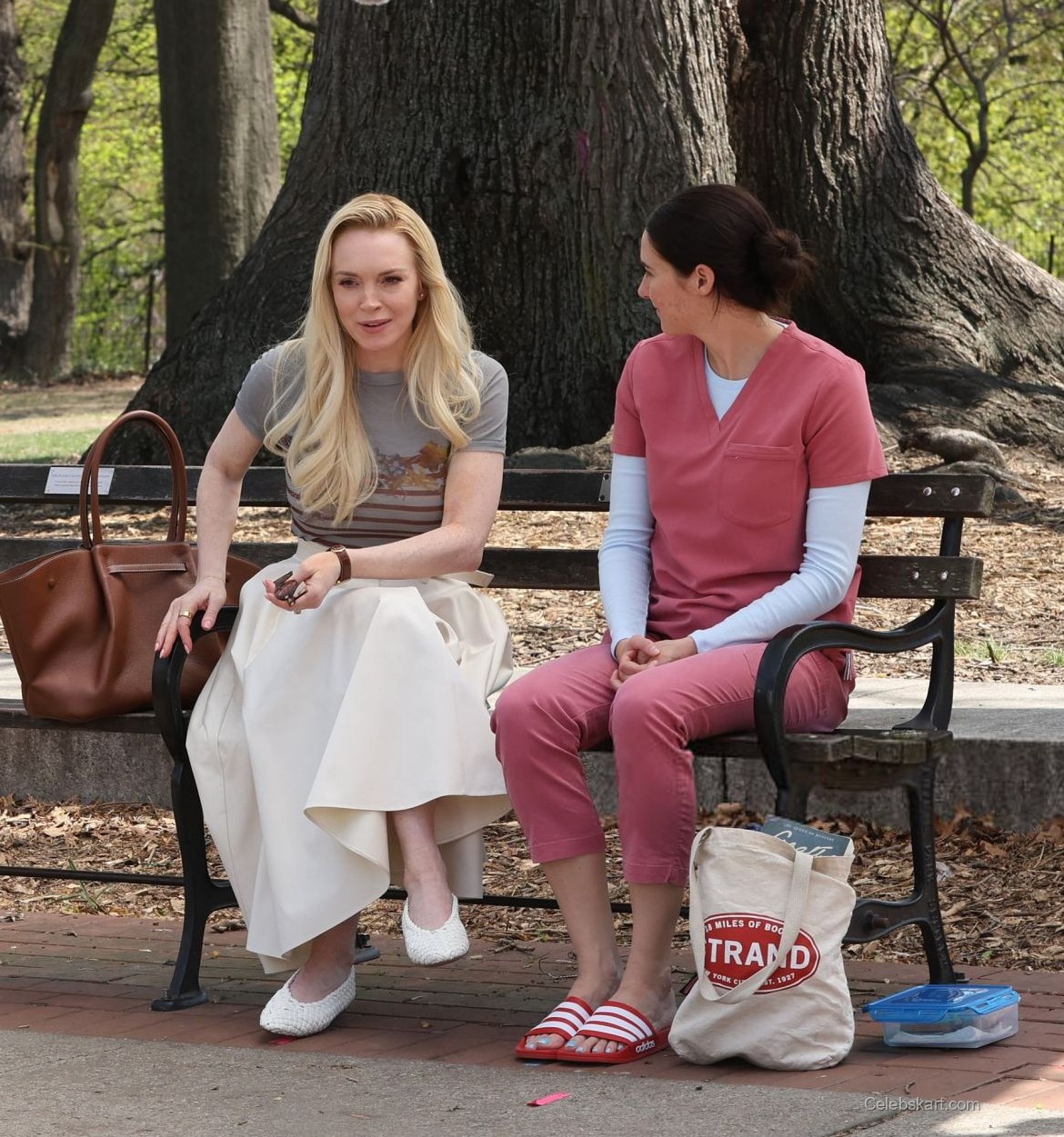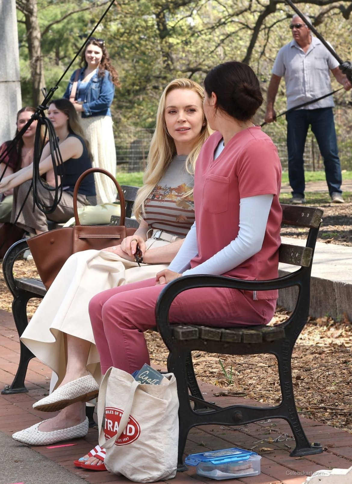 During the scene, Lindsay's long, blonde hair cascaded elegantly over her shoulders, framing her face beautifully. Sitting on a park bench, she exuded a relaxed yet polished vibe, making her a standout in the vibrant outdoor setting. The lush greenery of Fort Greene Park provided a picturesque backdrop, while Lindsay's engaging smile and expressive gestures highlighted her connection with her co-star.