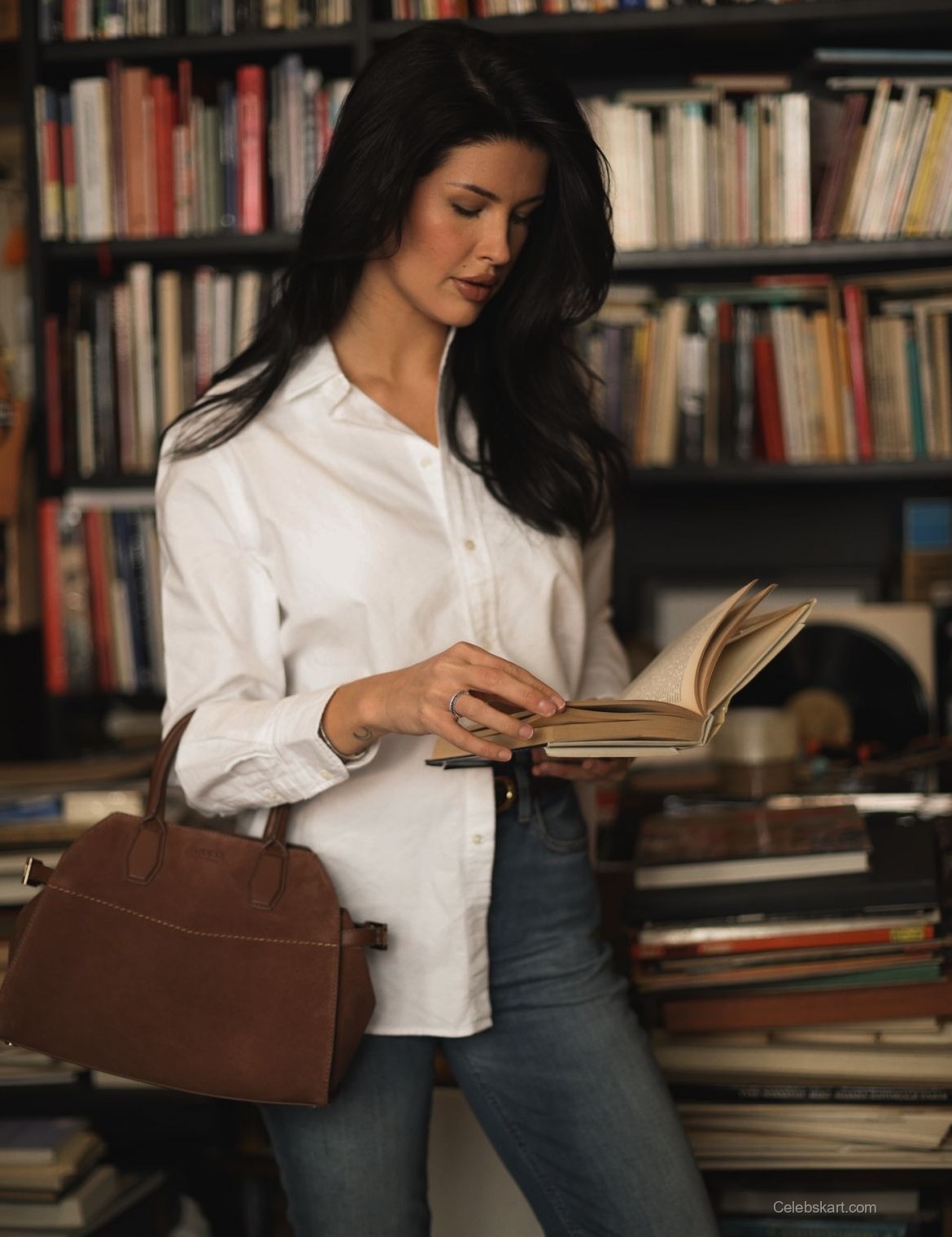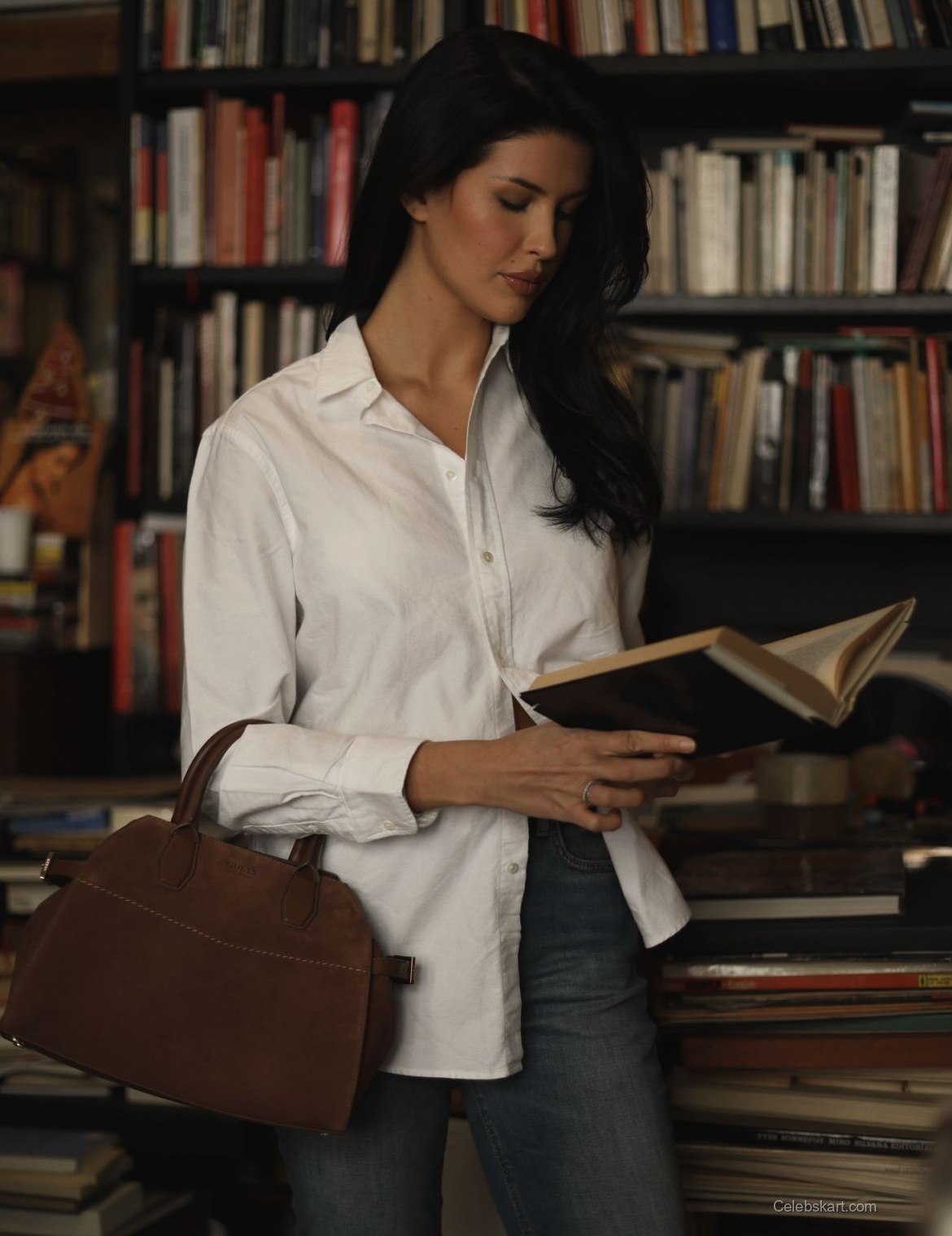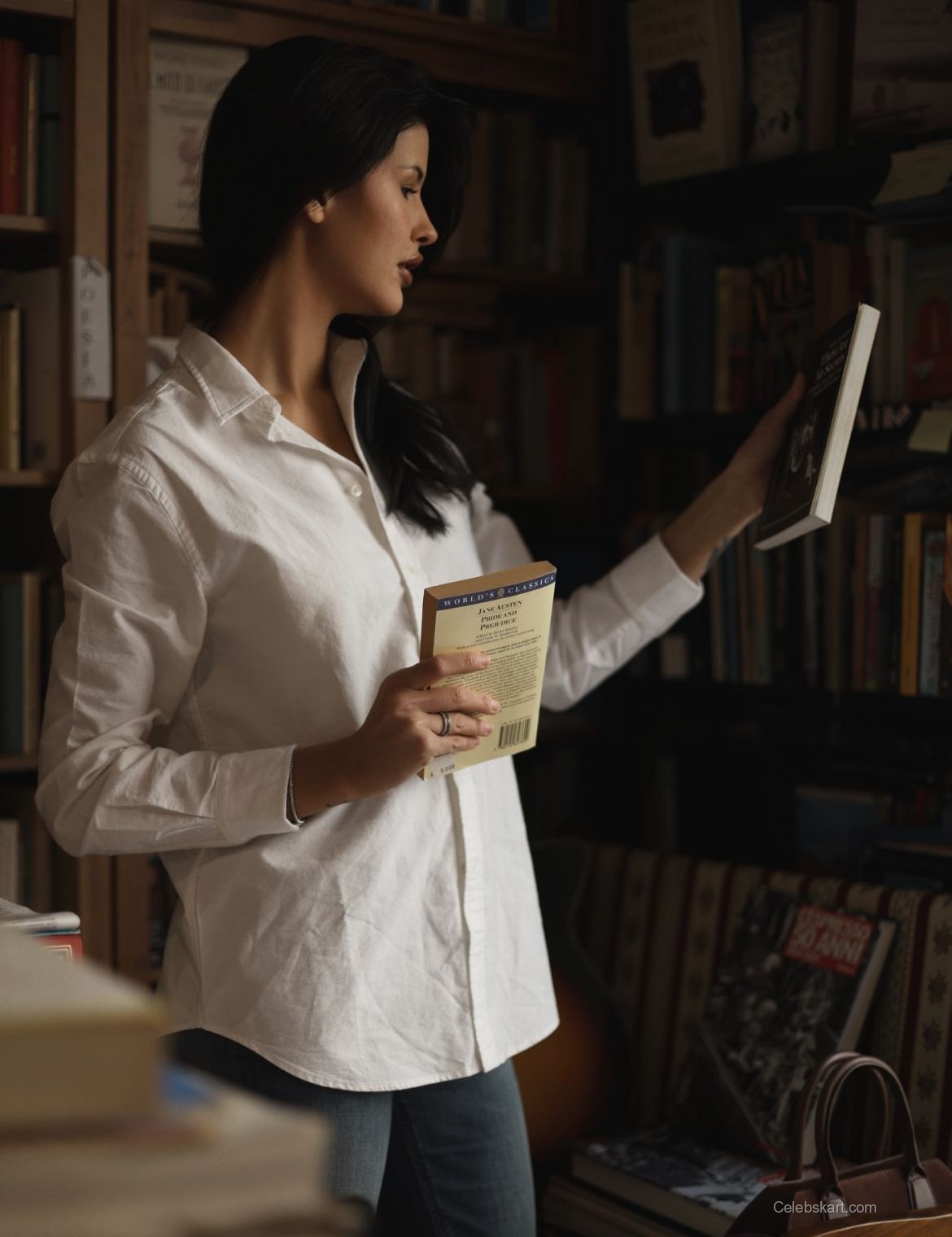 Liza’s choice of a simple white shirt demonstrates that fashion doesn’t have to be overly complicated to make a statement. The clean lines of her attire and the elegant silhouette it creates allow her natural beauty to shine through. The brown handbag she carries is both practical and stylish, further showcasing her knack for functional fashion. Whether she’s browsing through the shelves or flipping through pages, her outfit is designed for comfort without sacrificing style. This combination is a perfect example of how to dress for both relaxation and sophistication in everyday scenarios. For more looks that embrace simplicity, check out similar styles like Liza’s library moments or dive into the latest trends in casual chic outfits.