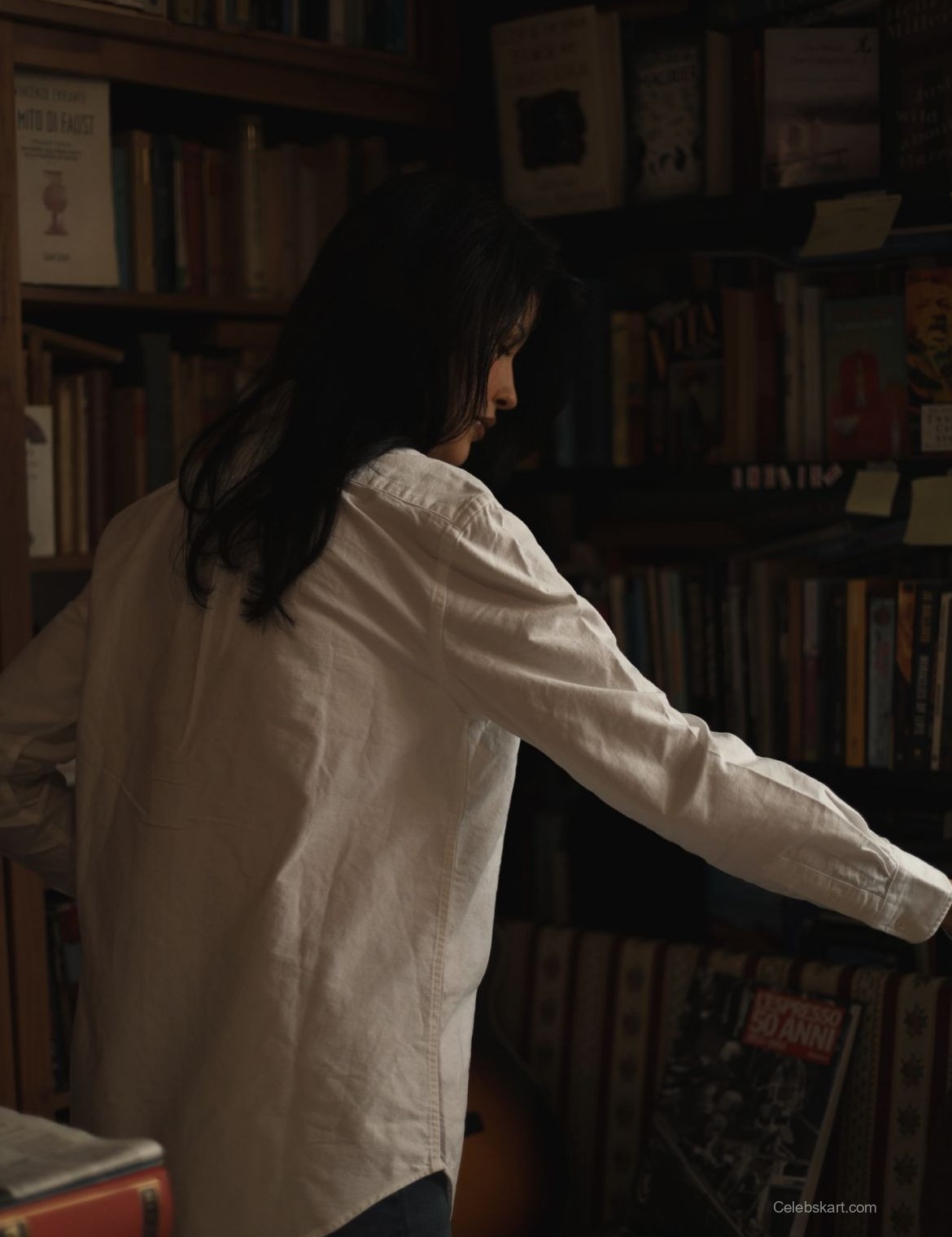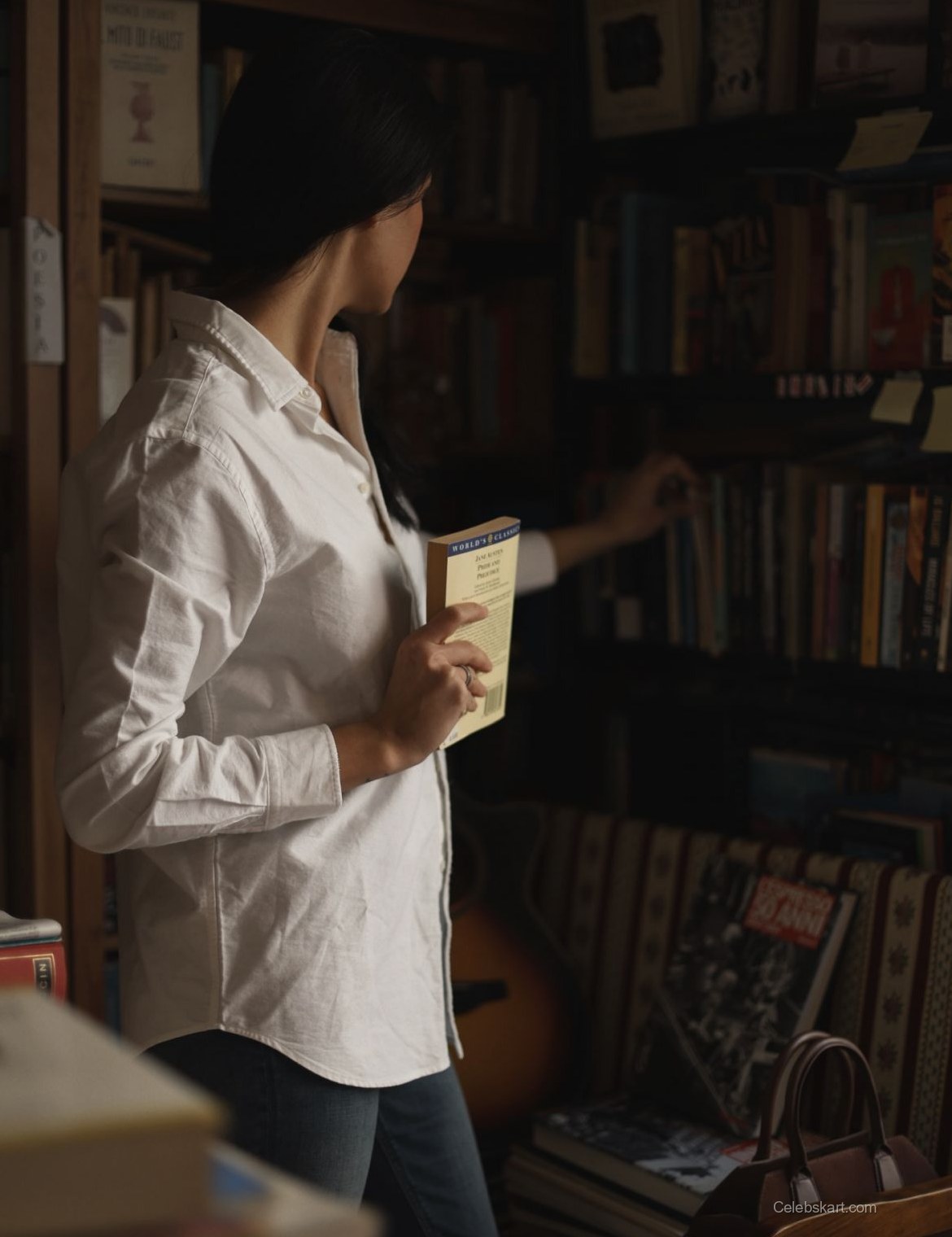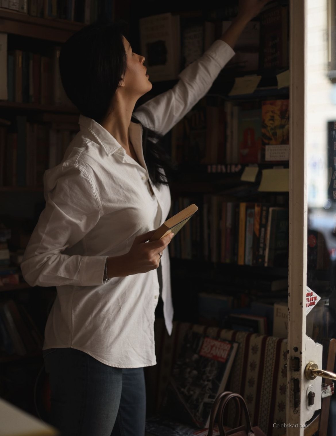 Liza’s choice of a simple white shirt demonstrates that fashion doesn’t have to be overly complicated to make a statement. The clean lines of her attire and the elegant silhouette it creates allow her natural beauty to shine through. The brown handbag she carries is both practical and stylish, further showcasing her knack for functional fashion. Whether she’s browsing through the shelves or flipping through pages, her outfit is designed for comfort without sacrificing style. This combination is a perfect example of how to dress for both relaxation and sophistication in everyday scenarios. For more looks that embrace simplicity, check out similar styles like Liza’s library moments or dive into the latest trends in casual chic outfits.
