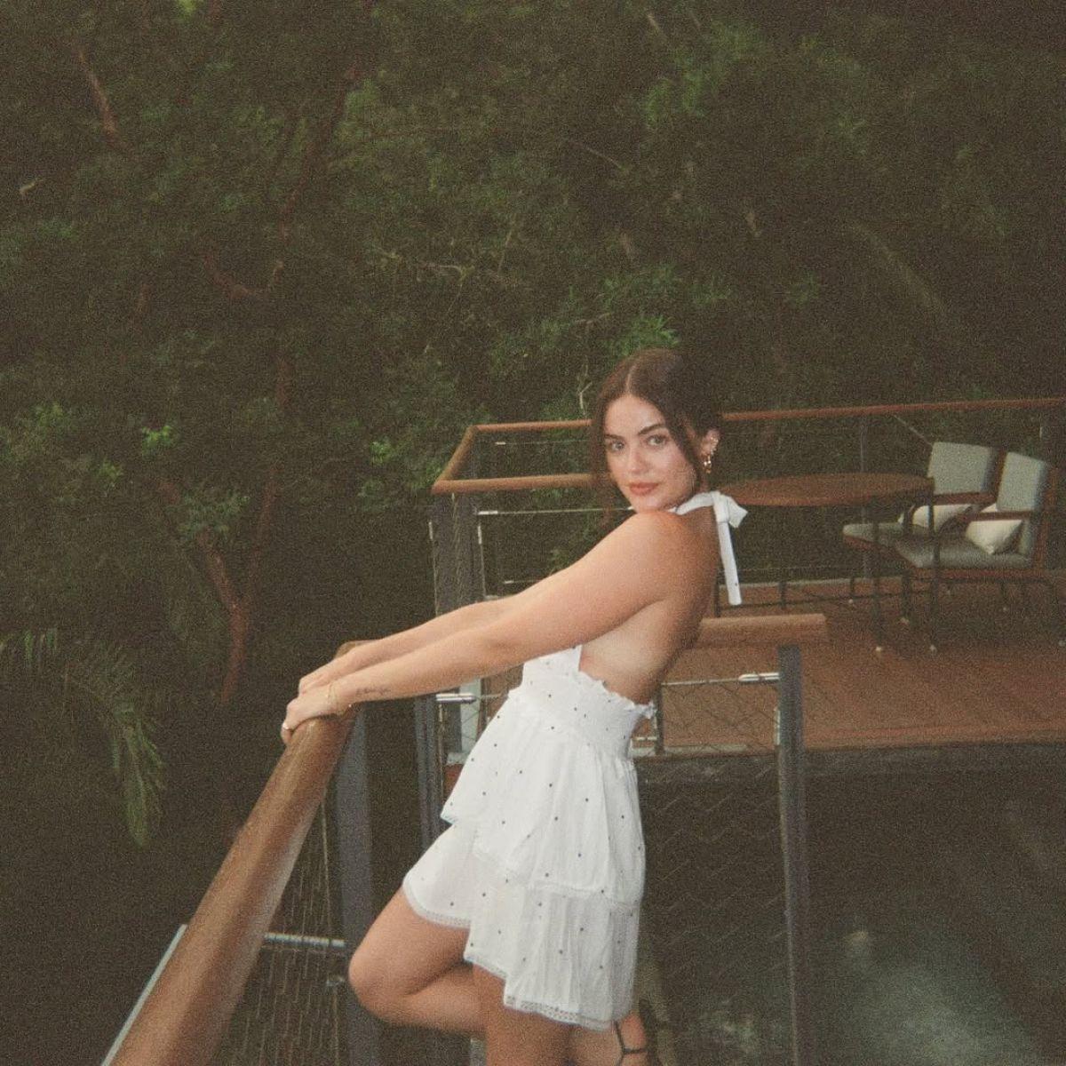 Lucy Hale Photo Shoot in Black Satin Dress by Photographer Claire Leahy, Jan 2023