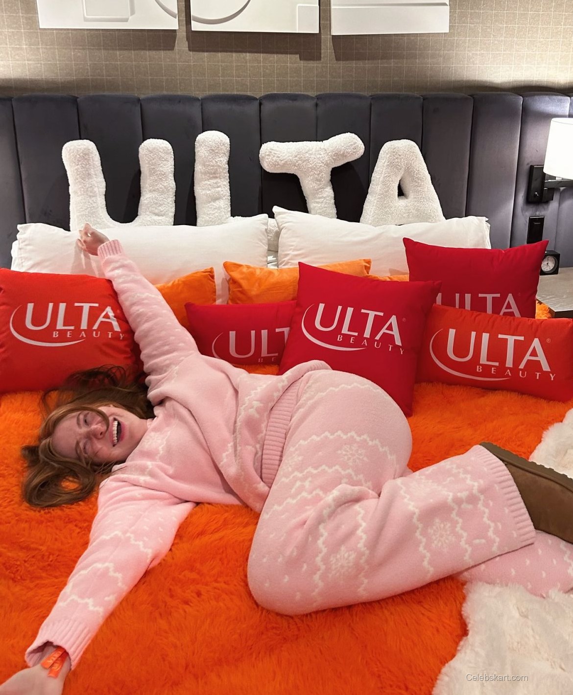 Madeline's pose oozed confidence as she playfully interacted with the event's vibrant decor. The backdrop featured brilliant orange hues, together with floral arrangements that enhanced the lively atmosphere. At one moment, she stood with one leg slightly bent, showcasing her boots while smiling brightly. In a different shot, her long hair cascaded softly over her shoulder, framing her face beautifully. The way she engaged with her surroundings demonstrated her joyful spirit, making her shine even more.