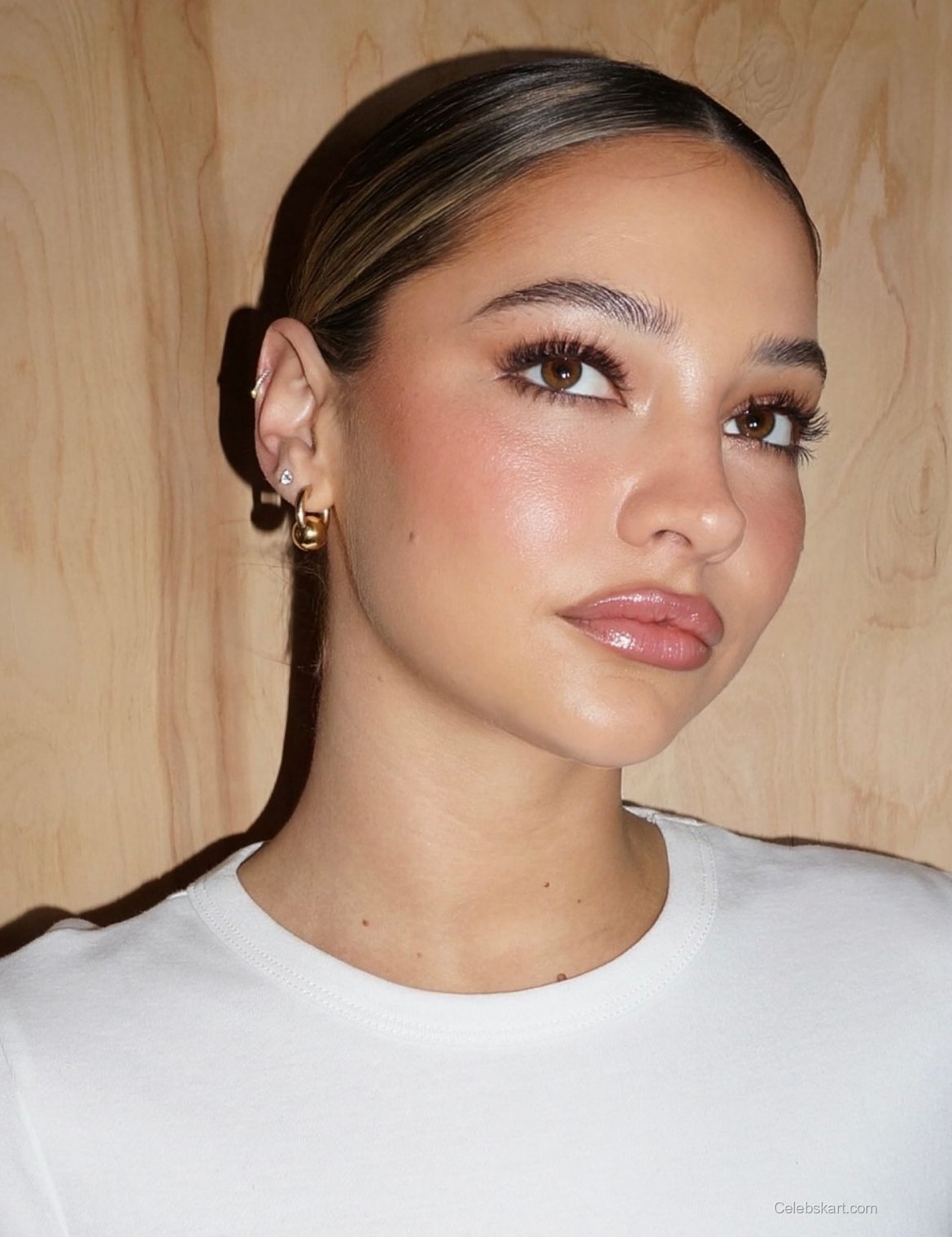 Madelyn chose a fitted white t-shirt for the photoshoot, a timeless piece that accentuated her figure. The tee featured a classic round neckline and short sleeves, offering a clean and minimalist aesthetic. This choice of outfit not only emphasized her youthful appearance but also provided a versatile base for styling. The simplicity of the white fabric made her radiant skin and makeup pop, creating a striking visual contrast that drew attention.