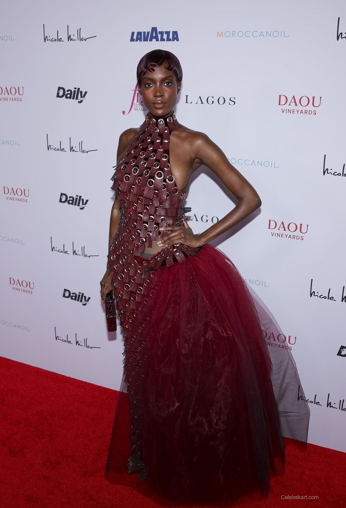 Madisin Rian's gown featured a unique design characterized by its intricate layering and a rich red hue. The upper portion was adorned with circular embellishments that added a contemporary twist to the overall look. The skirt transitioned into a flowing tulle design, creating a beautiful silhouette that exuded both confidence and grace. Complementing her outfit, Rian held a matching clutch that perfectly harmonized with her dress.