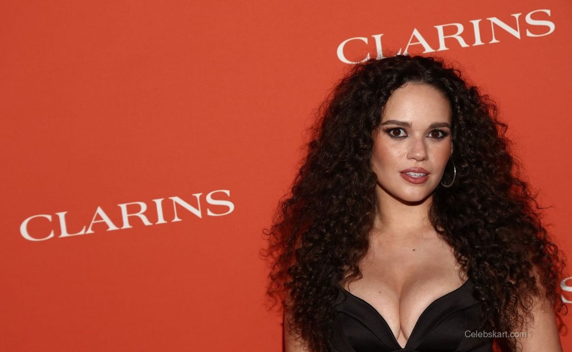 As she posed against the vibrant orange backdrop, Madison displayed confidence and poise. She smiled warmly at the cameras, enhancing her captivating look. Her curly hair framed her face and complemented the overall aesthetic perfectly, while a pair of elegant hoop earrings added a touch of glamour.