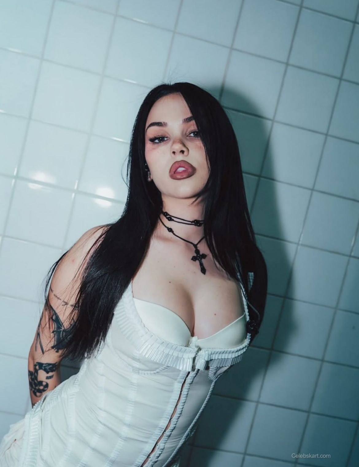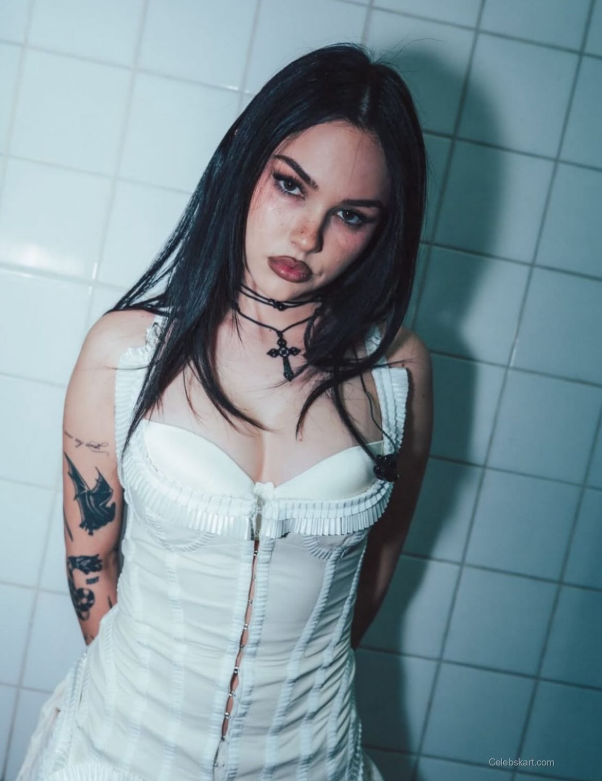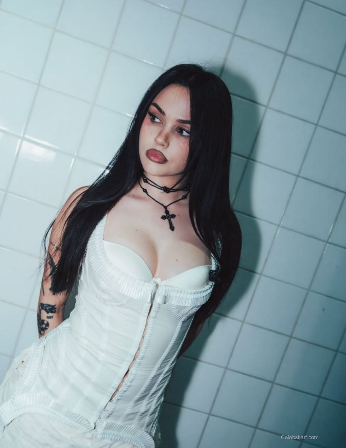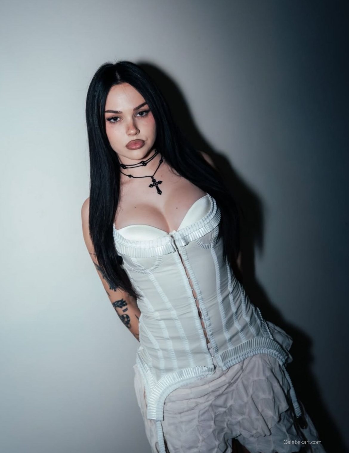The focal point of Maggie's look is undoubtedly her white dress, which features intricate details that accentuate her silhouette. The dress hugs her figure, revealing a beautiful neckline and structured design. Complementing this ensemble, she accessorized with layered necklaces, including a distinct black cross pendant that adds an edge to her outfit. The gentle lighting in the images captures the softness of her look, highlighting her confident pose against a contrasting backdrop.