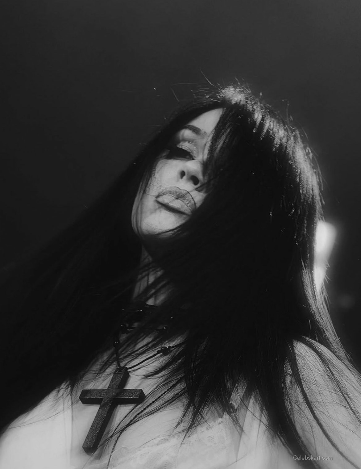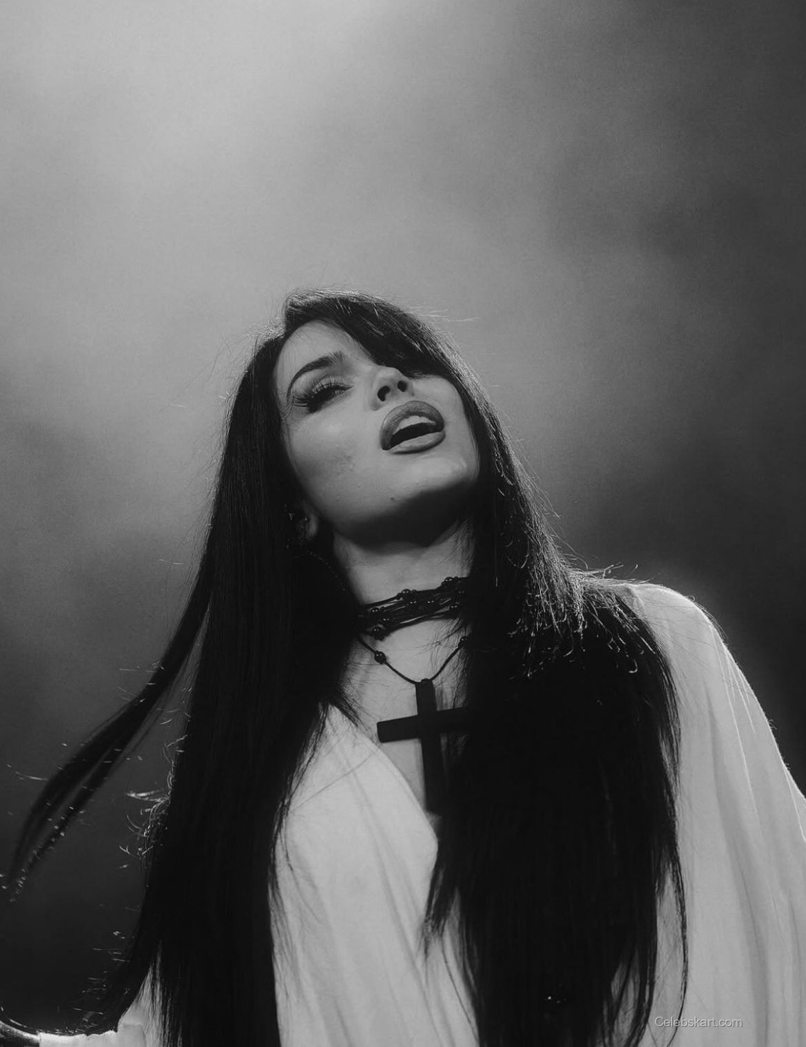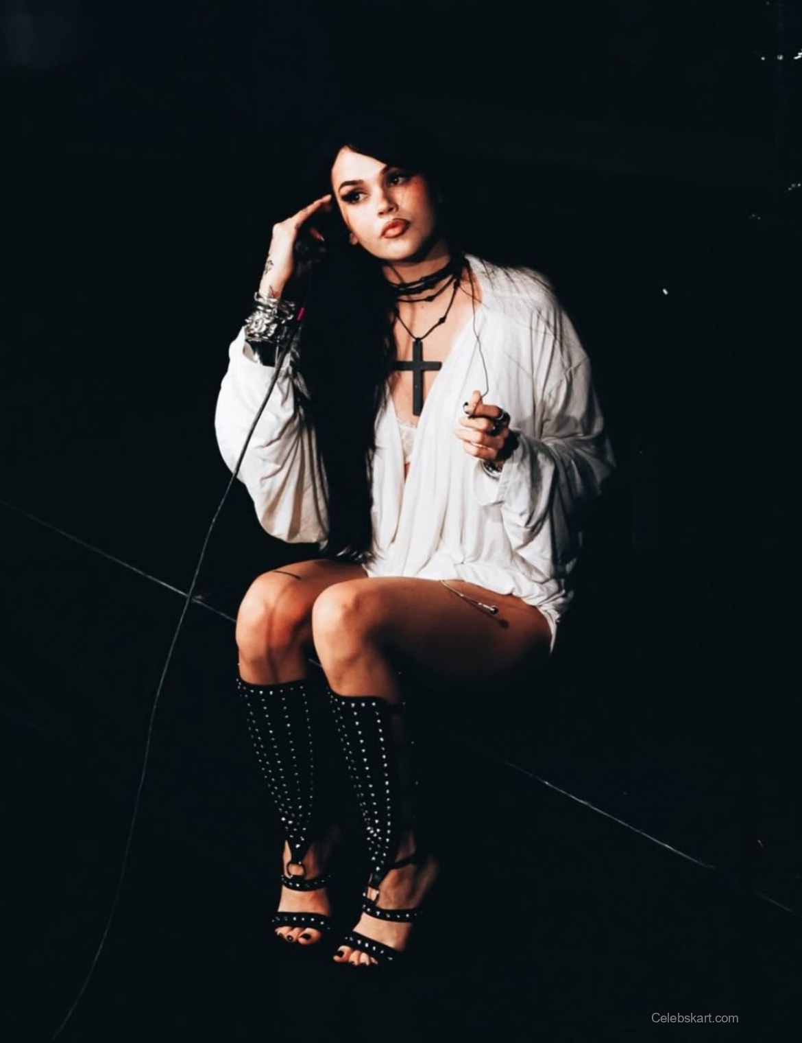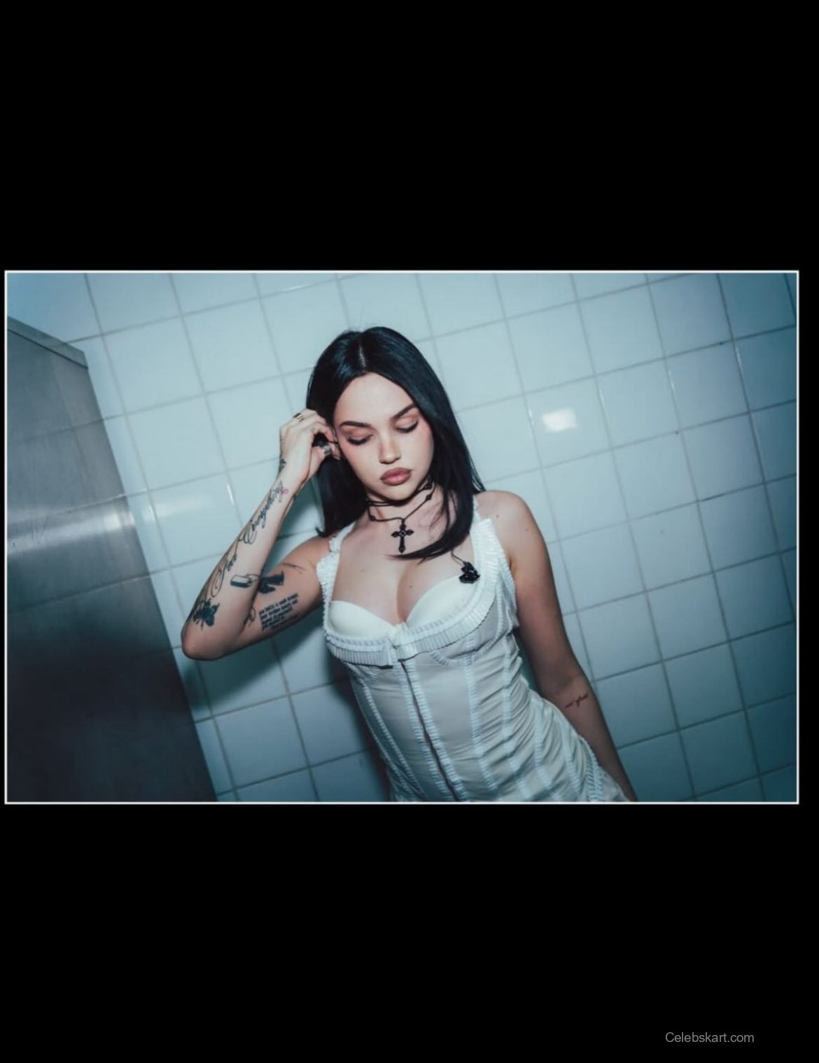 The focal point of Maggie's look is undoubtedly her white dress, which features intricate details that accentuate her silhouette. The dress hugs her figure, revealing a beautiful neckline and structured design. Complementing this ensemble, she accessorized with layered necklaces, including a distinct black cross pendant that adds an edge to her outfit. The gentle lighting in the images captures the softness of her look, highlighting her confident pose against a contrasting backdrop.