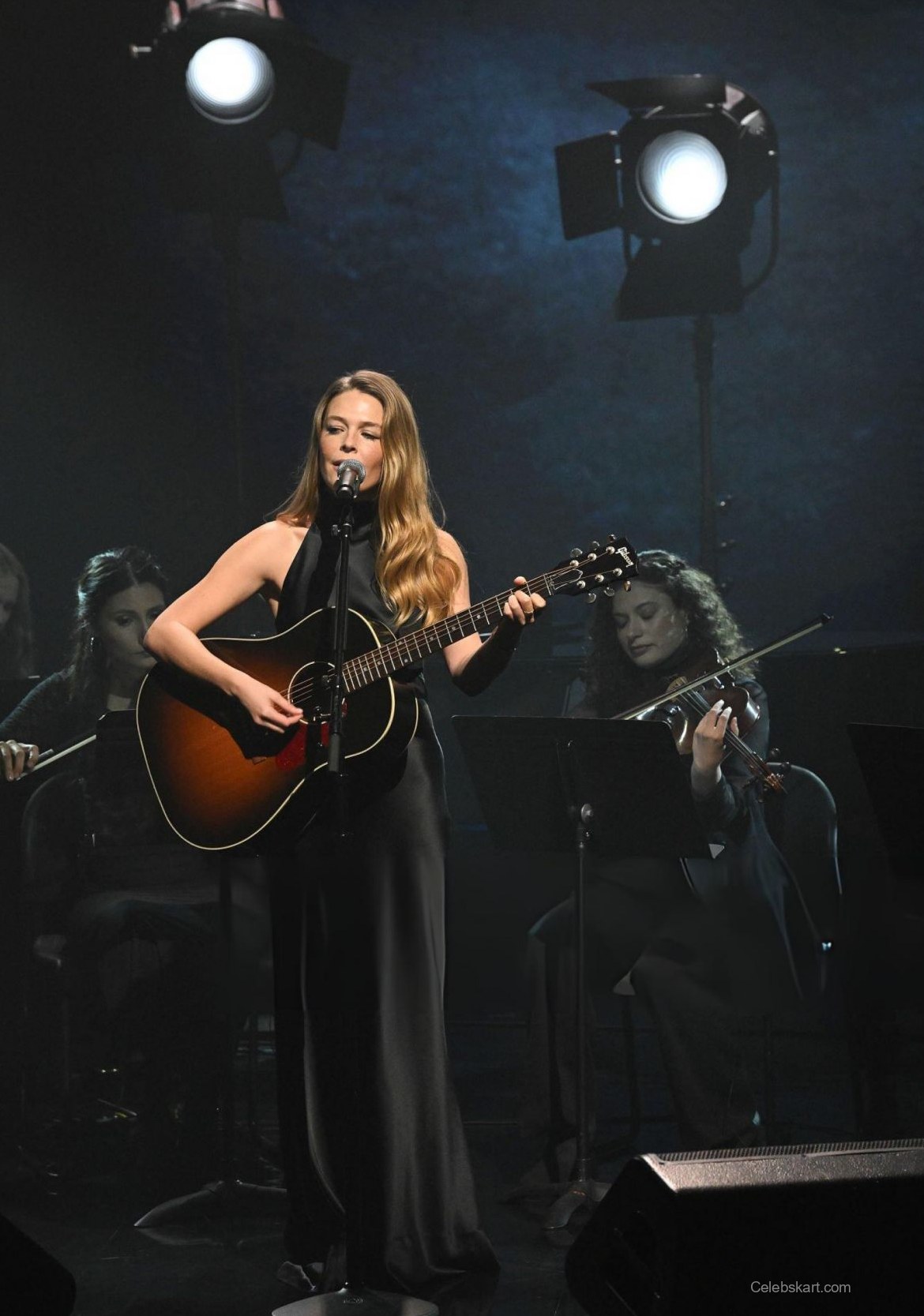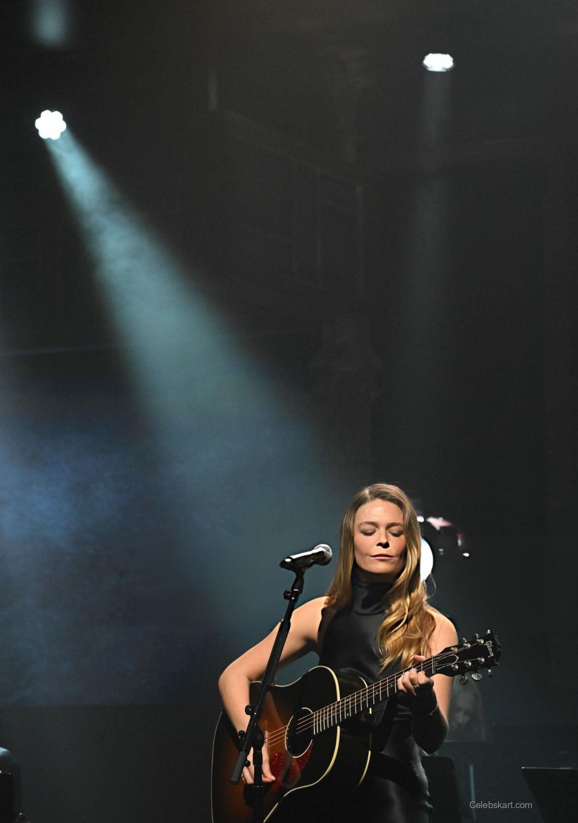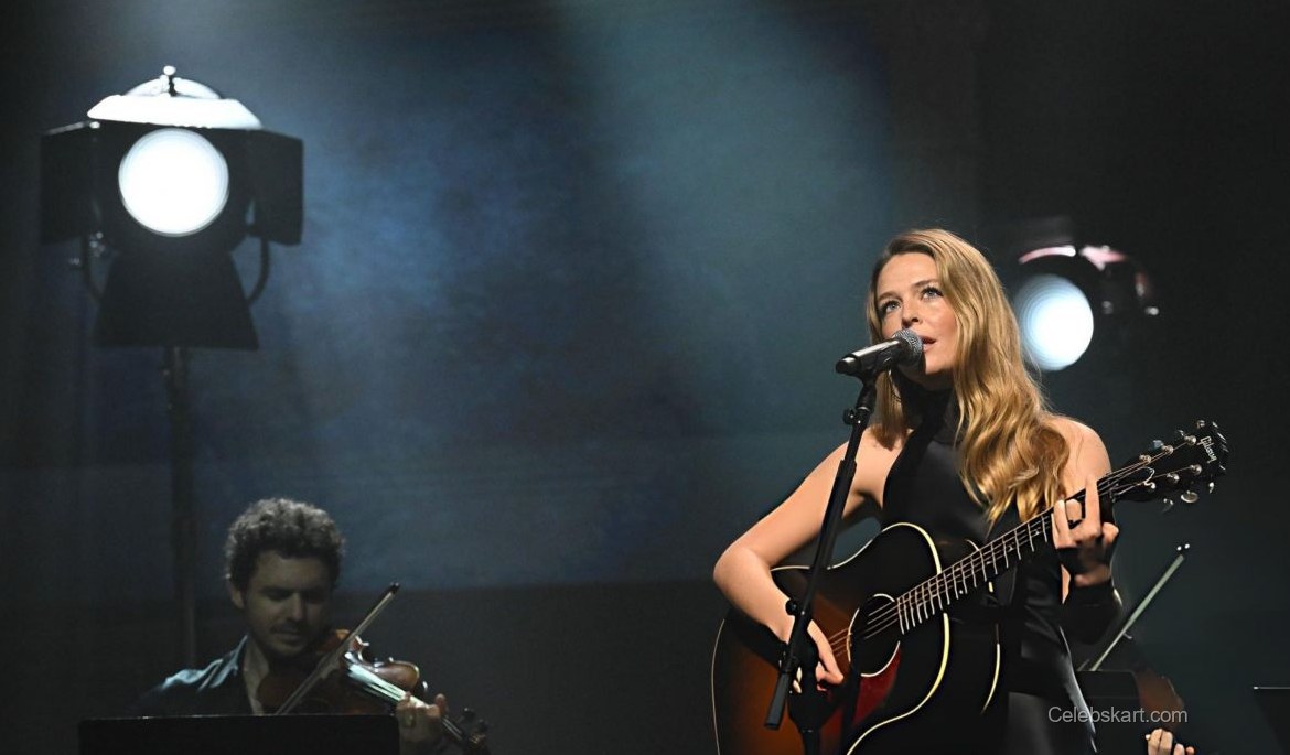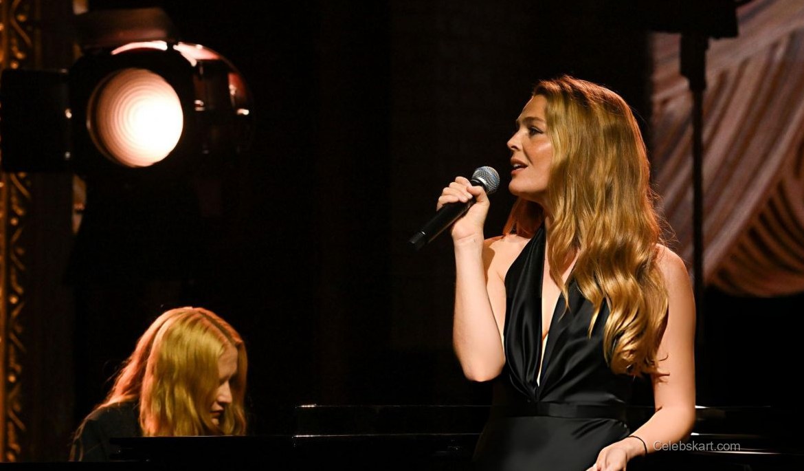 On stage, Maggie looked stunning in a sleek black gown that flowed gracefully with her movements. The dress featured a fitted bodice, highlighting her figure as she strummed her guitar passionately. The minimal yet impactful design allowed her natural beauty and talent to take center stage. The choice of black fabric contrasted beautifully with the warm spotlight, creating a magnetic visual effect, drawing the audience's eyes towards her.