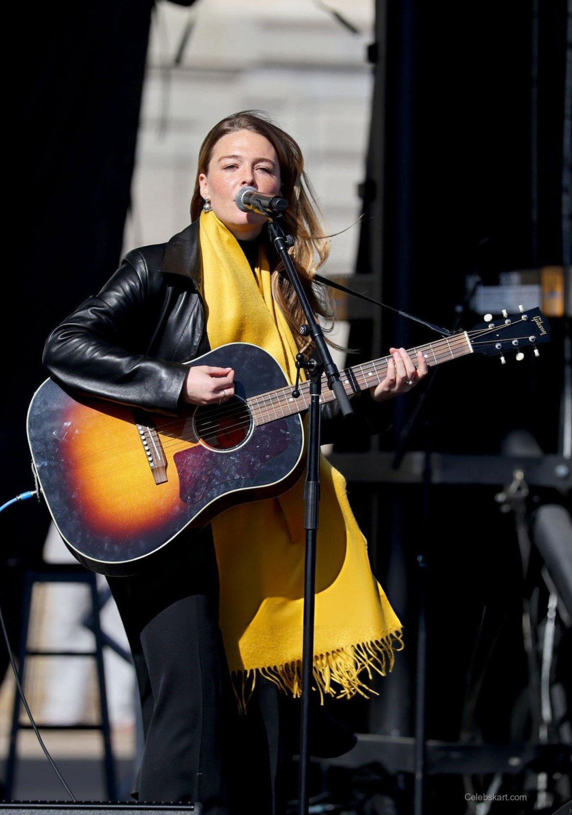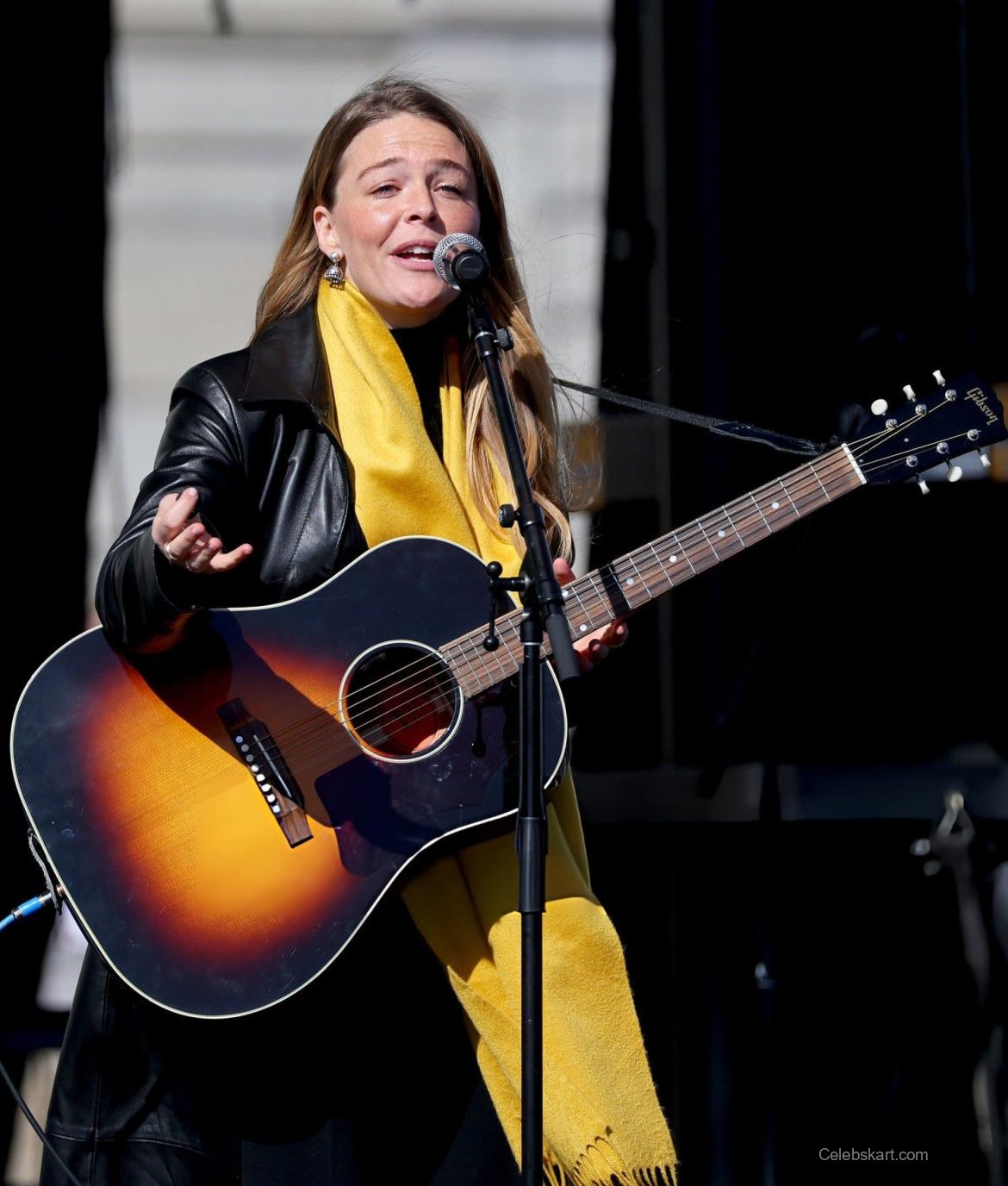 Rogers stepped onto the stage wearing a chic black leather jacket, paired with a striking yellow scarf that flowed elegantly around her. The contrast of colors highlighted her confident demeanor as she strummed her guitar. The jacket's texture added a rebellious edge, while the bright scarf brought a cheerful vibrancy to her look. The all-black ensemble, complemented by dark trousers, showcased her modern style and made her stand out against the backdrop of the event.