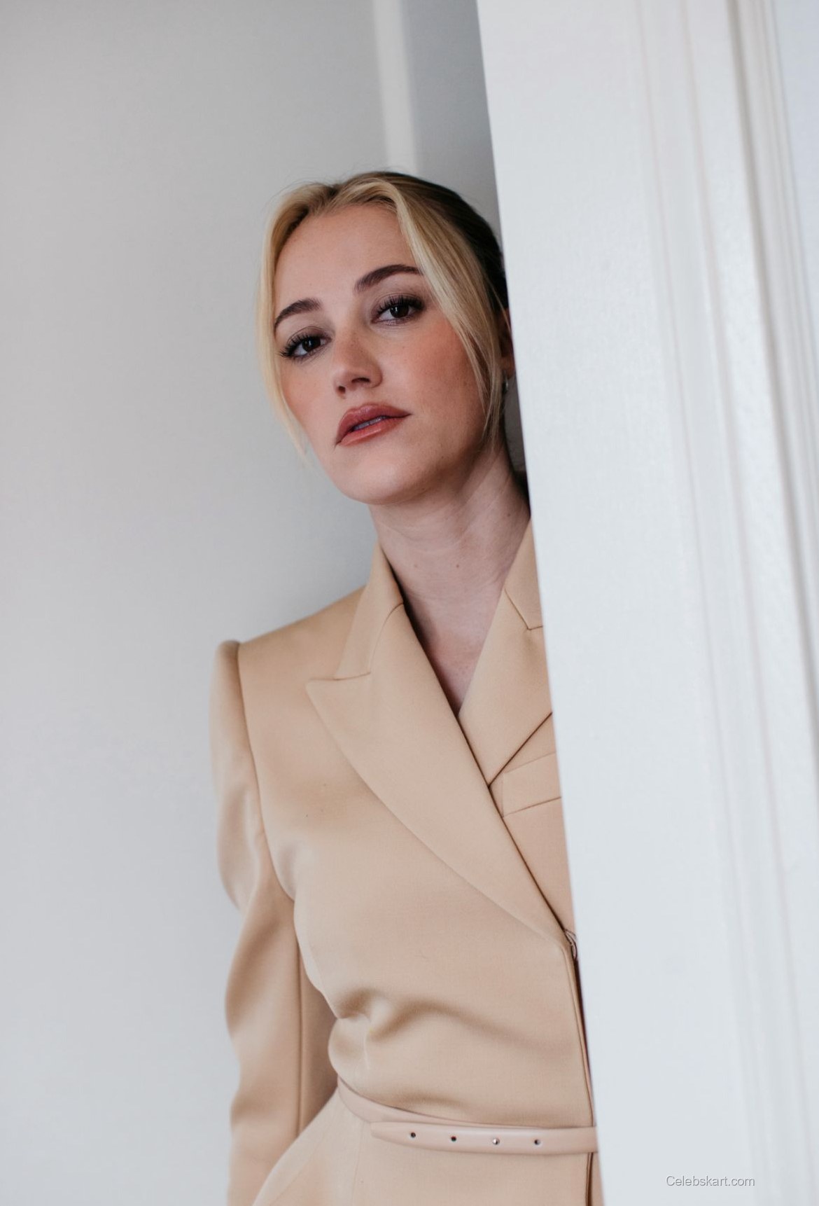 In this remarkable photoshoot, Maika Monroe channels sophisticated charm with a tailored nude-blazer dress. The fabric's smooth texture beautifully contours, celebrating her silhouette while maintaining a chic, polished appearance. The gentle color complements her complexion, radiating warmth and inviting engagement. The structured shoulders add a contemporary edge, merging classic elements with current trends effortlessly. The subtle belt at the waist cinches her figure, enhancing her hourglass shape and emphasizing the dress's tailored nature.