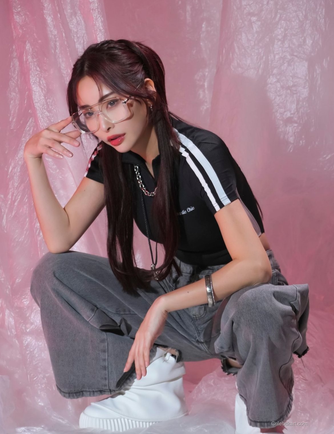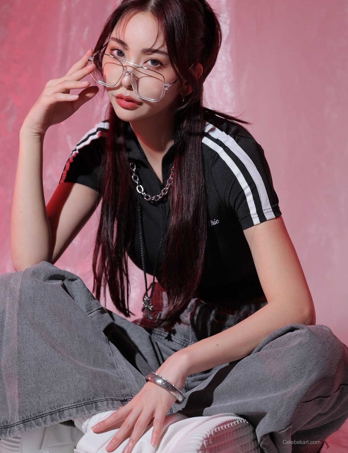 This fashionable ensemble stands out for its blend of comfort and chic urban aesthetics. The choice of oversized glasses not only serves as a stylish accessory but also adds to her approachable demeanor. The loose fit of the trousers enhances both comfort and fashion, creating a balanced silhouette. This look is an excellent representation of modern trends that emphasize individuality while maintaining a polished appearance.