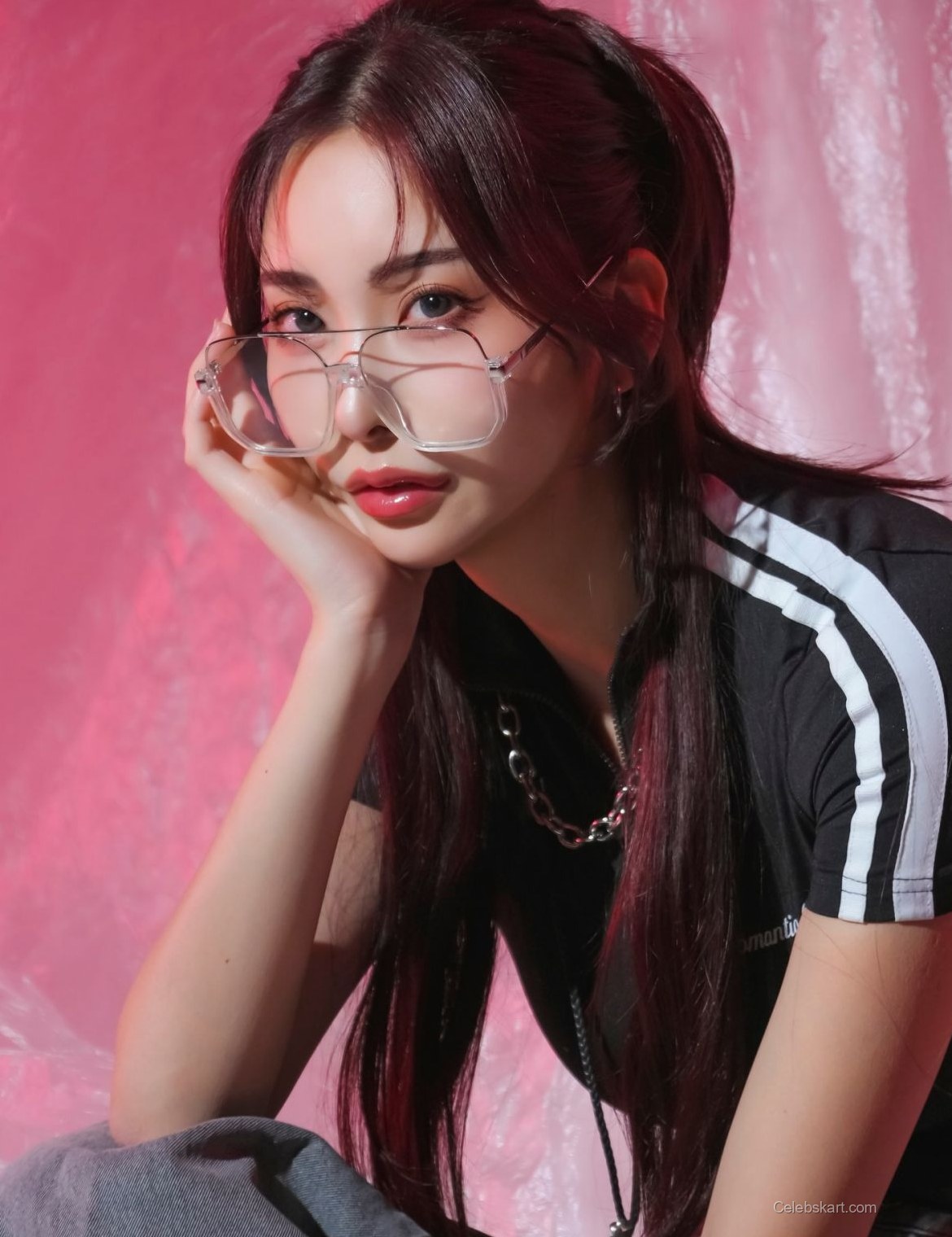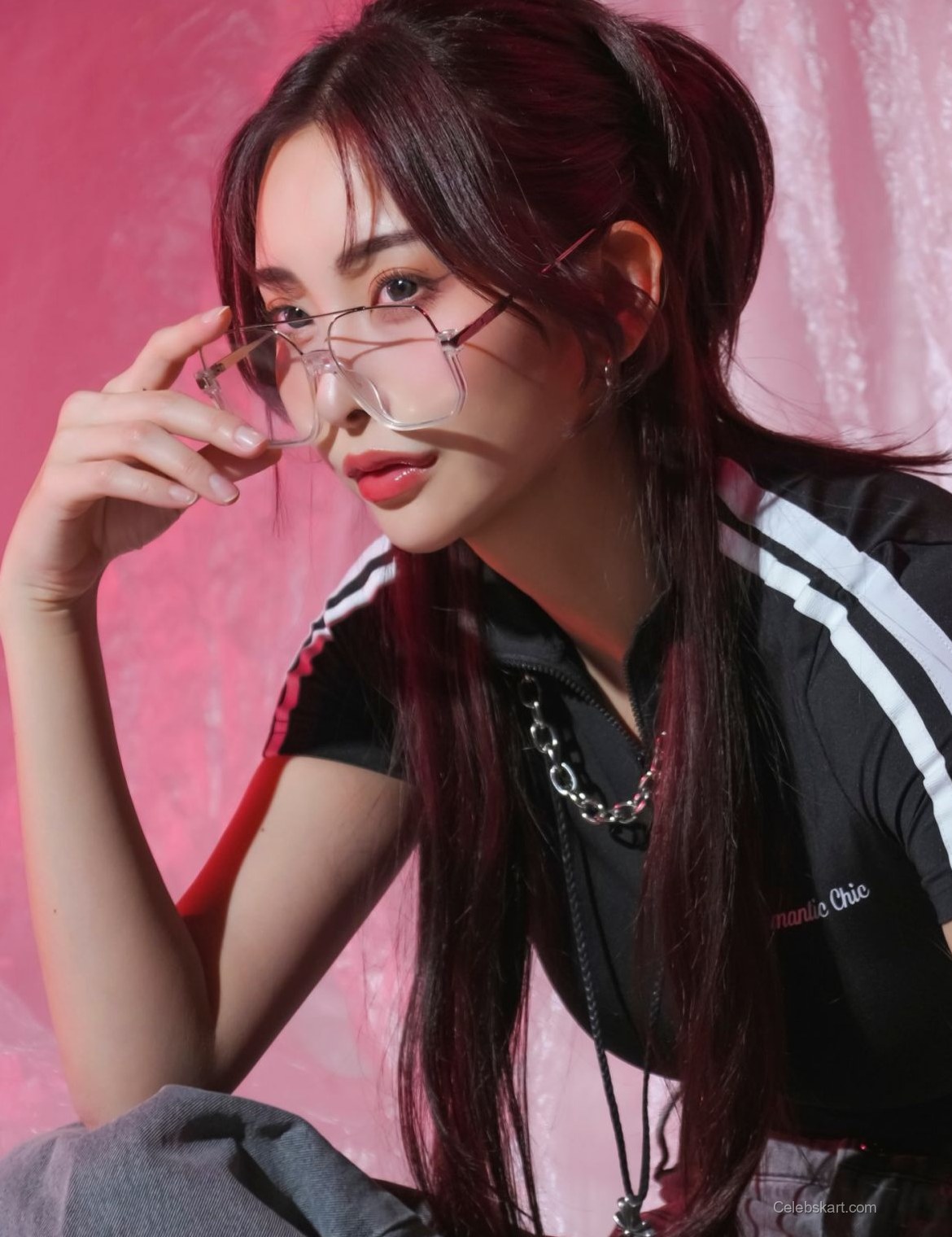 Posing effortlessly, Makoto leans on her knee, showcasing her graceful posture. Her expressive eyes are highlighted by oversized clear glasses, which bring an intellectual touch to her outfit. The soft pink background adds a dreamy element to the images, providing a perfect contrast to her darker attire. The interplay of her features and the inner glow from the background creates a visually mesmerizing scene.