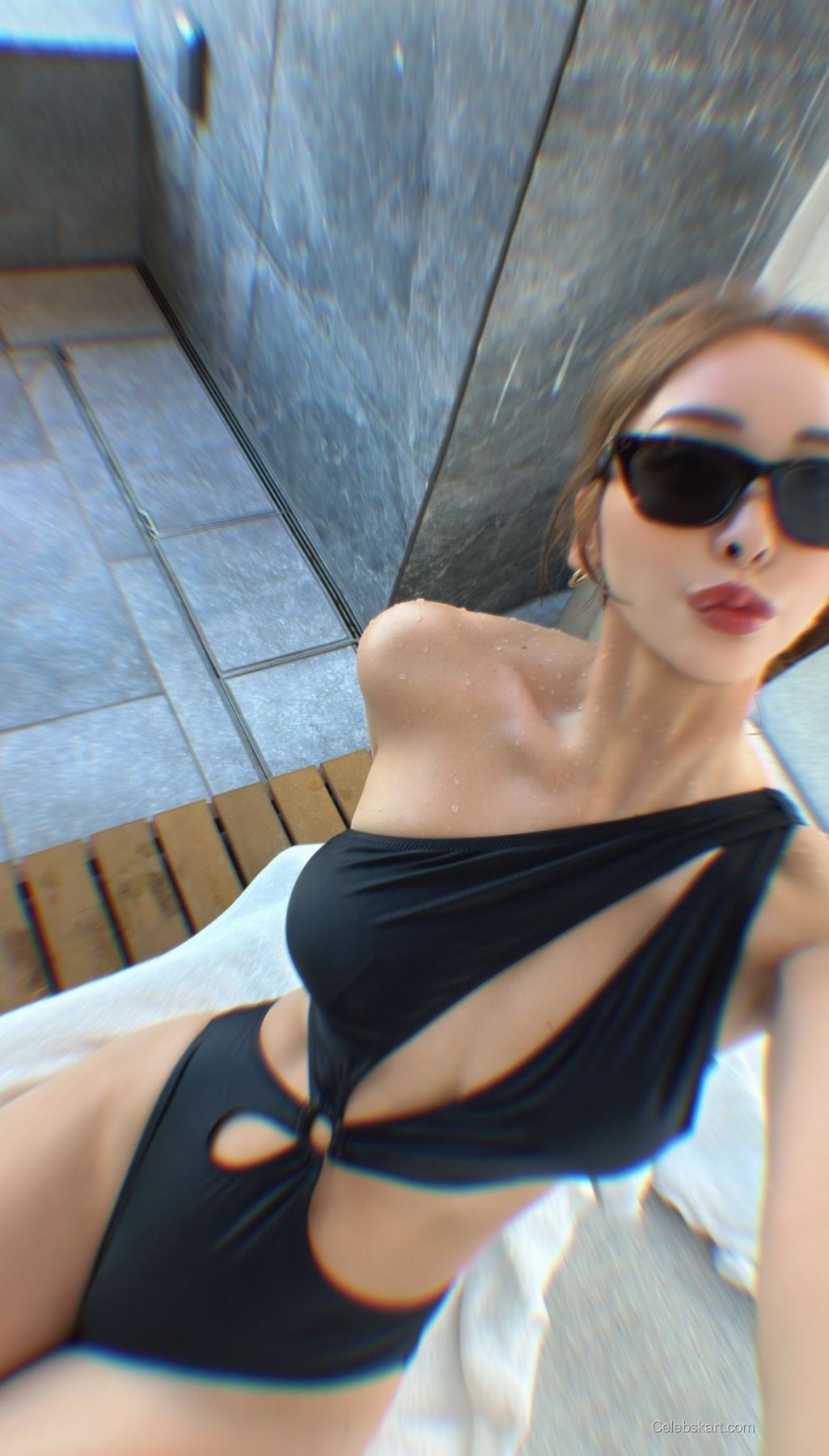 In this candid moment, Makoto is captured lounging on a white towel, with droplets of water glistening on her skin, suggesting she recently enjoyed a dip in the pool. The backdrop features sleek gray tiles that enhance the modern aesthetic of her surroundings. Her hair is styled in loose waves, framing her face beautifully as she leans slightly towards the camera, creating a captivating pose.