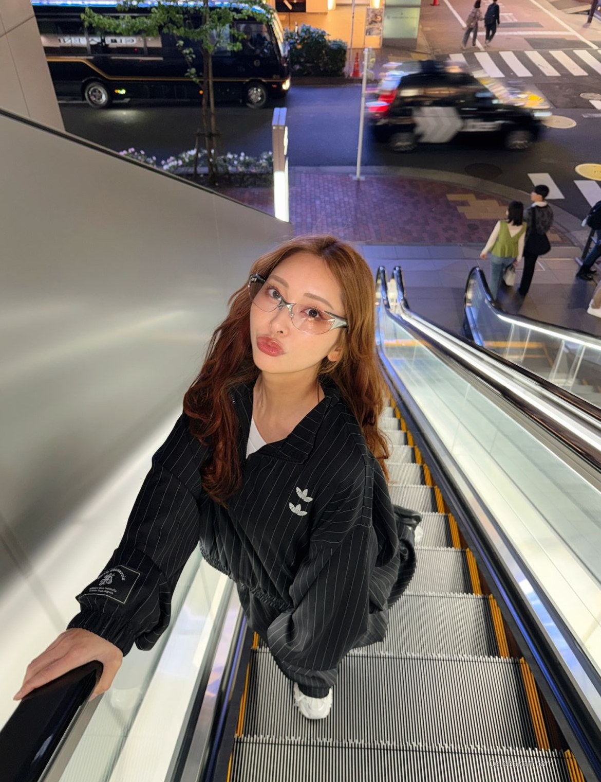 Positioned on an escalator, Makoto poses playfully. One moment captures her leaning against the railing with a soft smile, while another shows her adjusting her glasses as she gazes at the camera. The urban backdrop highlights the bright city lights, creating a stunning contrast with her dark attire. Her hair flows naturally, framing her face beautifully, and emphasizes her joyful expression.