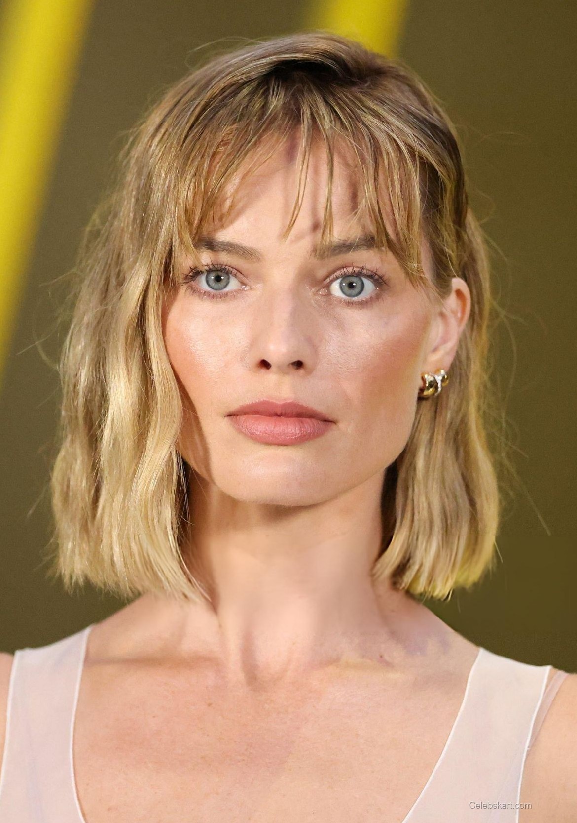 As she walked gracefully down the runway, Margot exuded confidence and charm. Her hair, styled in soft waves, framed her face nicely, enhancing her natural beauty. The vibrant yellow background at the show complemented her attire, making her outfit pop even more. The lighting created an ethereal ambiance, accentuating every detail of her stunning look.