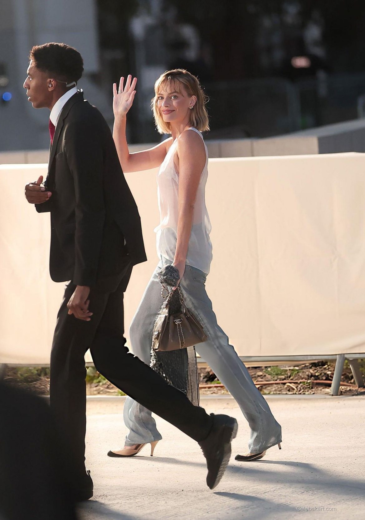 Robbie's ensemble featured a stylish sheer top that offered a glimpse of layering, perfectly complemented by high-waisted light blue jeans. The translucence of her top added a refreshing twist, making it a standout piece. She accessorized with a chic statement bag that contrasted beautifully with her outfit and a touch of unique jewelry that added elegance. The entire look was tailored to create a modern yet timeless vibe.