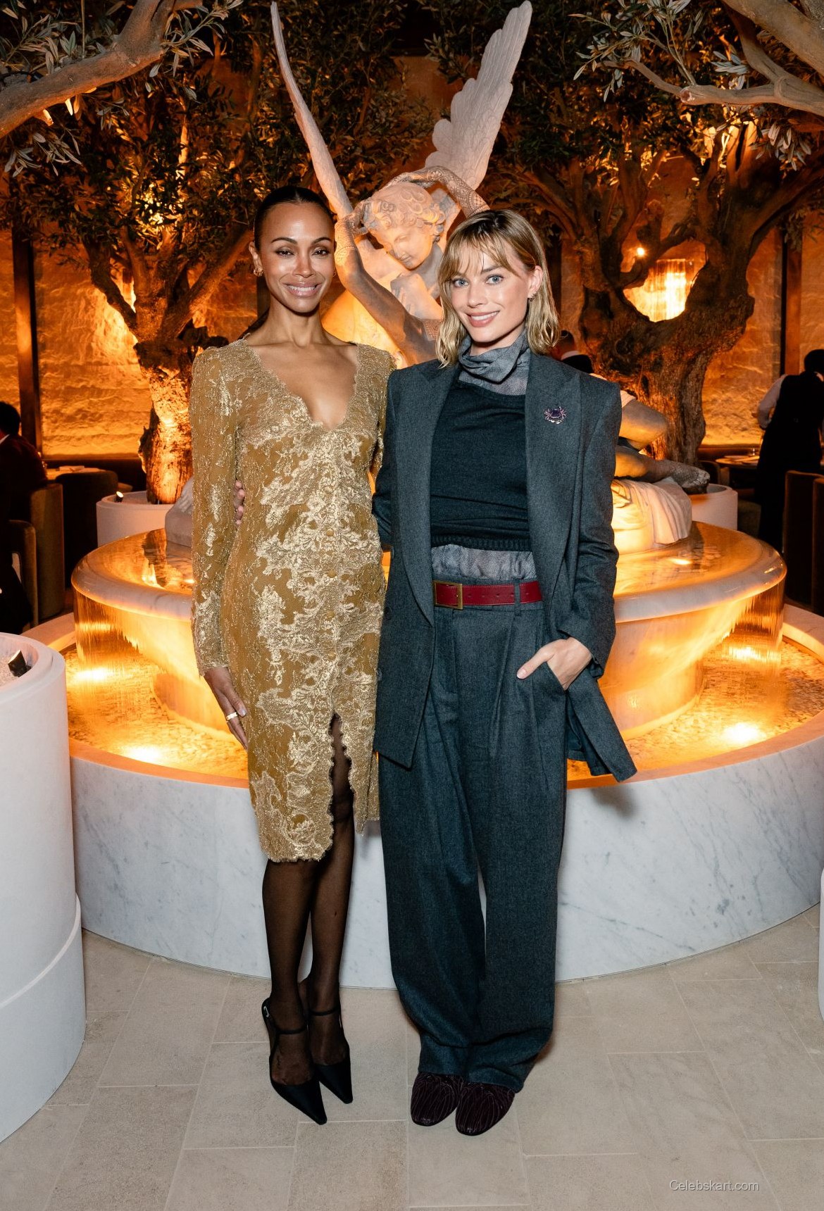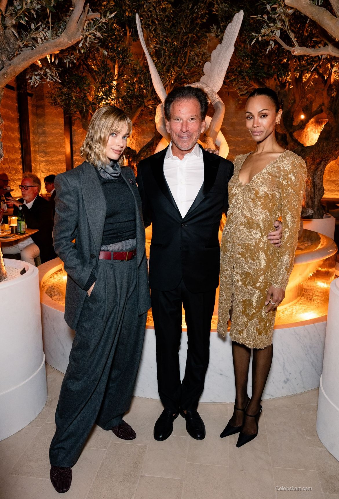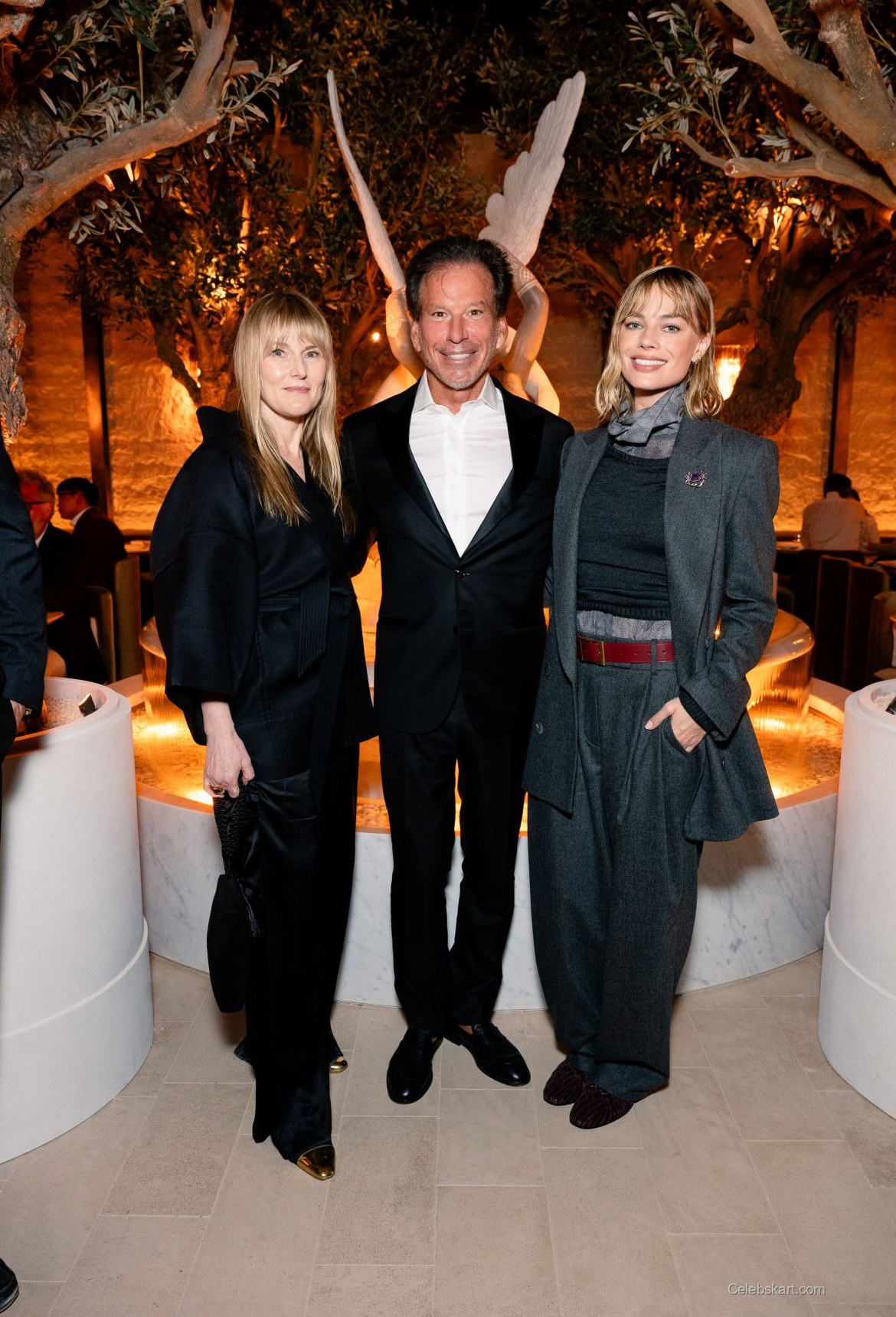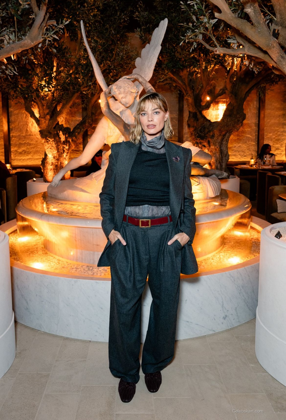 In the backdrop of a stunning venue adorned with olive trees and a striking marble fountain, Robbie exuded confidence. Her hair was styled in soft waves that framed her face, giving her an effortlessly chic appearance. The warm lighting of the venue highlighted her features, creating a captivating atmosphere. As she posed for photos, her demeanor was relaxed yet poised, showcasing her ability to command attention effortlessly.