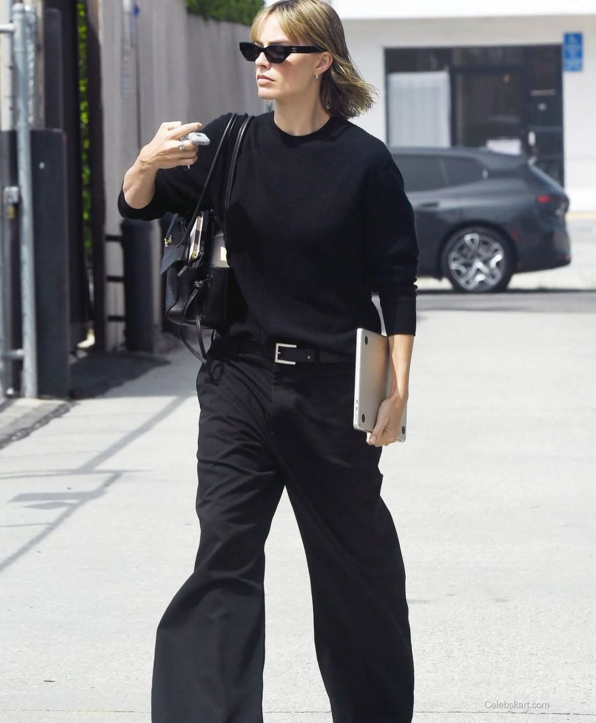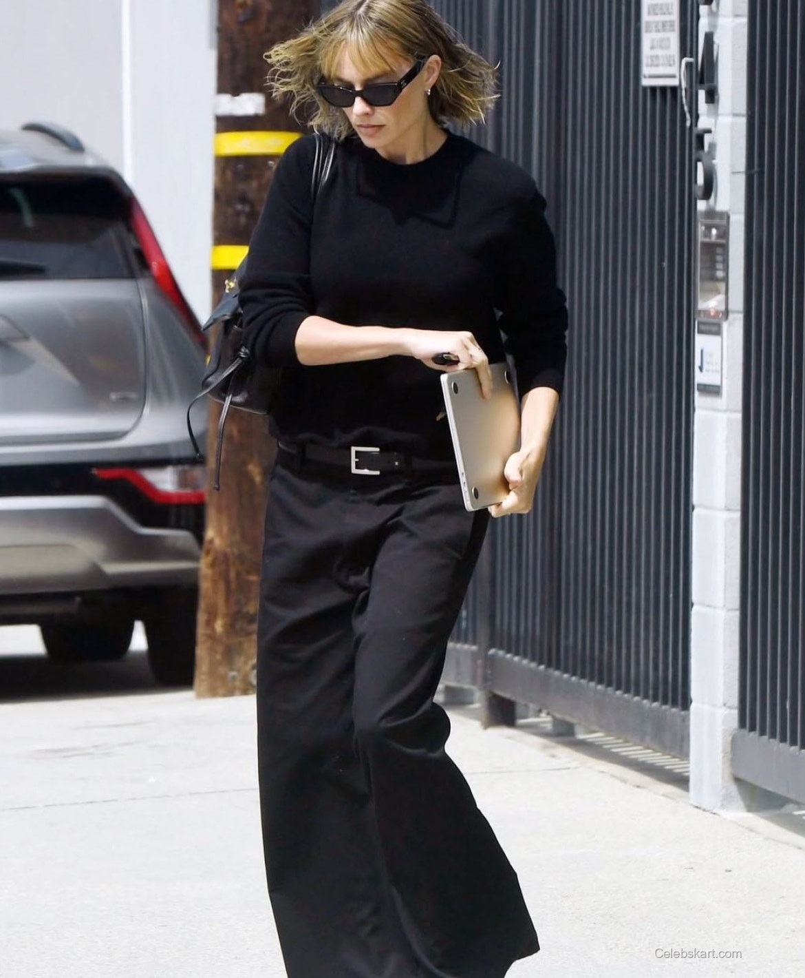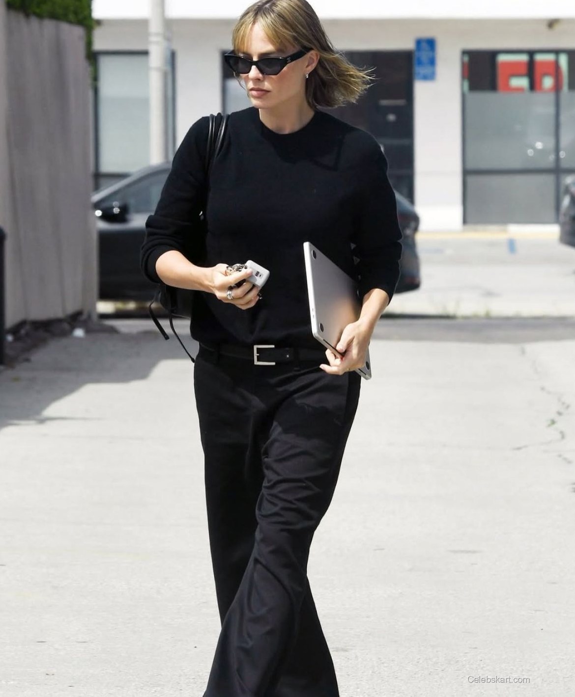 Margot Robbie was spotted leaving her office in Los Angeles, showcasing her sleek style in all black. The actress carried a laptop and a smartphone, epitomizing modern chic while effortlessly combining function and fashion. Her outfit captures her characteristic flair, leaving a striking impression.