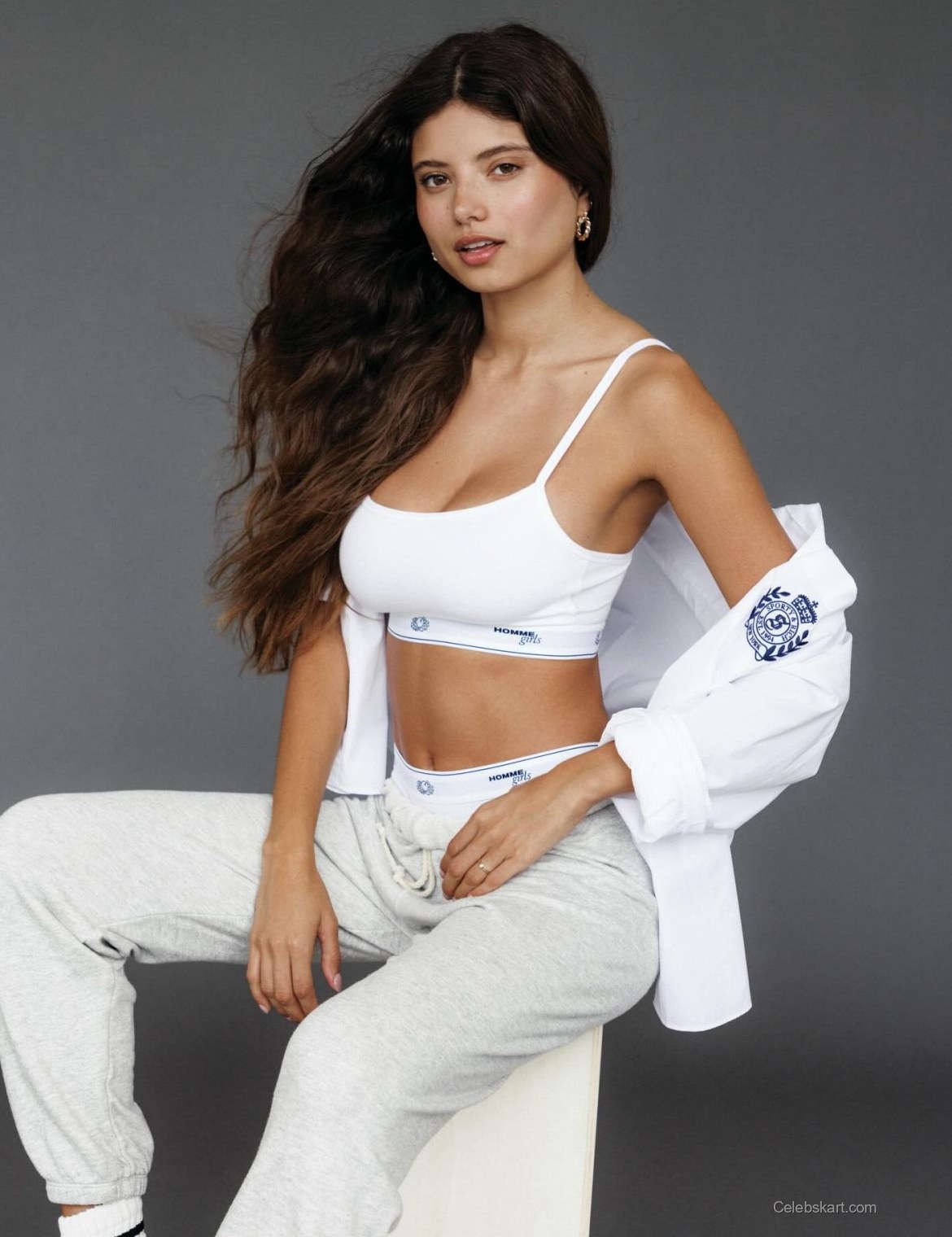 Maria’s outfit is centered around a fitted white crop top that highlights her silhouette. Paired with soft, grey sweatpants, this look strikes the right balance between comfortable and stylish. The ensemble is completed with a white shirt artistically draped over her shoulder, adding a layer of sophistication to an otherwise casual outfit. Together, these pieces not only fit seamlessly into modern streetwear but also exhibit a sense of effortless style.