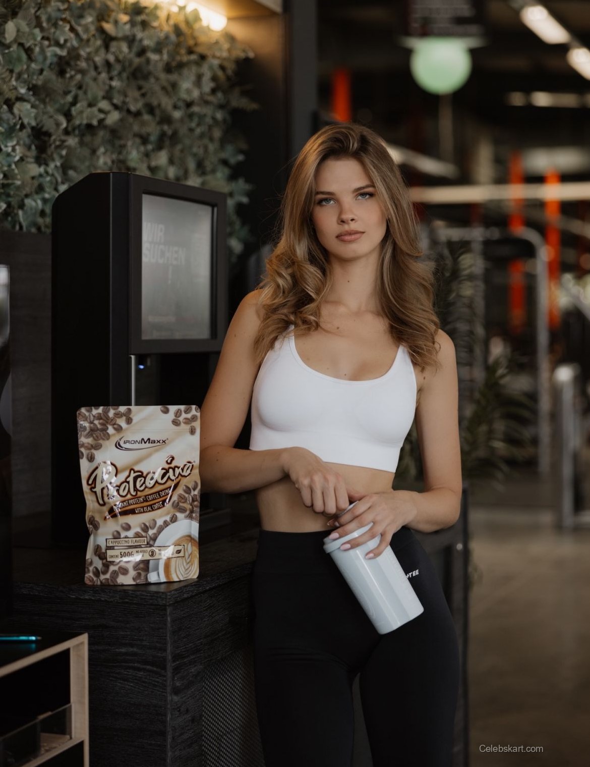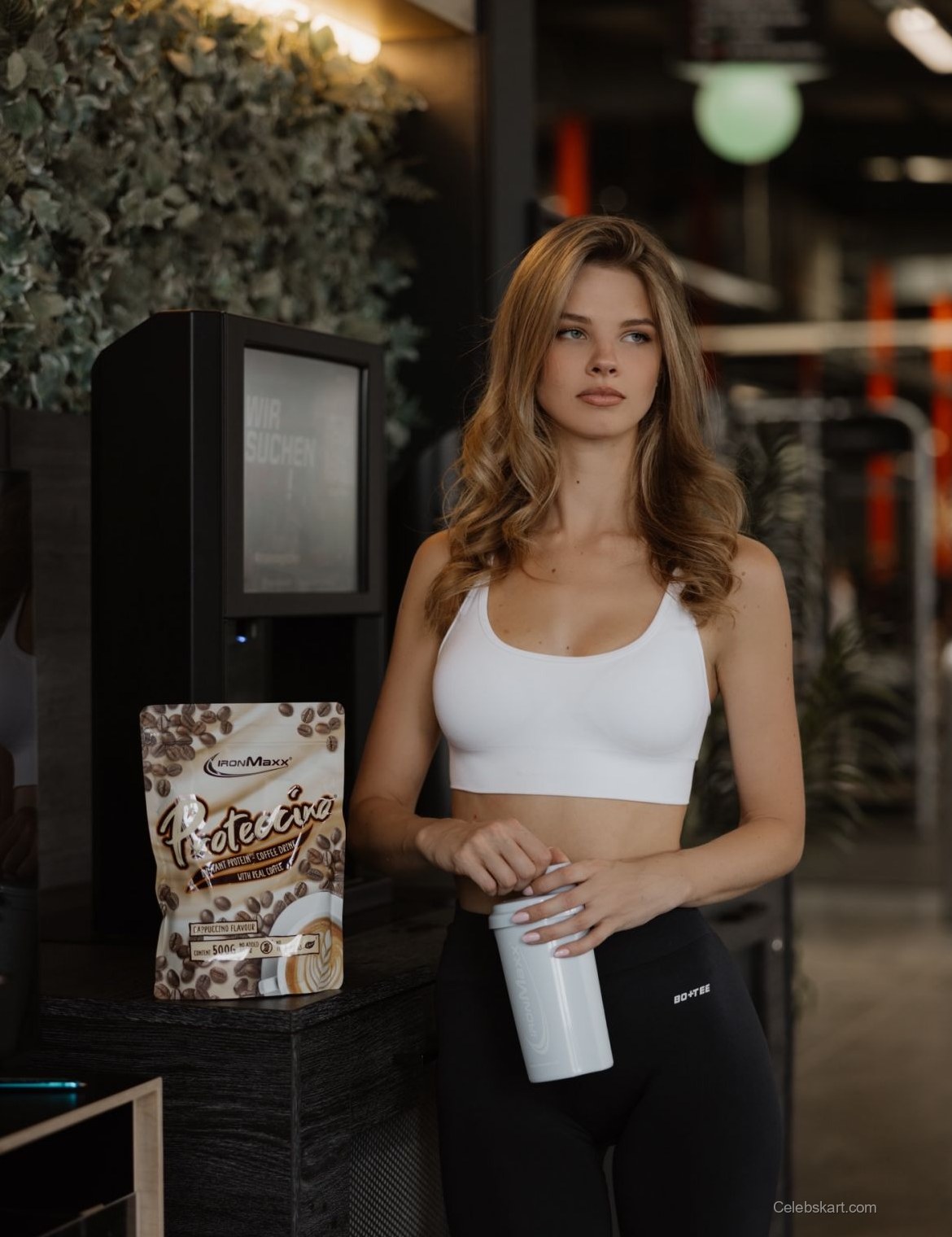As she leans against the workout machine, her relaxed pose speaks volumes about her confidence. The background, adorned with greenery, provides a fresh ambiance to the shoot, contrasting beautifully with her determined expression. At one moment, she adjusts the shaker bottle in her hand, revealing her commitment to a healthy lifestyle. Her light, tousled hair frames her face perfectly, emphasizing her natural beauty.