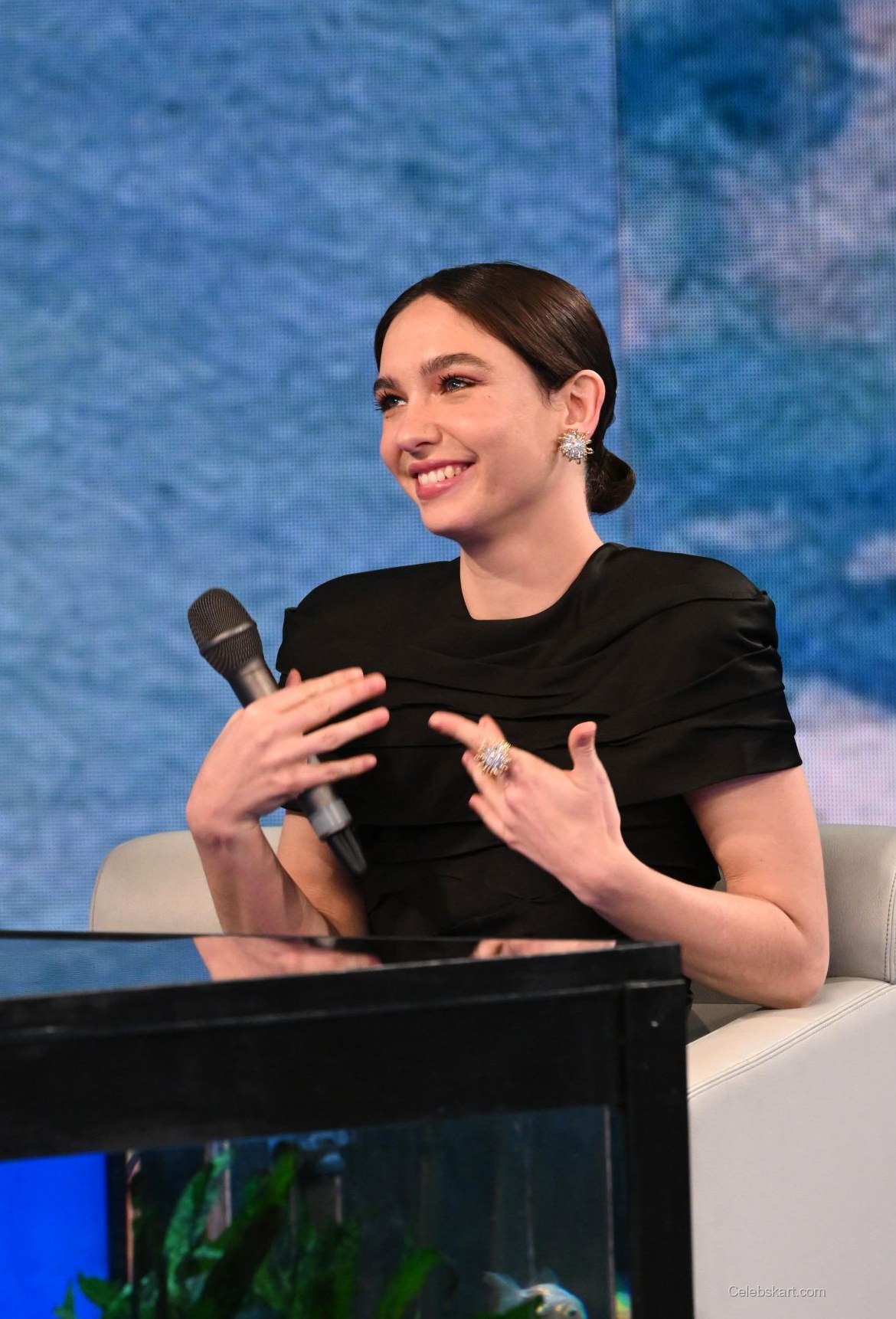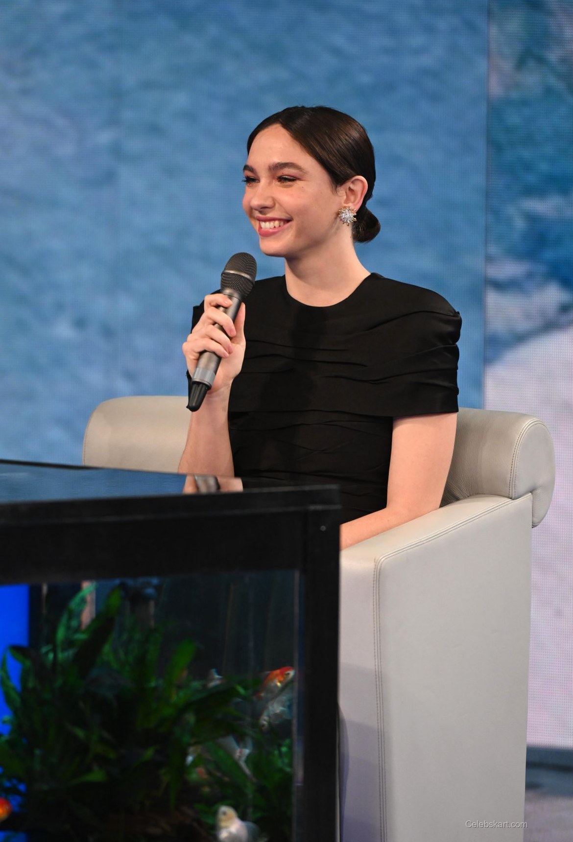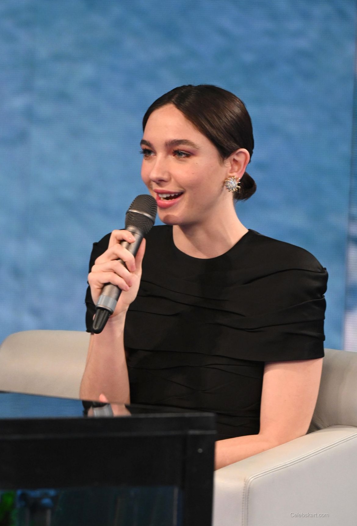 During her appearance, Matilda confidently held a microphone while interacting with the audience, capturing the attention of everyone around her. Her soft, swept-back hairstyle complemented her look, allowing her striking features to take center stage. As she smiled and engaged with guests, her bright demeanor was enhanced by her choice of dazzling earrings, which glimmered subtly under the stage lights.