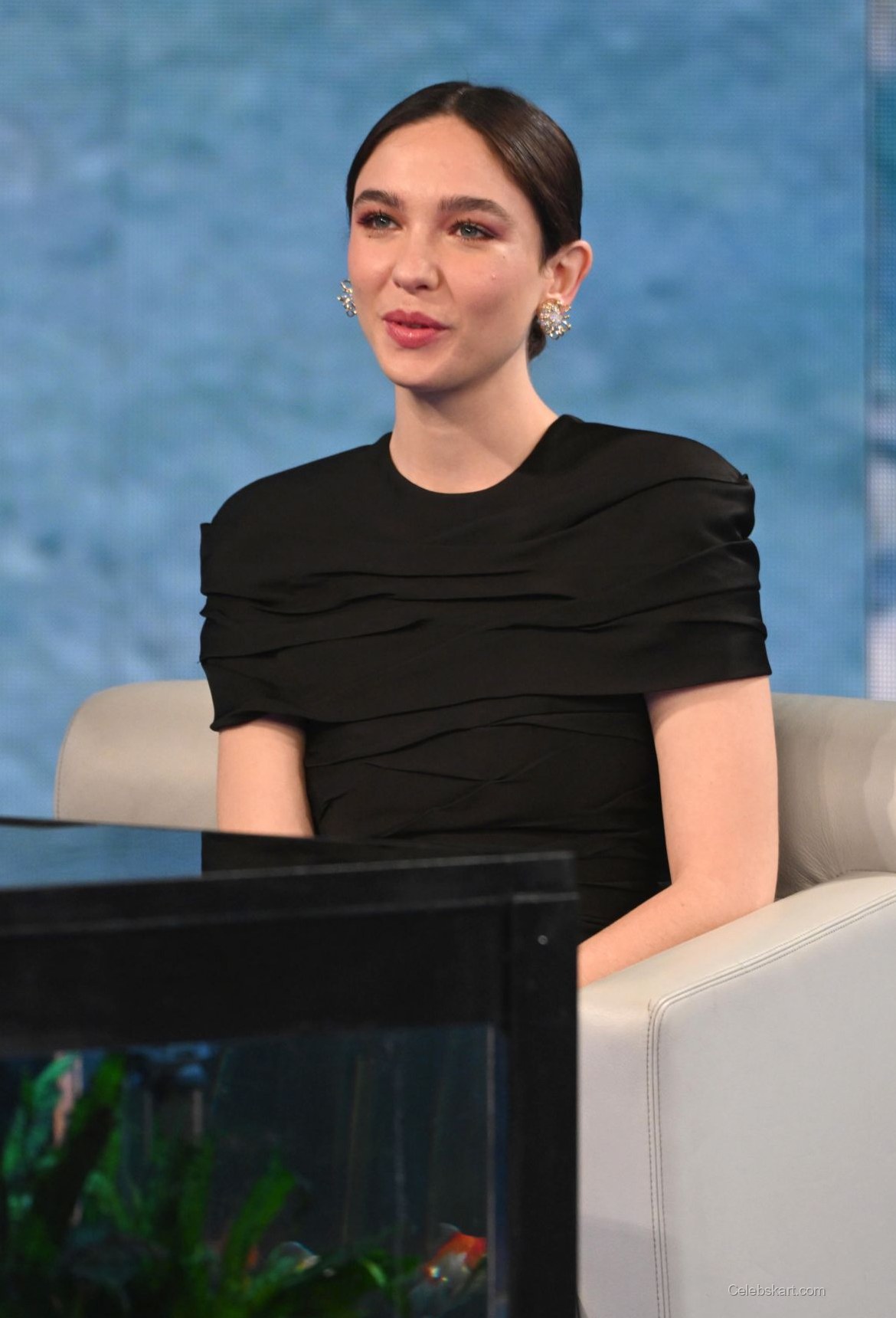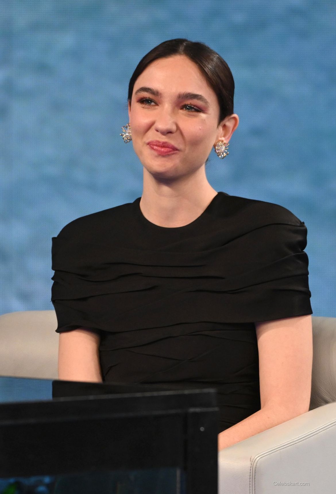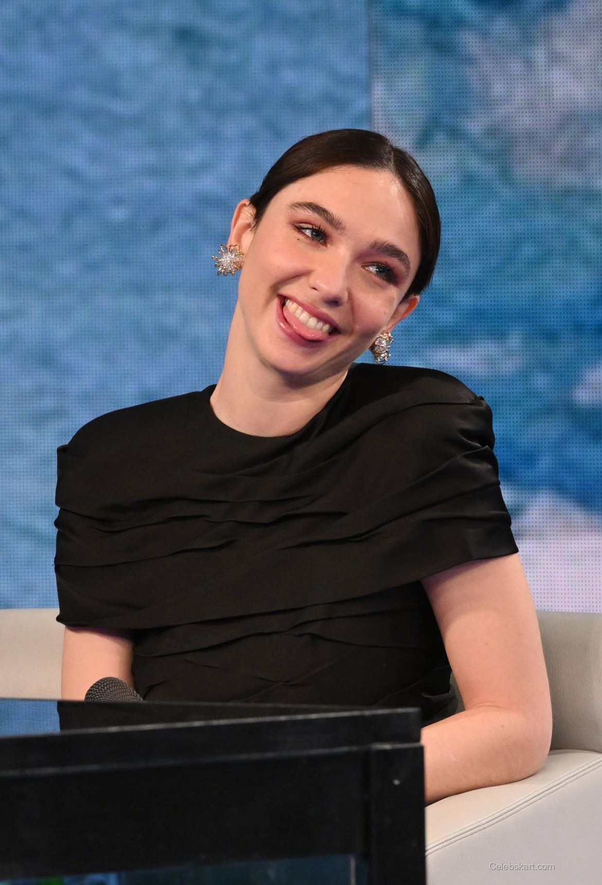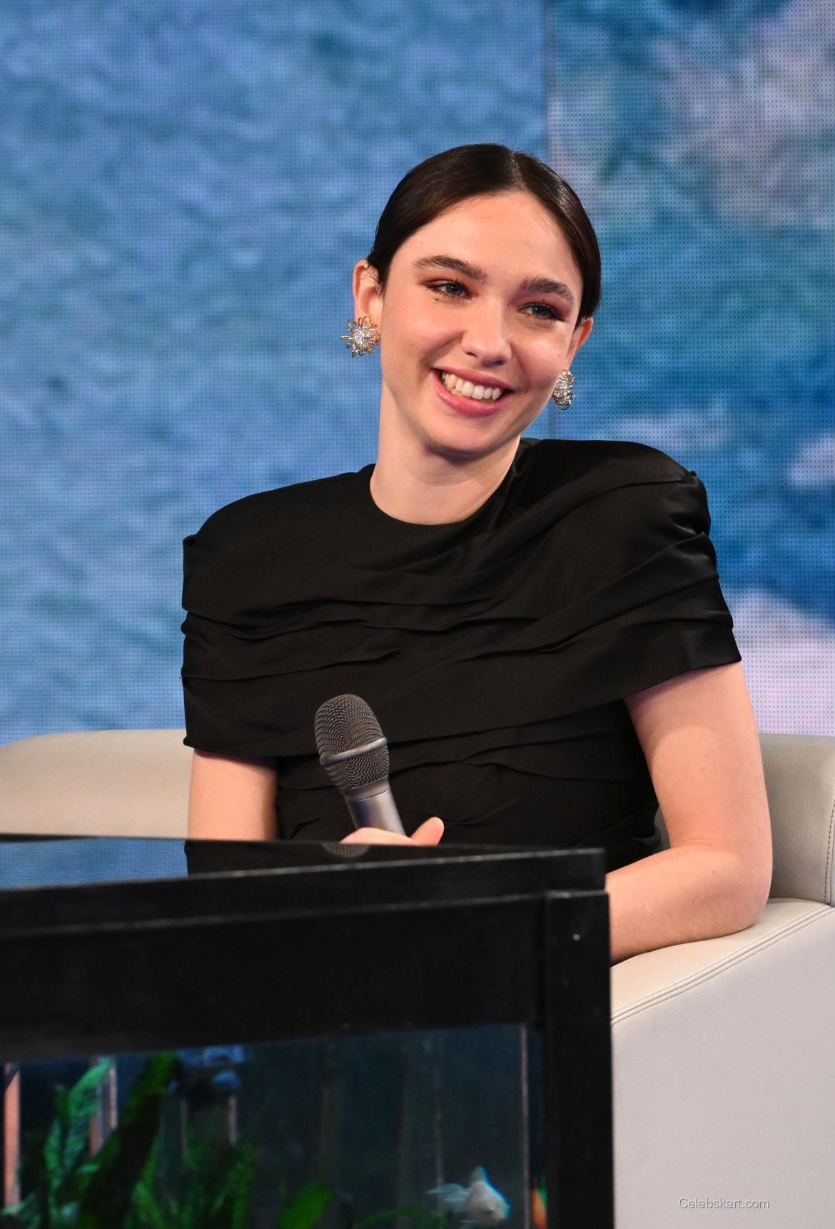 During her appearance, Matilda confidently held a microphone while interacting with the audience, capturing the attention of everyone around her. Her soft, swept-back hairstyle complemented her look, allowing her striking features to take center stage. As she smiled and engaged with guests, her bright demeanor was enhanced by her choice of dazzling earrings, which glimmered subtly under the stage lights.