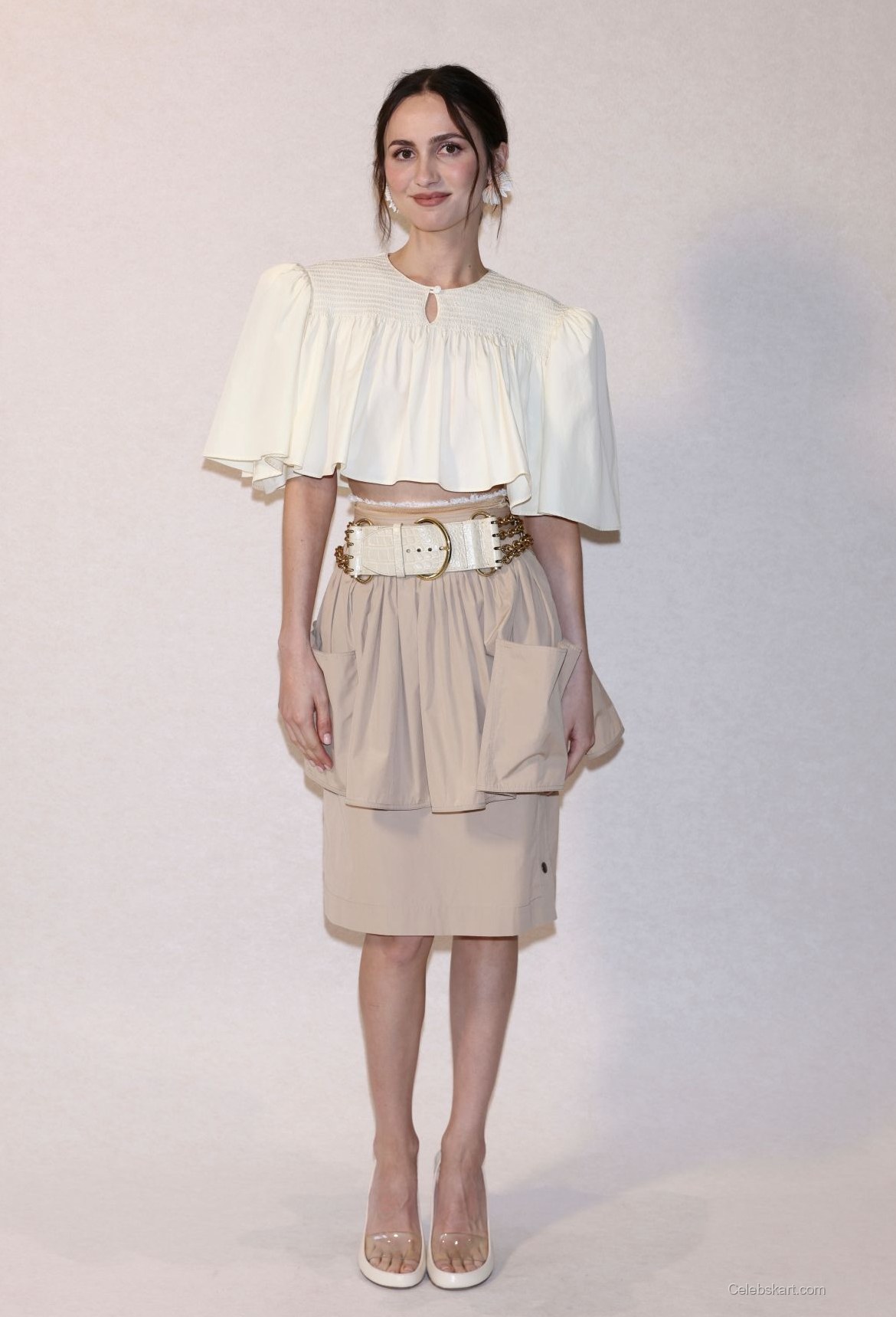 Her outfit featured a stunning cropped white top with puffed sleeves, perfectly complemented by a beige pleated skirt. The eye-catching belt around her waist added a fashionable edge to the look. The combination of light colors created a fresh and sophisticated contrast, perfect for the runway.