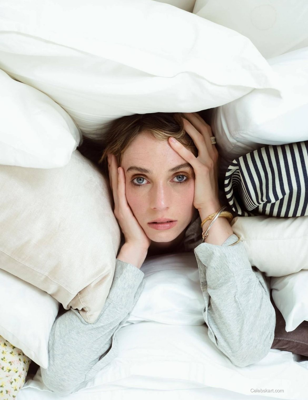 In this serene moment, Maya is captured lying on the bed, with her hair cascading softly around her shoulders. The background hints at a lush, dreamy environment, enhancing the softer tones of her outfit. A close-up reveals the delicate detail of her makeup, accentuating her features without overwhelming her natural charm. This styling is a refreshing departure from typical high-fashion looks, reminding us of the power of simplicity. To see more of her incredible styling choices, check out Maya's prior appearances.
