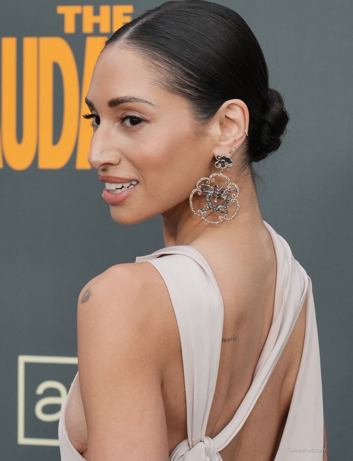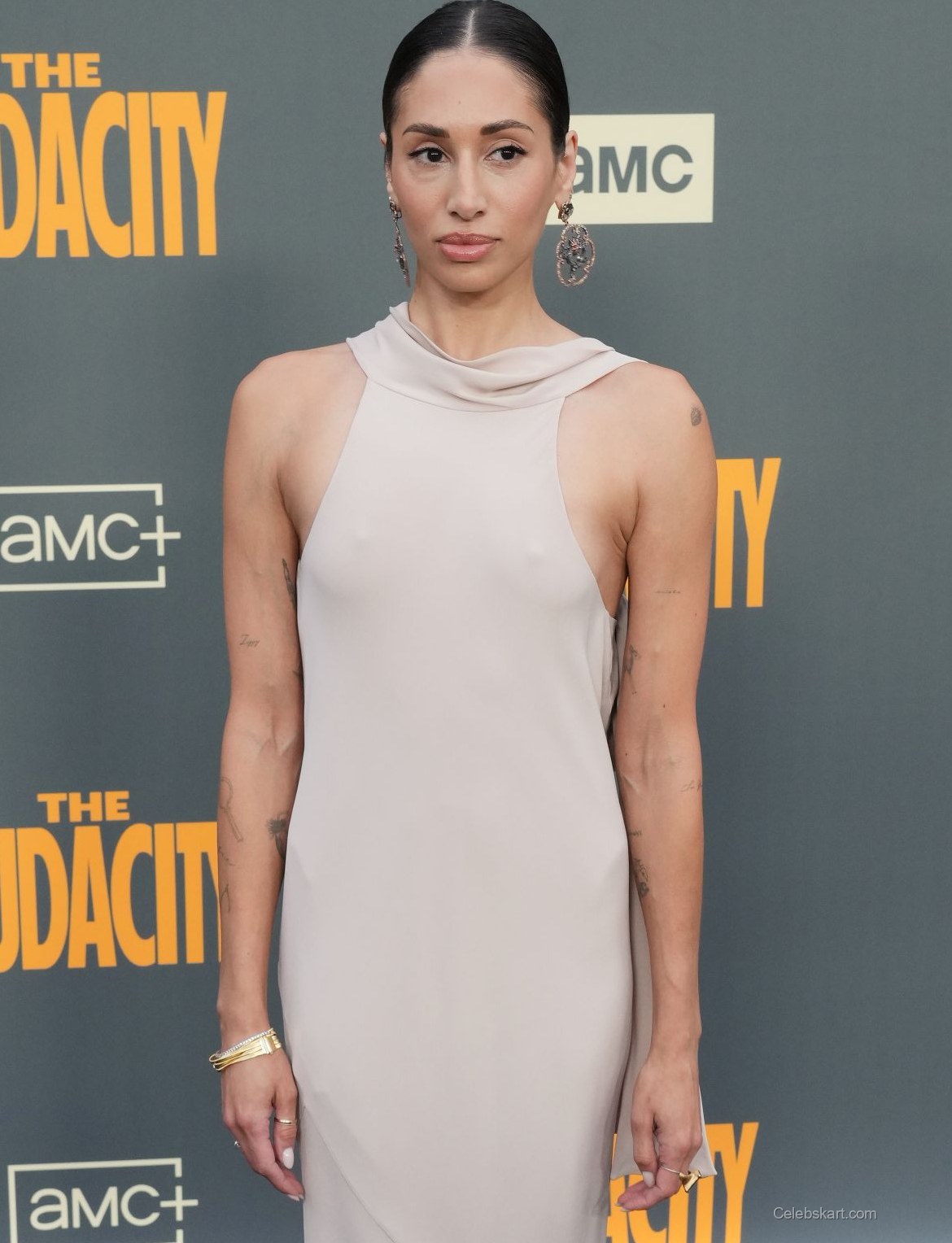 Meaghan posed confidently, showcasing her outfit from various angles. With her hair slicked back, she highlighted her accessories, particularly her stunning earrings. These added a layer of glamour to her overall presentation, enhancing her sophisticated style. As she adjusted her gown for the cameras, the elegance of her pose resonated perfectly with the event's formal backdrop. To see more from this exciting event, visit this link to The Audacity premiere photos.