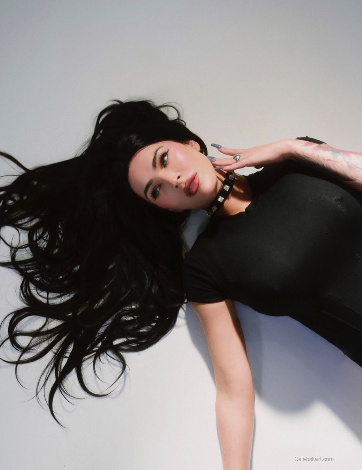 With long, flowing hair cascading down her back, Megan was photographed in dynamic poses that showcase both her outfit and personality. One moment shows her adjusting her top while laying sideways, the next captures her with a fierce expression gazing directly into the lens, illustrating her versatility. Against a soft, minimalist backdrop, her outfit stands out, making it a study in contrast. Feel free to check out more about this iconic Megan Fox photoshoot for different angles and styles.