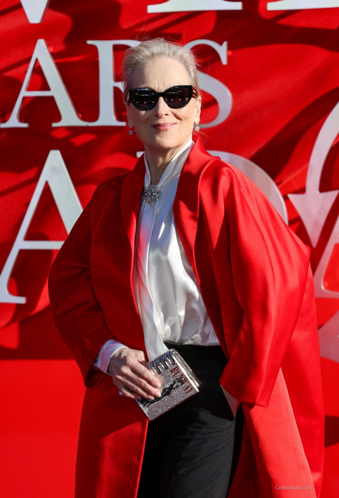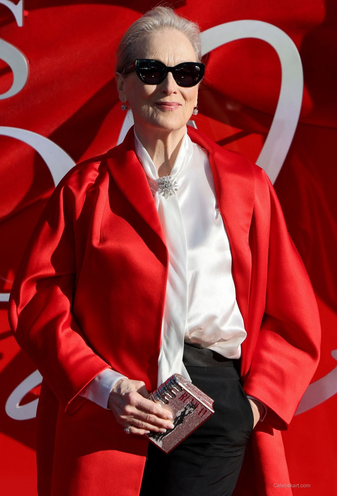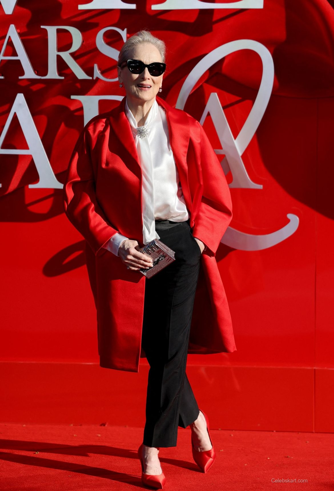 The standout piece of Meryl Streep's outfit was her vibrant red cape, which flowed elegantly around her. Beneath it, she wore a classic white silk shirt, highlighted by a tasteful brooch that added just the right amount of sparkle. Completing the look, her black tailored trousers provided contrast and sophistication, fitting her tall frame perfectly. Her choice of matching red heels not only elongated her legs but also tied the outfit together seamlessly.