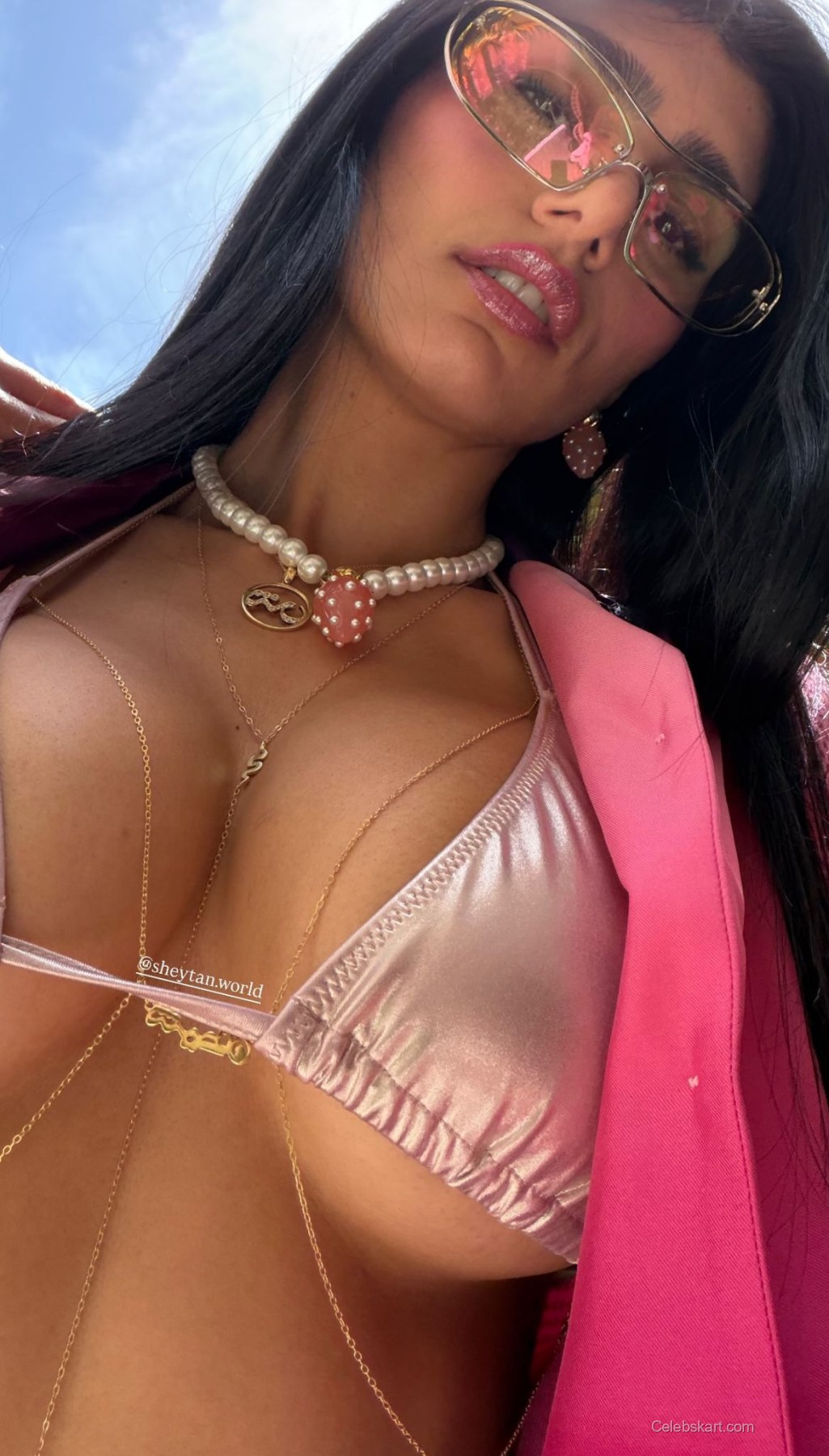 One of the reasons this look by Mia Khalifa stands out is her choice of accessories, which truly elevate her style. Wearing layered chains with intricate pendants enhances her outfit, drawing the eye and adding a personal touch. Not to mention the tinted sunglasses that give her an air of mystery while also protecting her from the summer sun. The combination of the shiny fabric of her top and the matte textures of her blazer creates a dynamic visual contrast that is both refreshing and appealing.