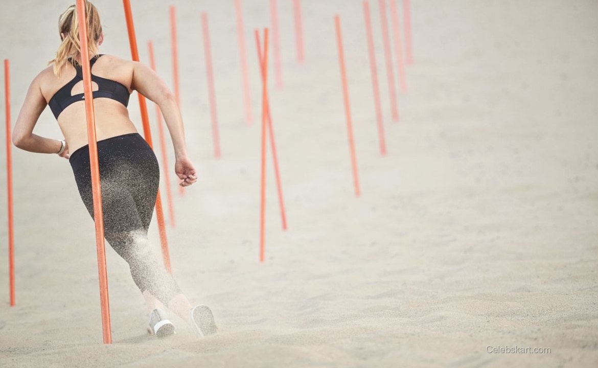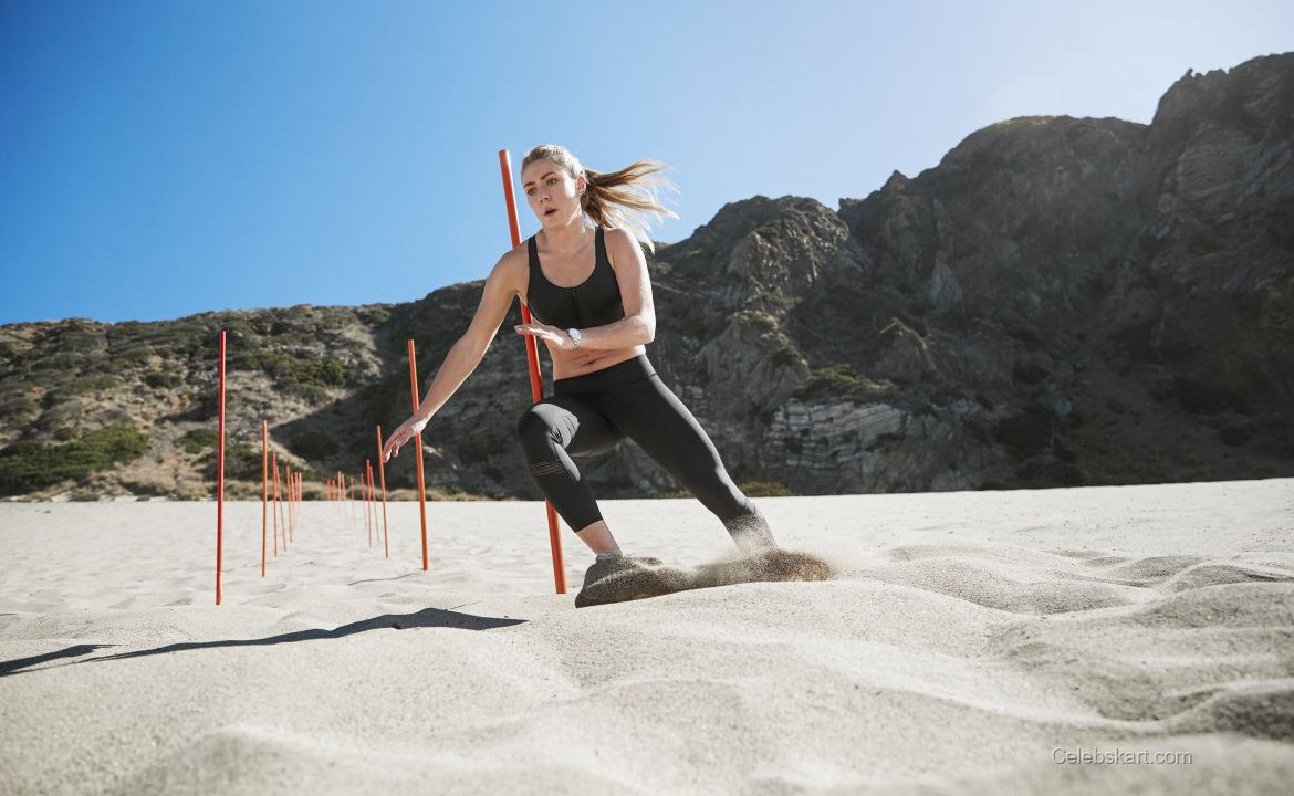 One iconic moment captures Mikaela hanging effortlessly from a pull-up bar, demonstrating both strength and style. The bright red of her outfit pops against the natural surroundings, drawing attention to her form as she focuses intently on her workout. Another engaging shot features her on a sandy beach, where she extends one arm upwards in a stretching pose, conveying both grace and power. Each shot emphasizes not only her athletic abilities but also the versatility of the Adidas Women’s SS20 Training Collection.