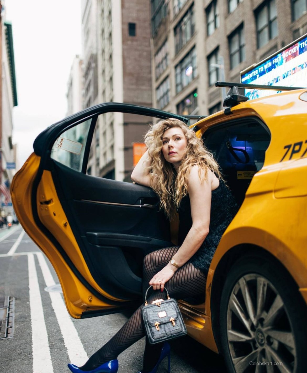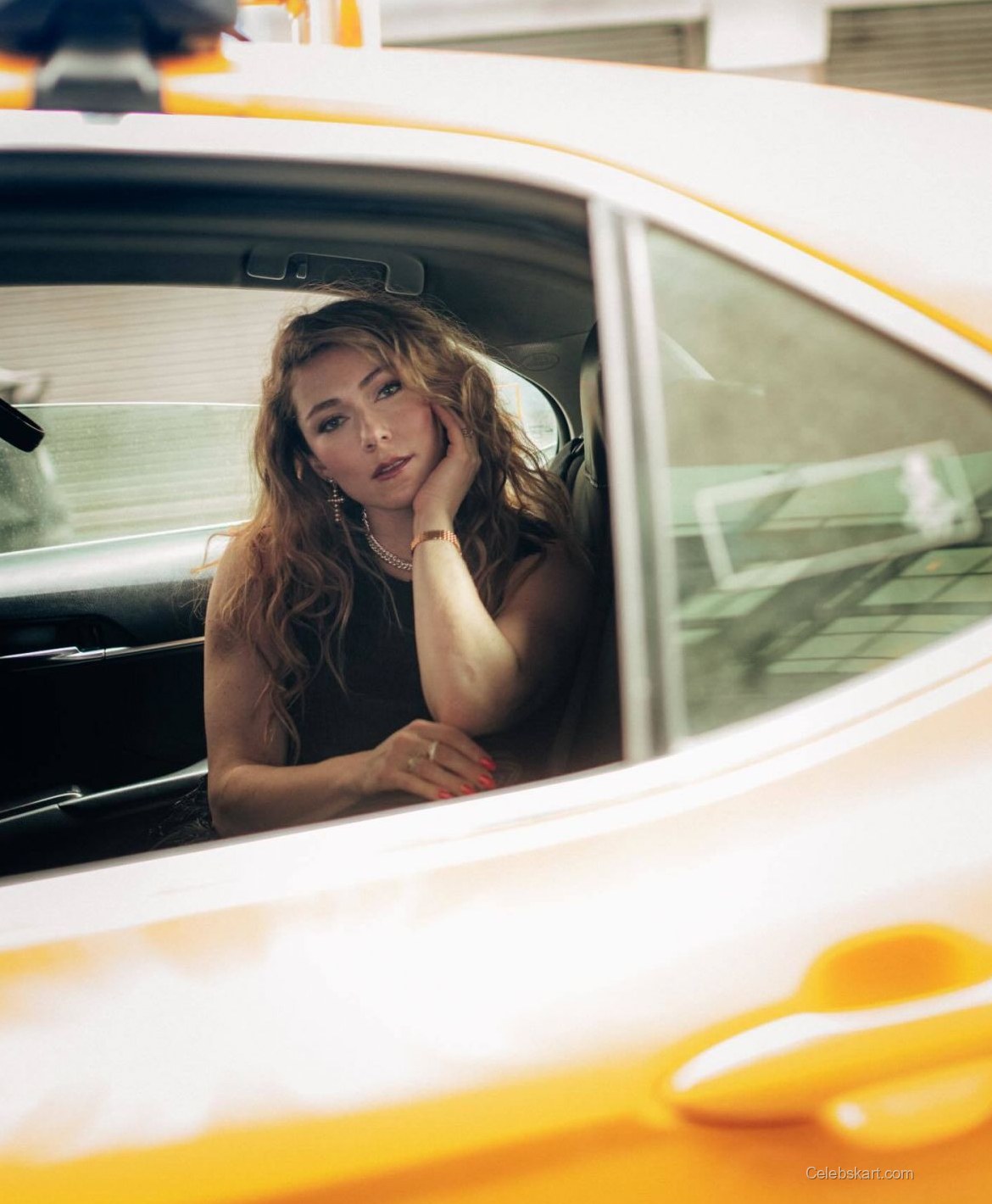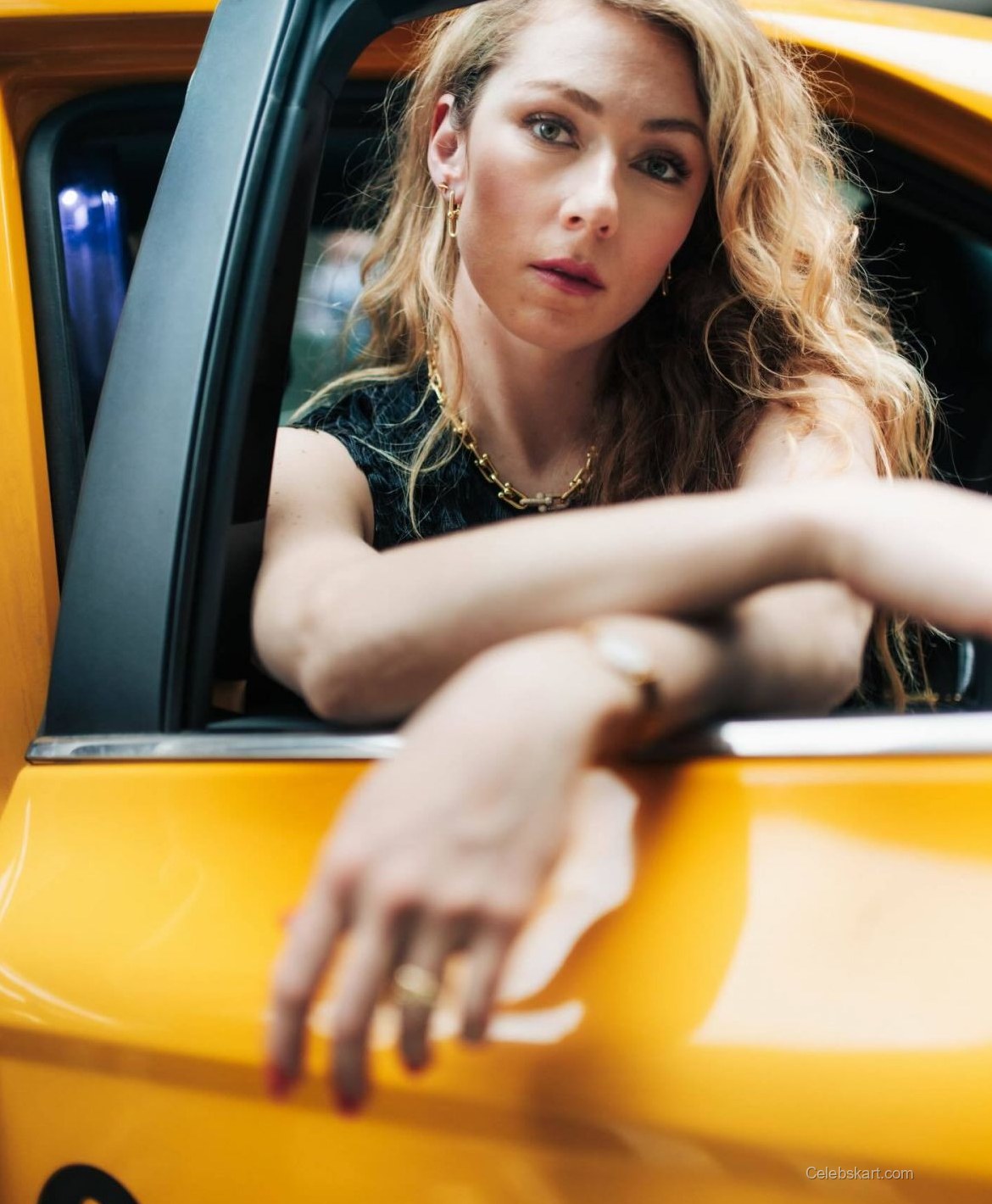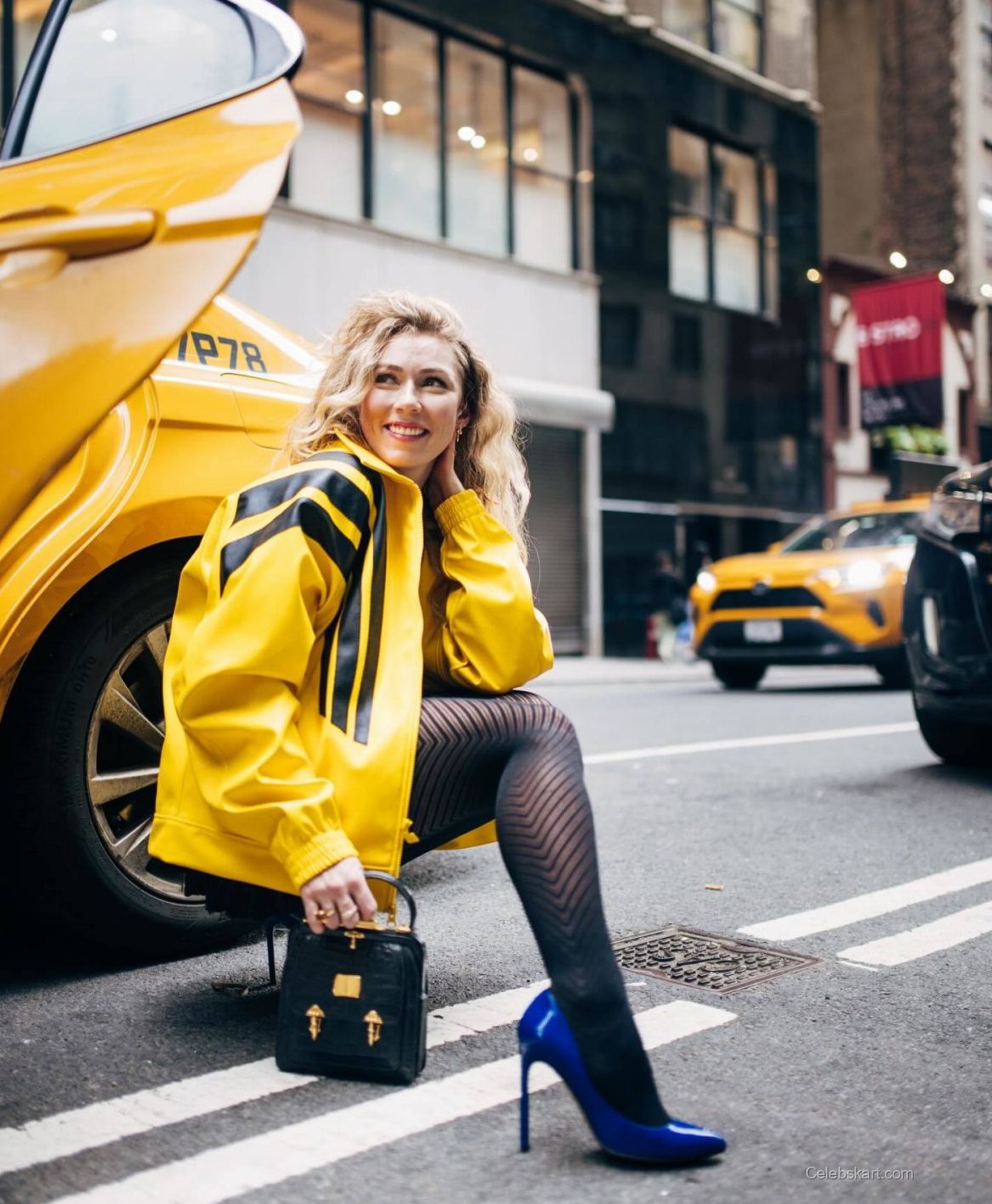 In one of the shots, Shiffrin can be seen leaning against a bright yellow taxi, her body angled playfully as she adjusts her jacket. With the bustling city in the background, it's a picture of dynamic contrast. Another moment captures her looking confidently at the camera, her hands gripping the jacket tightly, emphasizing her strength while showcasing her beautiful curls cascading down her shoulders. This playful yet powerful energy truly reflects her personality in this urban scene.
